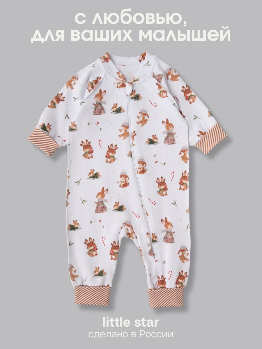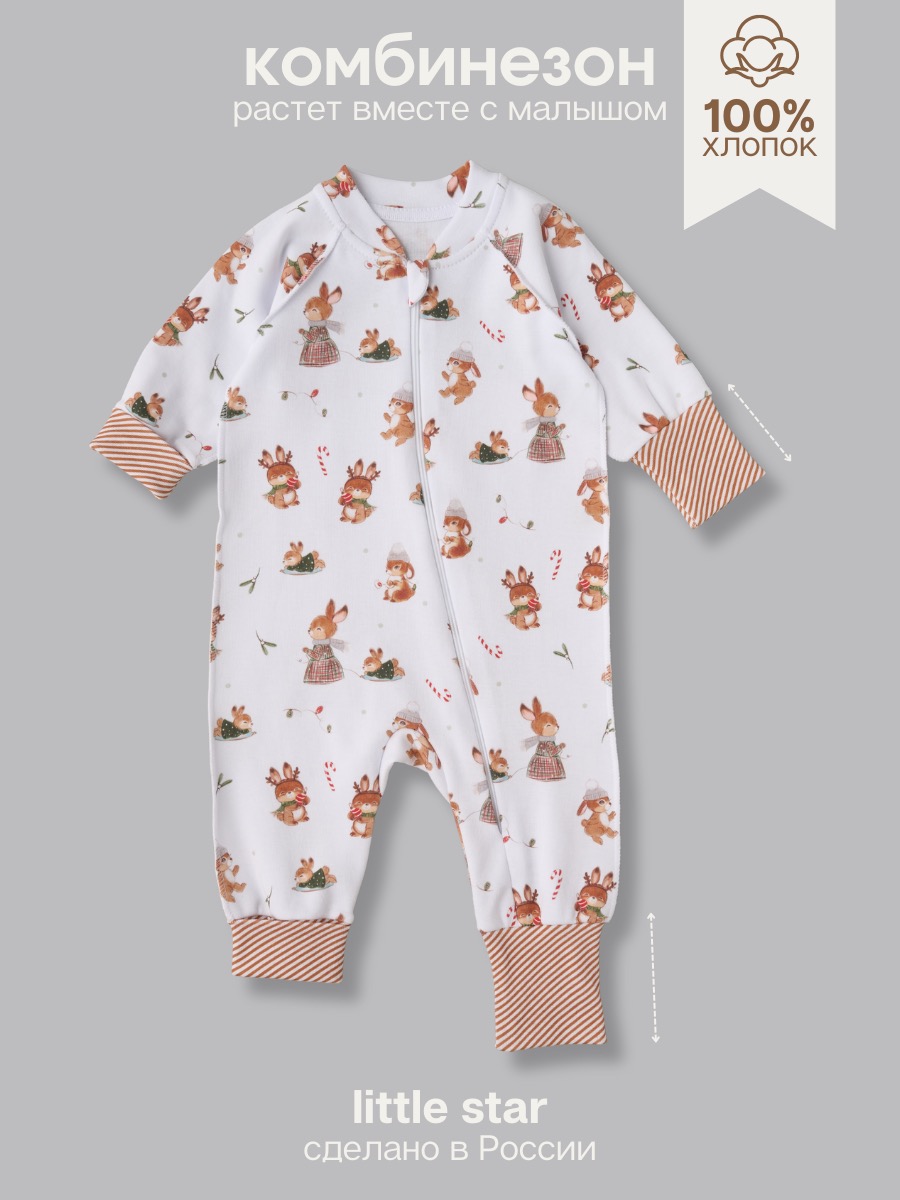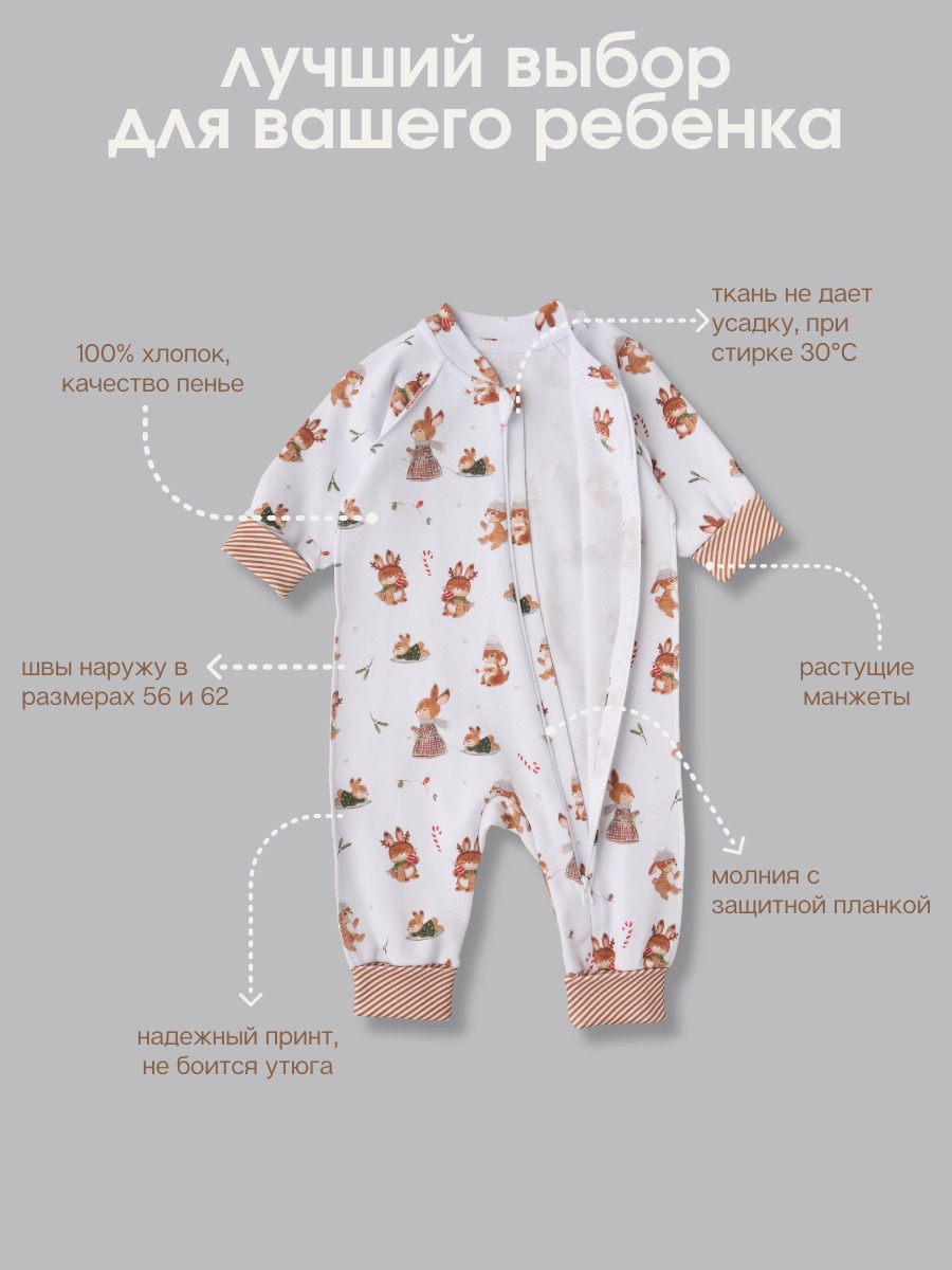 Растущий комбинезон на молнии из 100% хлопка — удобный детский комбинезон для новорождённых и малышей с мягкими удлинёнными манжетами. За счёт манжет комбинезон «растёт» и подходит сразу на 3 размера (ориентируйтесь по таблице размеров в карточке товара). Приятный к коже трикотаж, длинный рукав, центральная молния для быстрого переодевания, устойчивый принт.