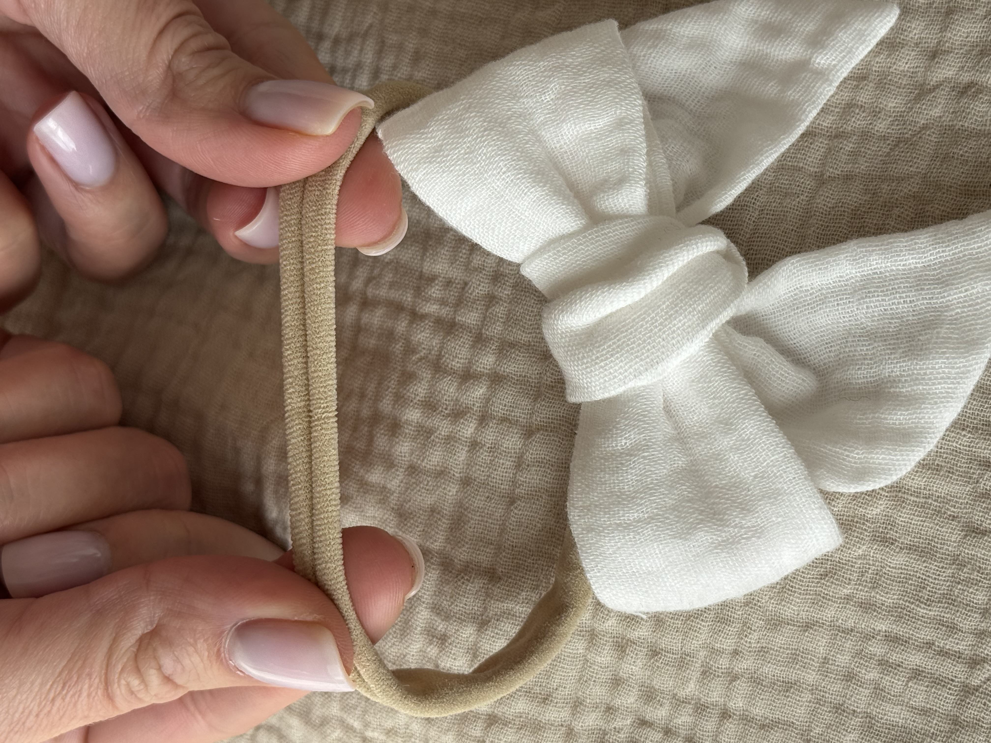 Муслиновый бантик на голову на мягкой резинке для праздничных образов с самого рождения. Очень нежная резинка не передавливает голову малыша, а муслиновый бантик очень нежен для кожи.