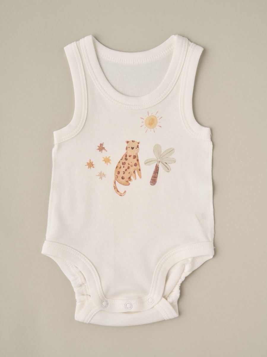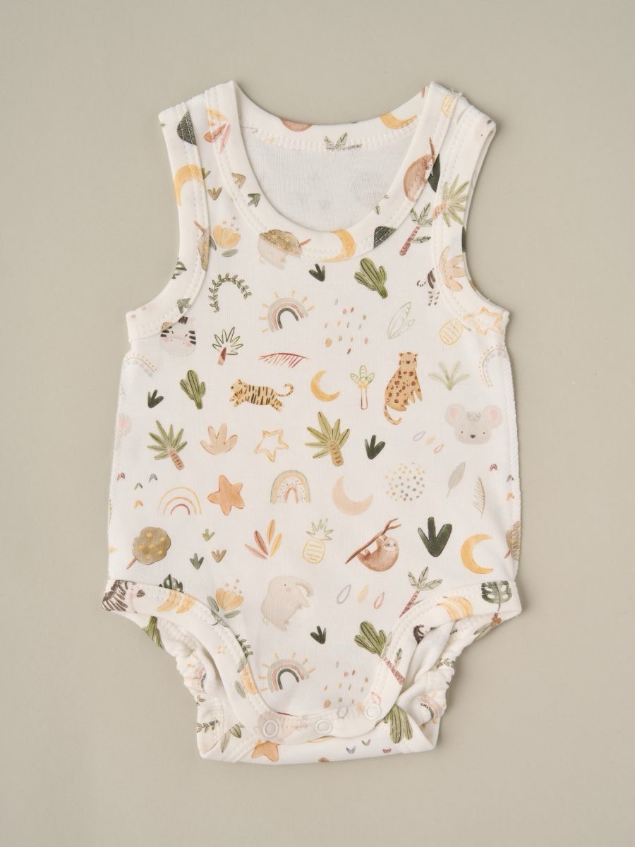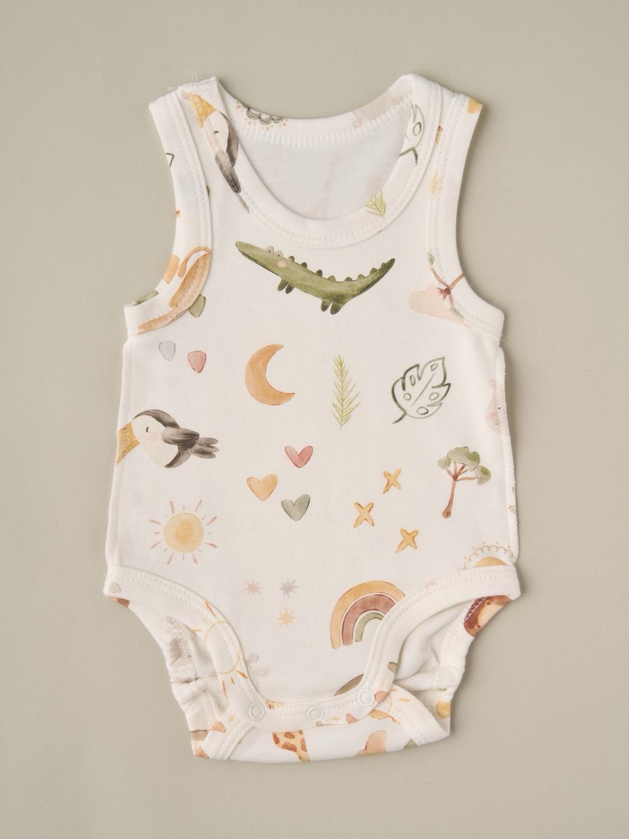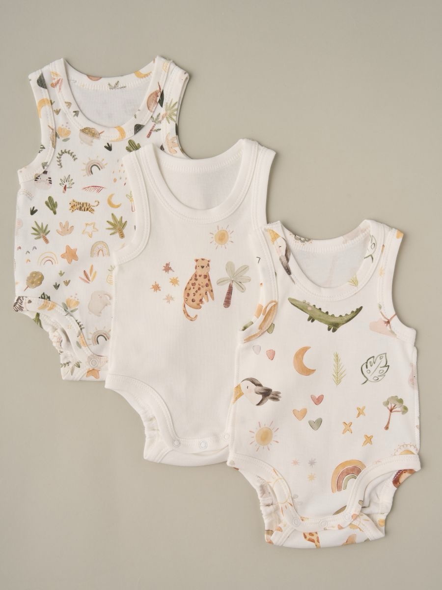 Набор боди с принтом, 3 шт в упаковке — мягкие детские боди из 100% хлопка. Удобные боди без рукавов с кнопками снизу для быстрой смены подгузника. Приятная к коже ткань, эластичные края по ножкам, аккуратные швы. Универсальные боди для новорождённых и малышей: однотонный вариант и боди с принтами животных/природы.