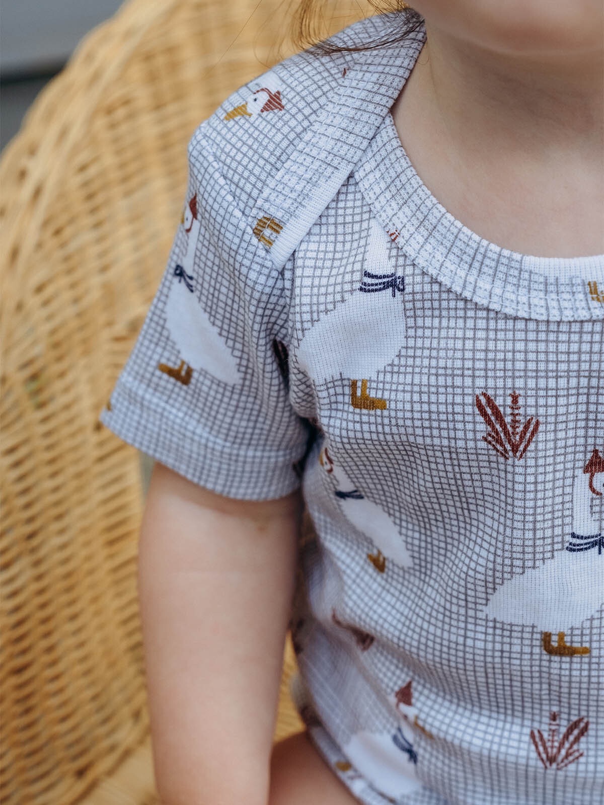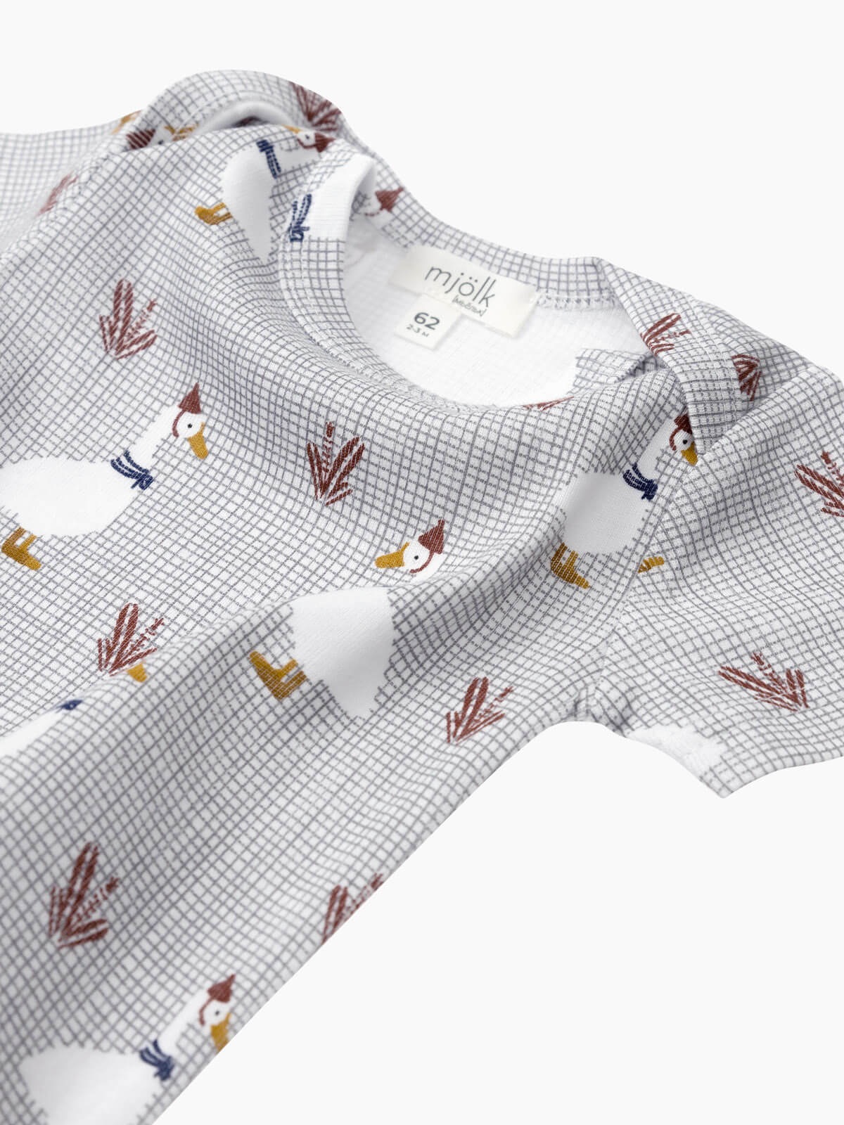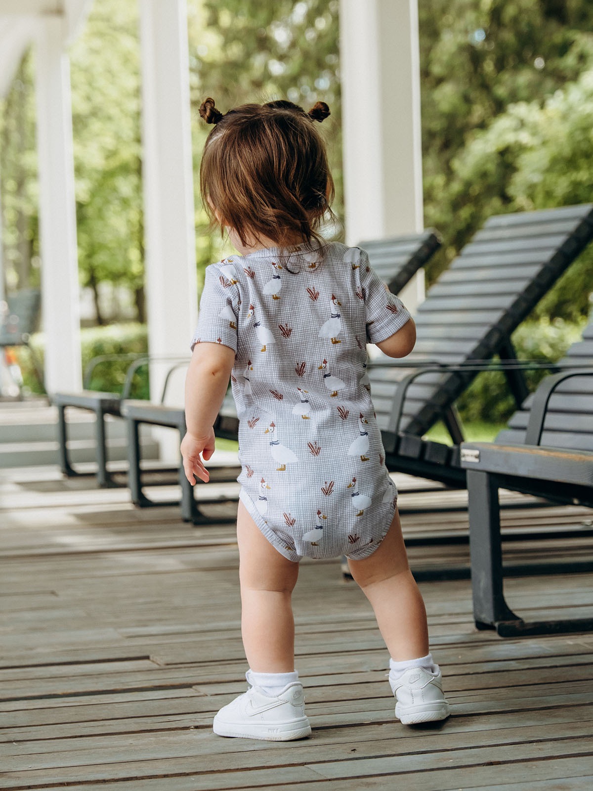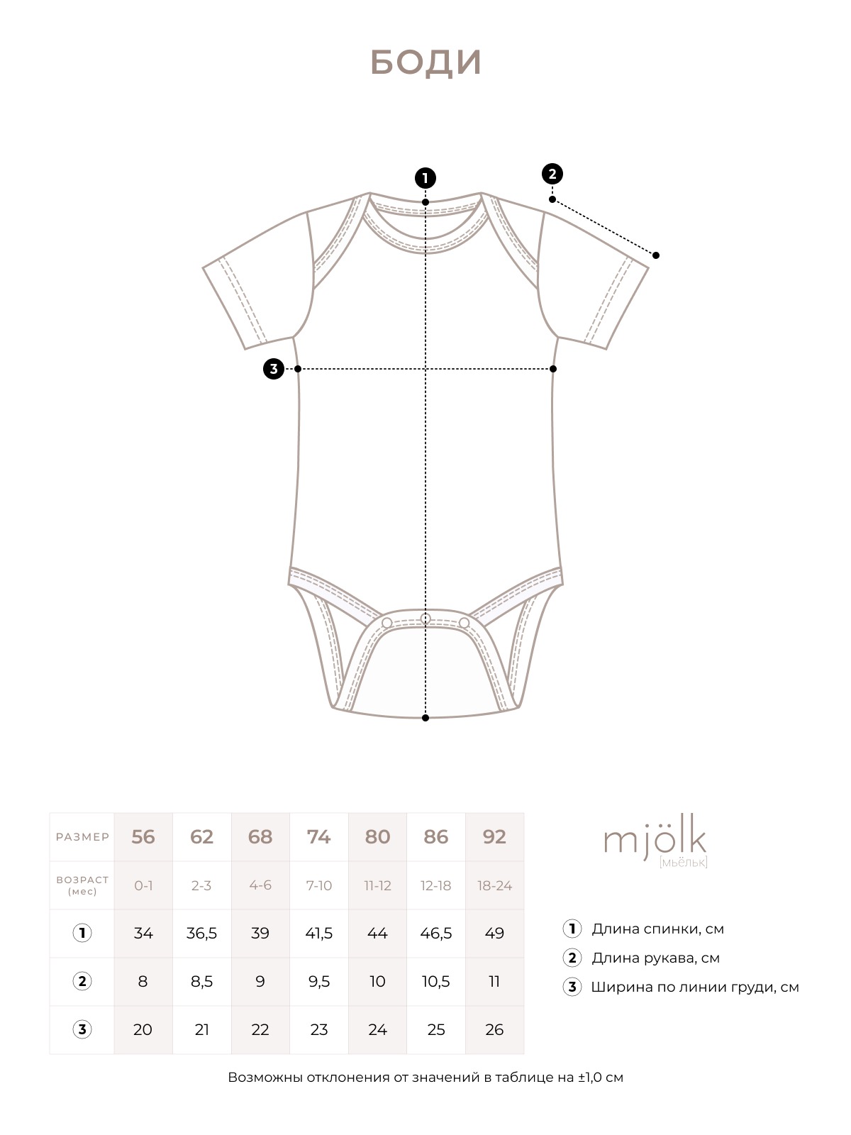 Боди Mjölk [мьёльк] растягивается по фигуре, ребёнку в нём не жарко, он не потеет. В такой одежде можно играть и спать круглый год, поддевать её под комбинезон или спальный мешок. Материал приятный на ощупь, эластичный, гигроскопичный, дышит и не вызывает аллергии. Кнопки расположены значительно выше их привычного месторасположения, что облегчает застёгивание изделия на малыше.