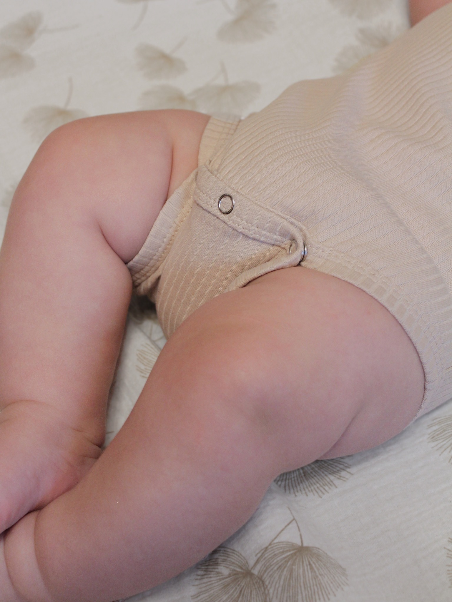 Молния изнутри защищена тканевой планкой и не соприкасается с нежной кожей малыша, на вороте у шеи и на бедре дополнительно нашит трикотажный язычок. Он закрывает бегунок и не даёт застёжке раскрыться.