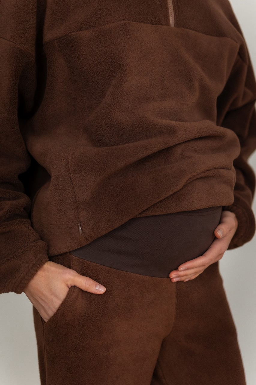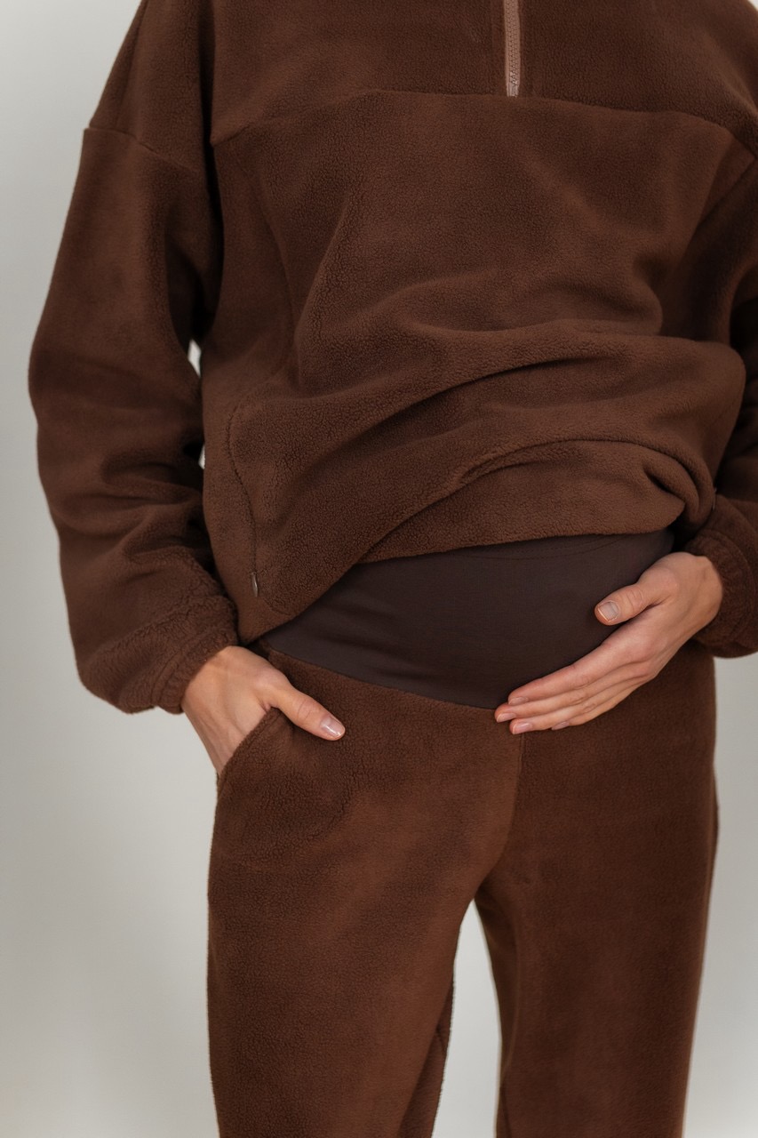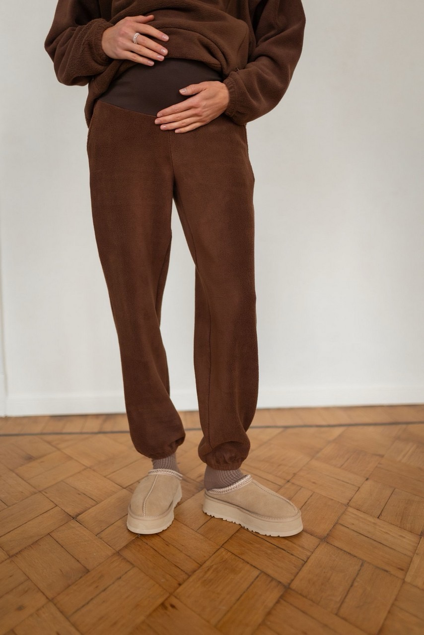 Стильные утепленные брюки для беременных из плотного, двухстороннего, трикотажного полотна. Пушистый ворс напоминающий флис с лицевой стороны и гладкая, хлопковая, сторона к телу. Ткань хорошо сохраняет тепло, устойчива к деформациям.