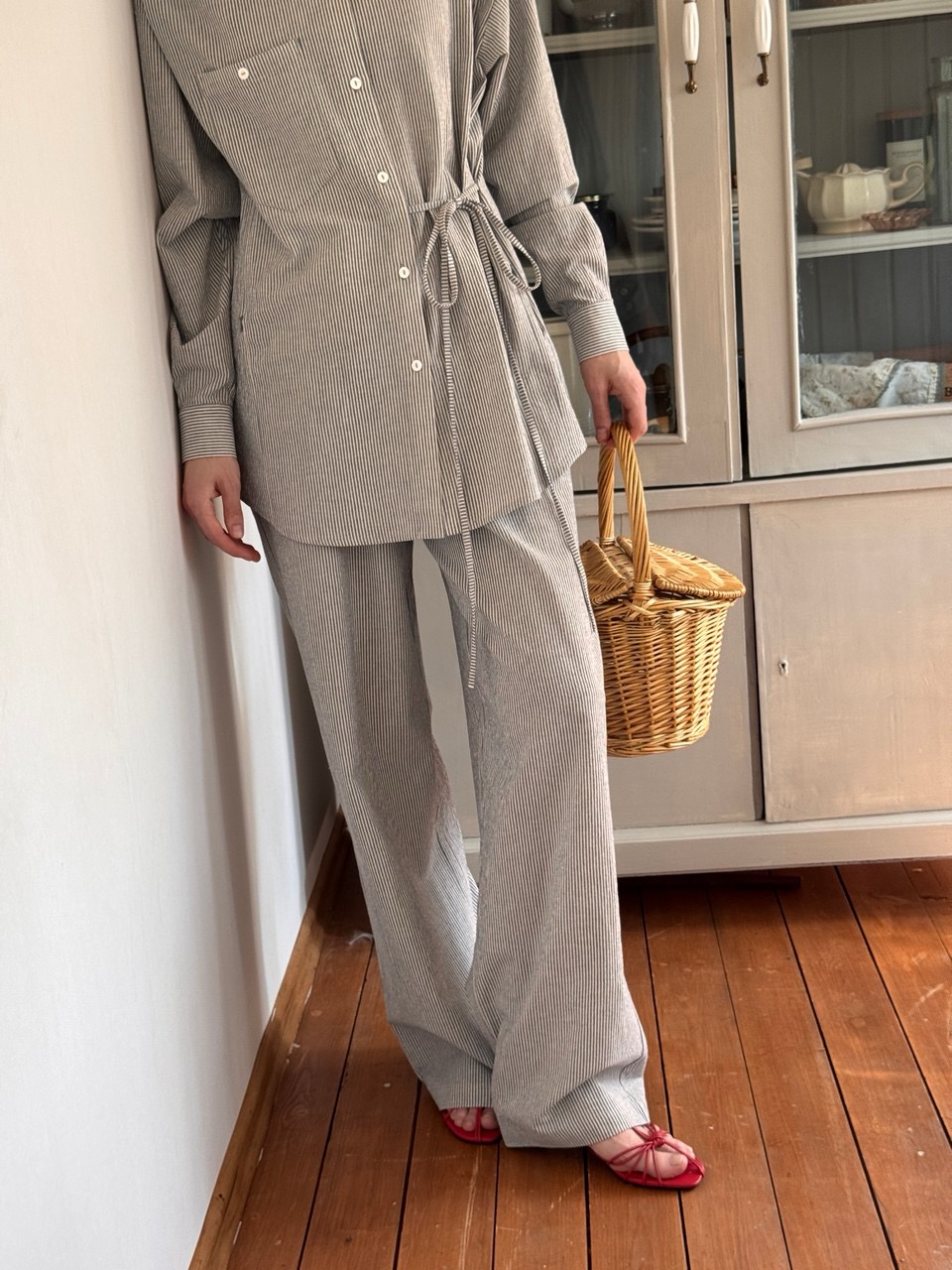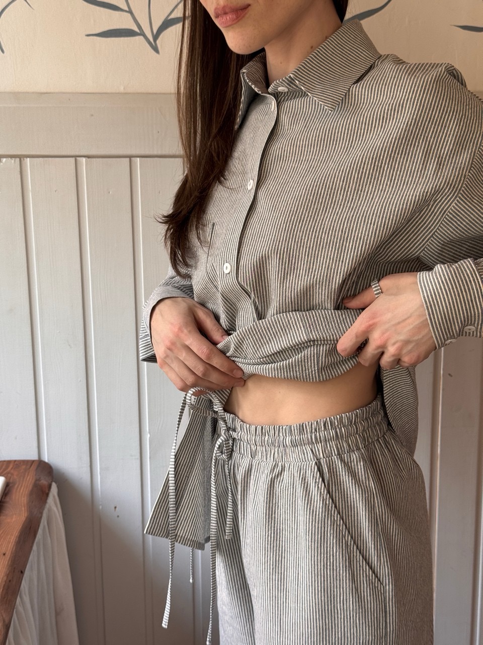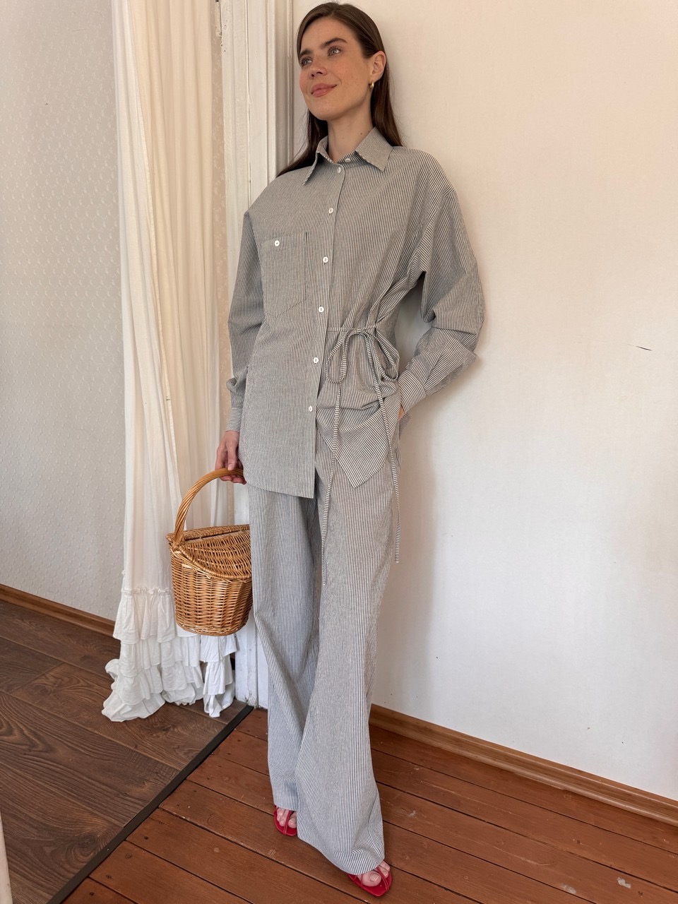 Самые модные брюки этого лета - брюки в пижамном стиле из хлопка в полоску. Сочетайте их с футболкой или соберите невероятно эффектный костюм из нашей коллекции: брюки, топ и рубашку. Капсула выполнена из вареного хлопка, который практически не нуждается в глажке. Обратите внимание, после стирки ткань дает небольшую усадку в длину и ширину - не покупайте изделие впритык по размеру и соблюдайте рекомендации по стирке.