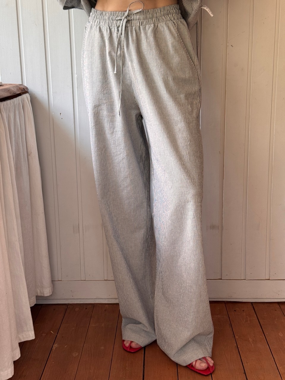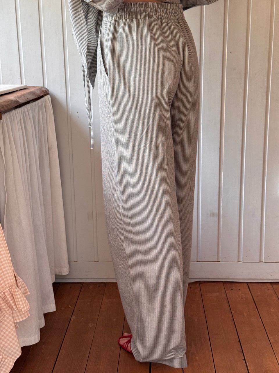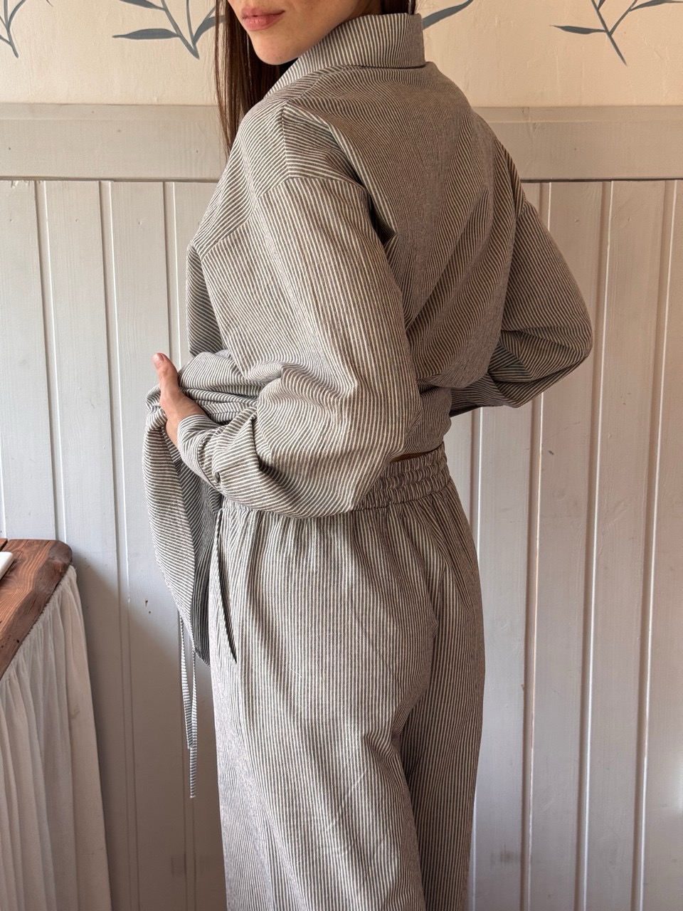 Самые модные брюки этого лета - брюки в пижамном стиле из хлопка в полоску. Сочетайте их с футболкой или соберите невероятно эффектный костюм из нашей коллекции: брюки, топ и рубашку. Капсула выполнена из вареного хлопка, который практически не нуждается в глажке. Обратите внимание, после стирки ткань дает небольшую усадку в длину и ширину - не покупайте изделие впритык по размеру и соблюдайте рекомендации по стирке.