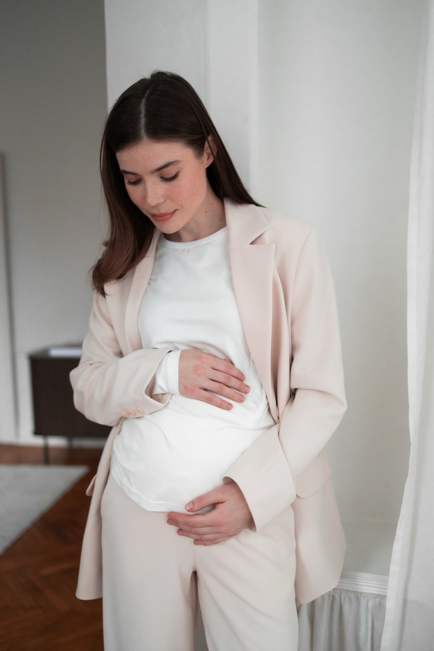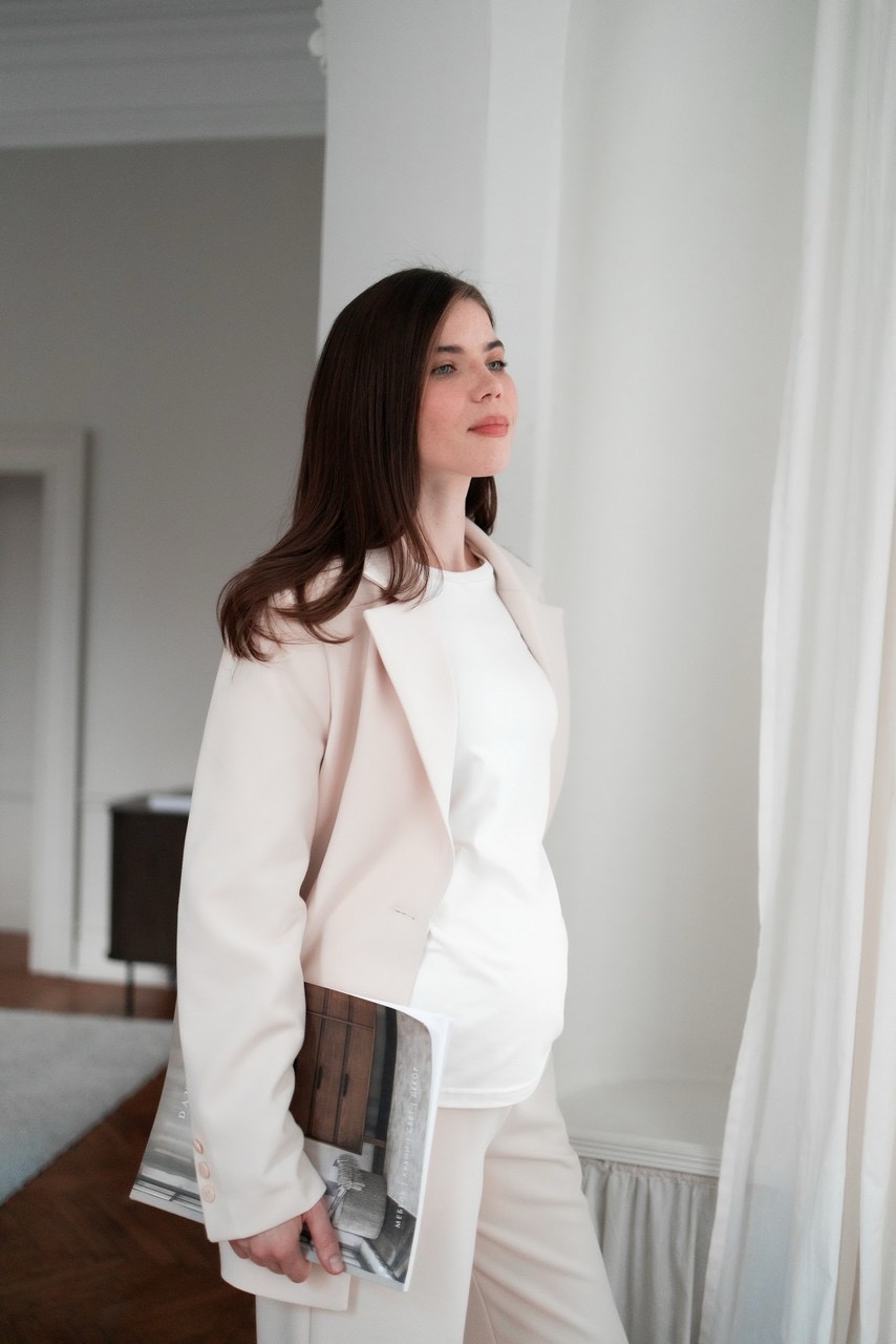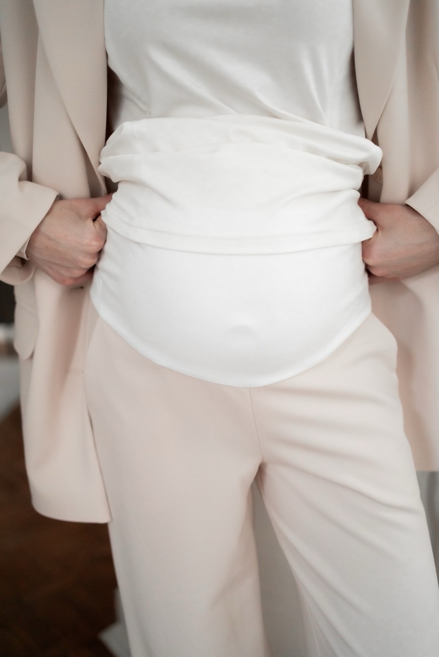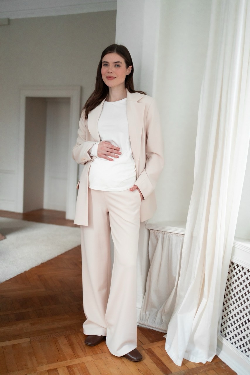 Шикарные брюки Soul для будущих мам из плотной, приятной на ощупь итальянской вискозы. Манжета для животика мягкая, упругая, хлопковая. Благодаря резинкам-утяжкам вы можете регулировать степень свободы брюк над и под животом. Мы сделали манжету на кремовых брюках максимально светлой, чтобы вы могли эффектно носить их с белыми футболками и манжета не просвечивала. Идеальная пара к брюкам - жакет Soul свободной посадки, вниз можно поддеть футболку или базовый лонгслив.