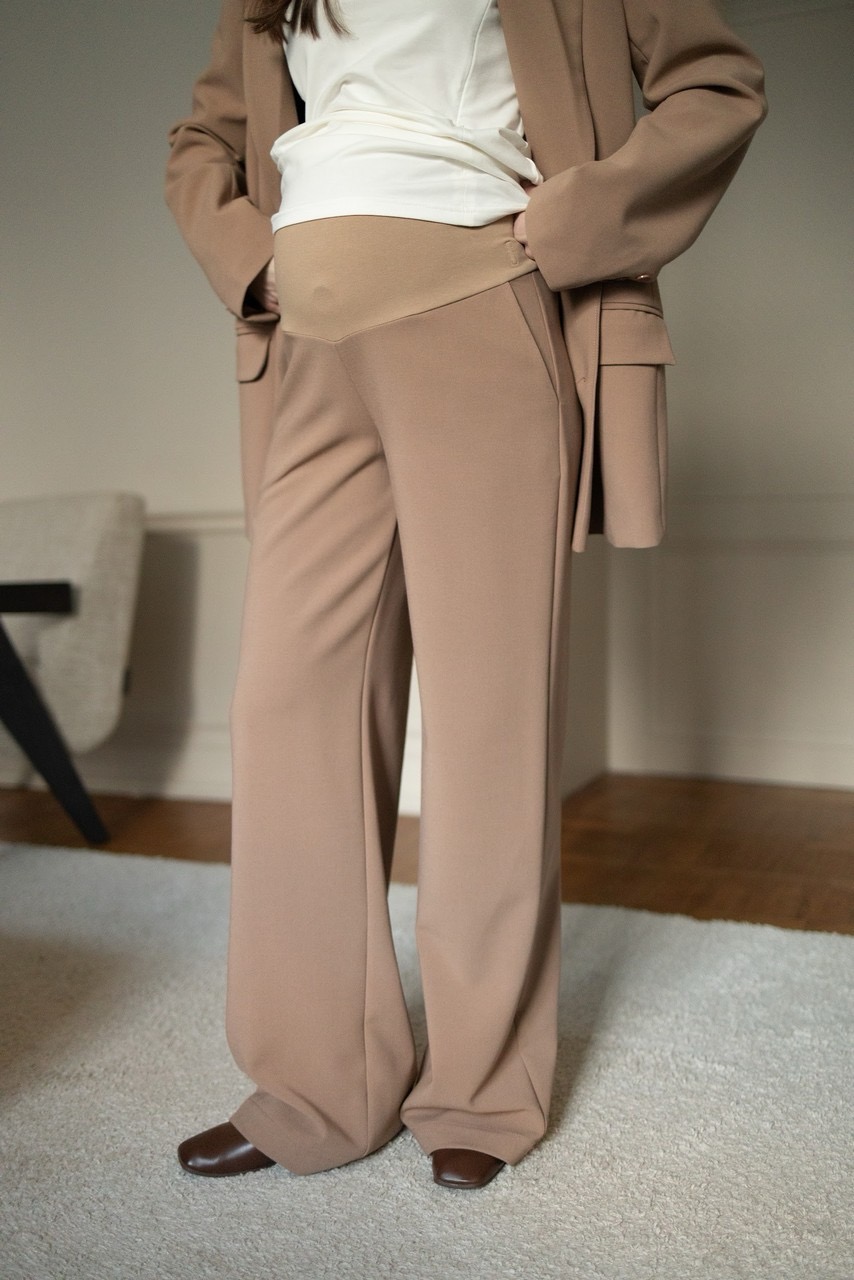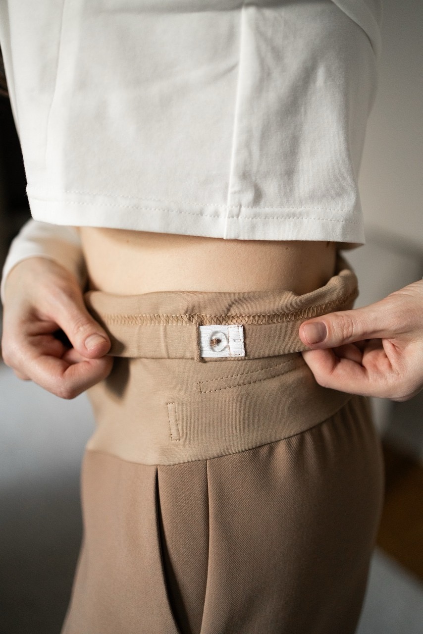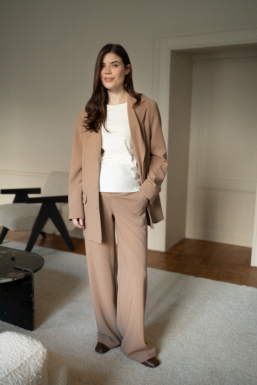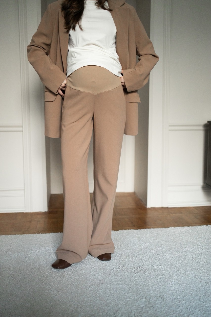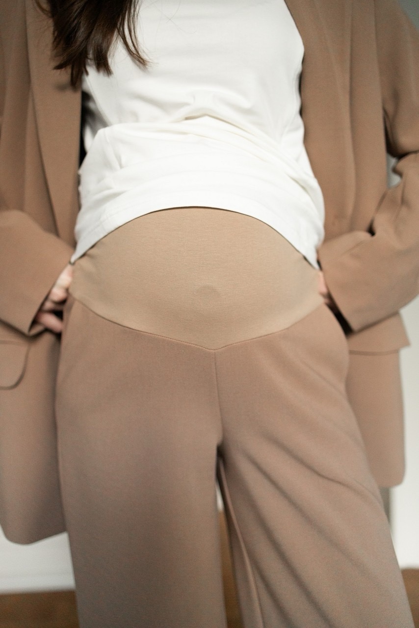 Шикарные брюки Soul для будущих мам  из плотной, приятной на ощупь итальянской вискозы. Манжета для животика мягкая, упругая, хлопковая. Благодаря резинкам-утяжкам вы можете регулировать степень свободы брюк над и под животом. Мы сделали манжету на кремовых брюках максимально светлой, чтобы вы могли эффектно носить их с белыми футболками и манжета не просвечивала. Идеальная пара к брюкам - жакет Soul свободной посадки, вниз можно поддеть футболку или базовый лонгслив.