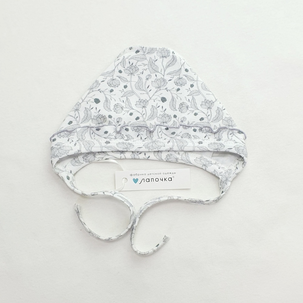 Чепчик из мягкого трикотажа с нежным цветочным принтом. Модель с завязками, плотно прилегает и закрывает ушки. Подходит для дома, сна и прогулок, удобен как первый слой под верхнюю шапку.