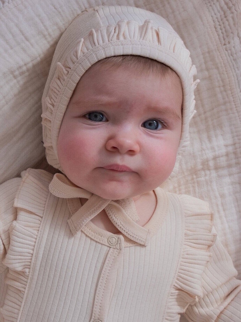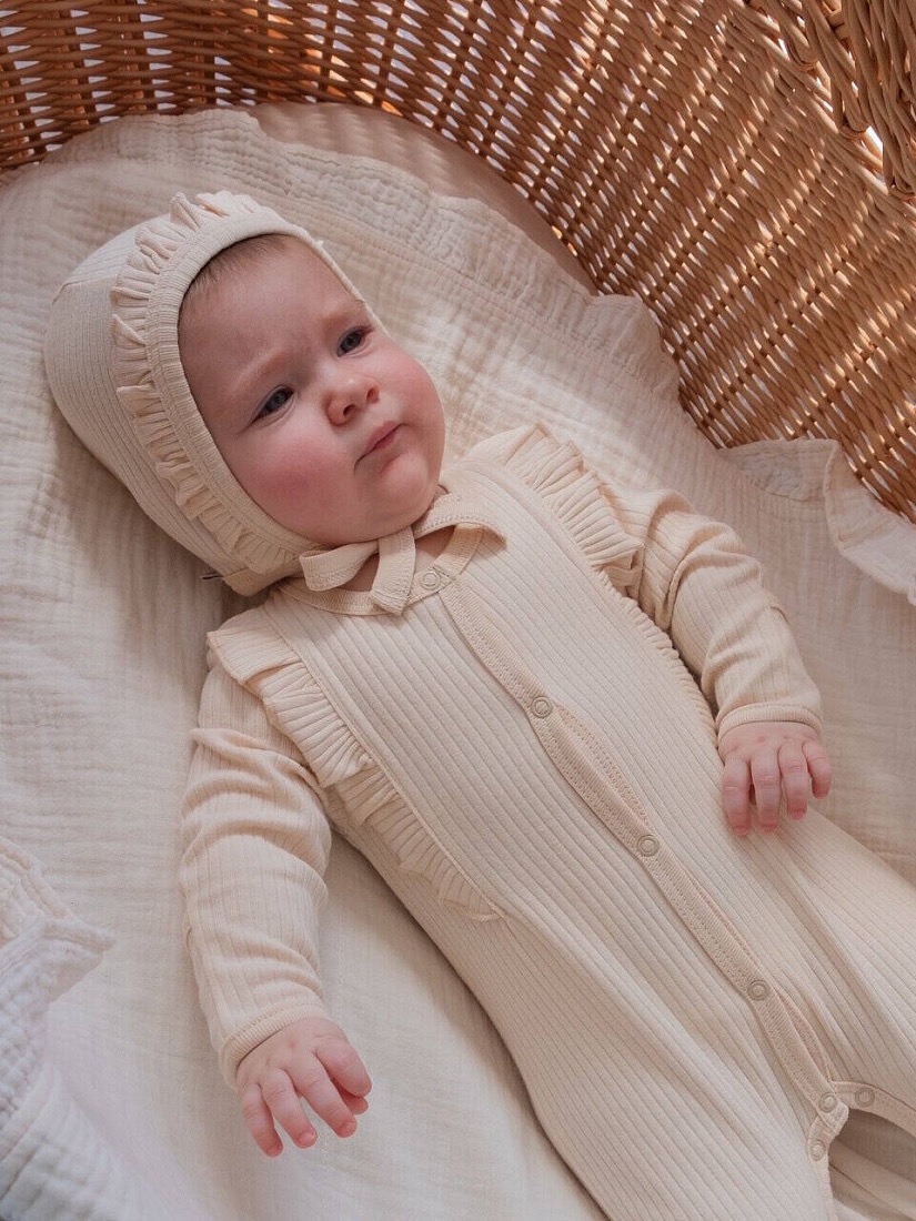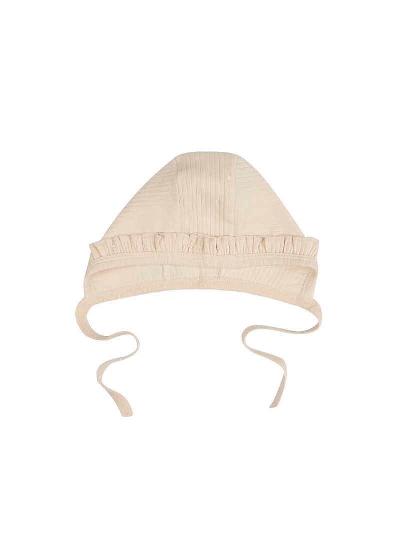 Нежный чепчик из мягкого рубчатого трикотажа в молочном оттенке – идеальное дополнение к слипу из этой же коллекции. Аккуратные рюши по краю красиво обрамляют личико малыша и придают образу трогательную «винтажную» нотку.
