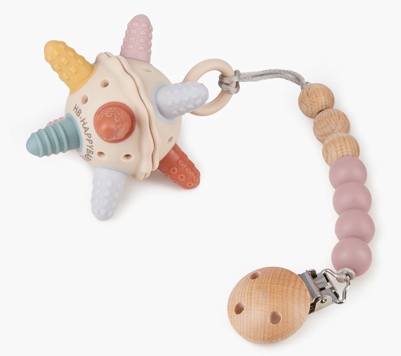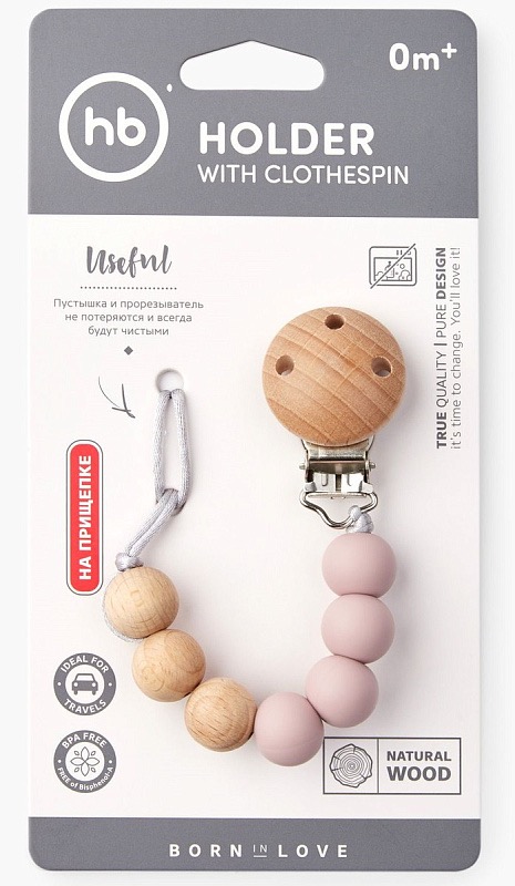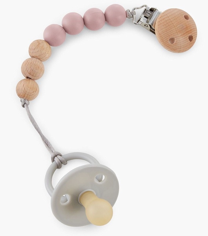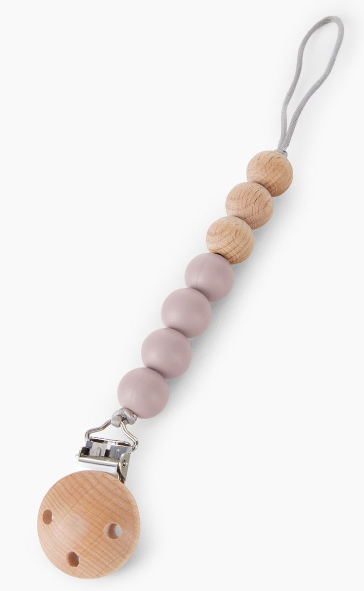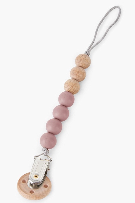 Держатель с бусинками из мягкого силикона, натурального дерева и с надёжным креплением-прищепкой - теперь вы можете быть уверены, что пустышка или прорезыватель не потеряются и всегда будут чистыми.