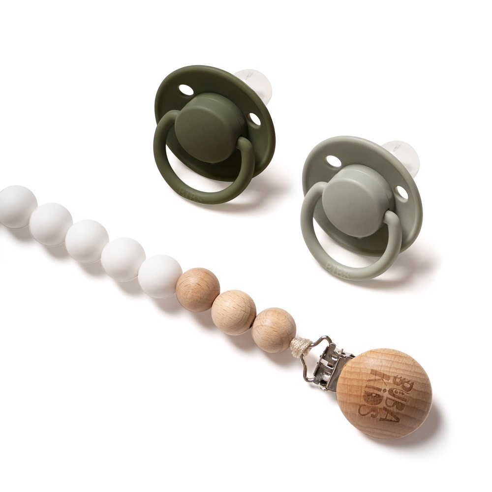 Держатель подходит для всех видов пустышек – как с ручкой (например, BIBS Colour/Boheme/DeLux), так и без ручки (BIBS Couture/Supreme/Infinity). В комплекте c держателем есть силиконовое колечко, которое используется для крепления пустышки без ручки.