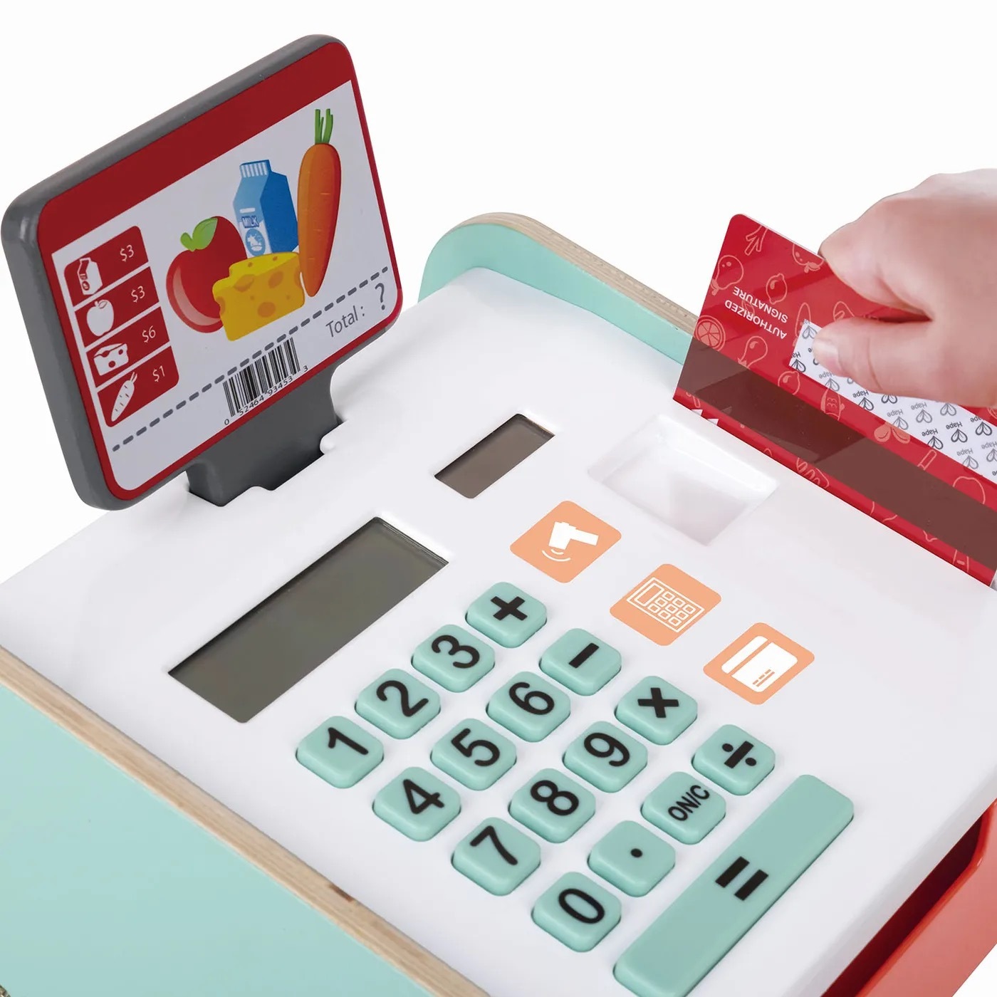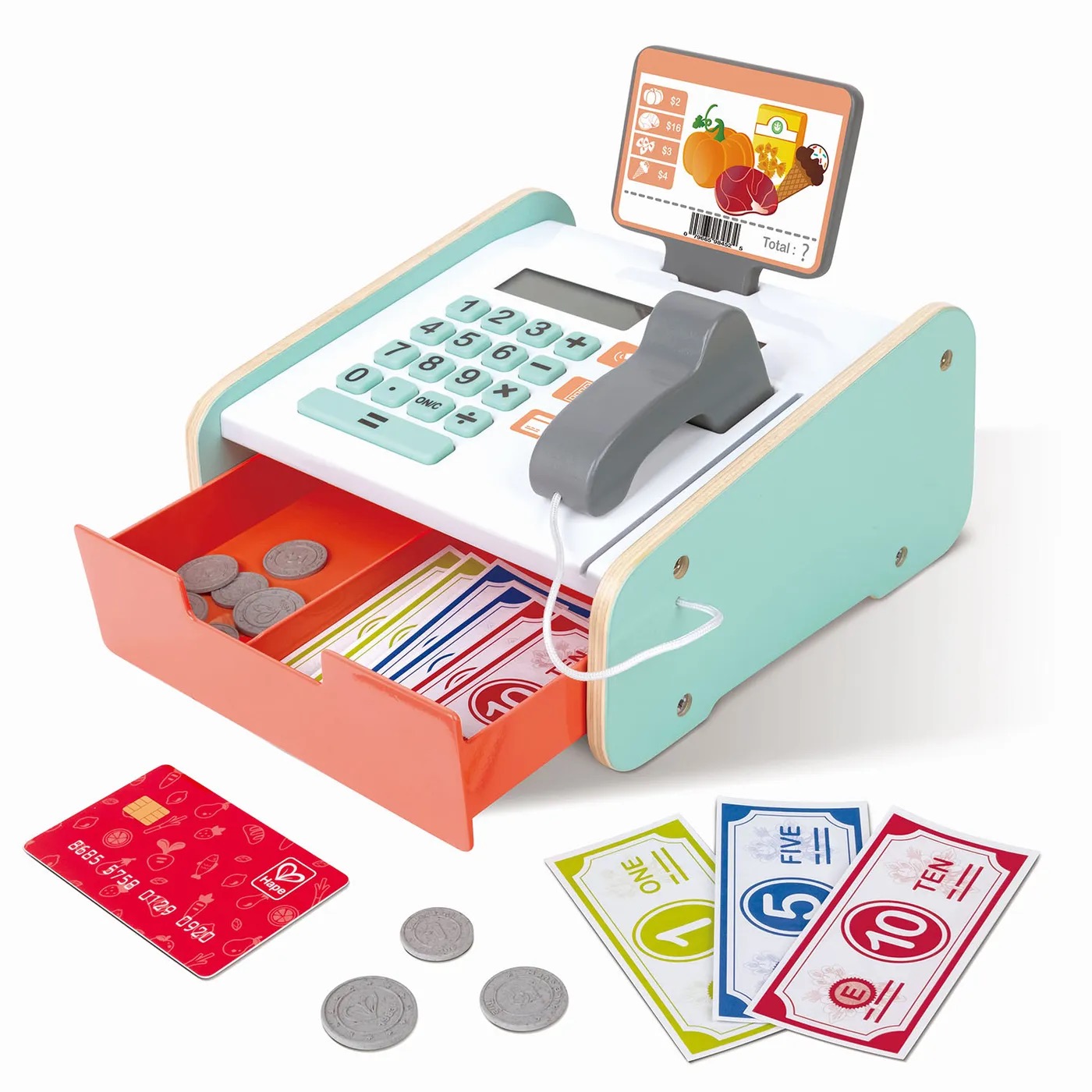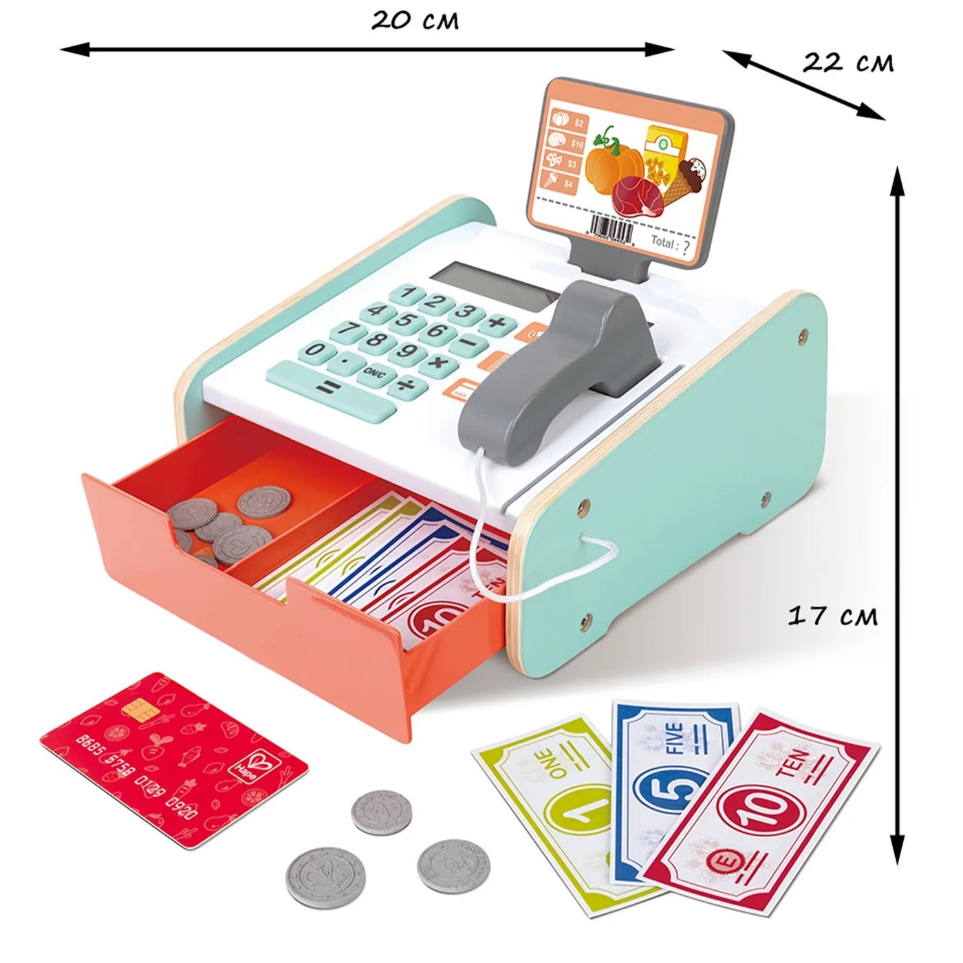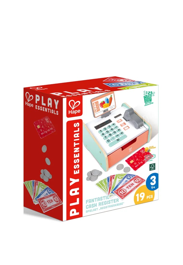 Наша касса бренда HAPE с деньгами выполнена из натурального дерева, без острых углов, применены гиппоаллергенные краски приятных цветовых оттенков.
