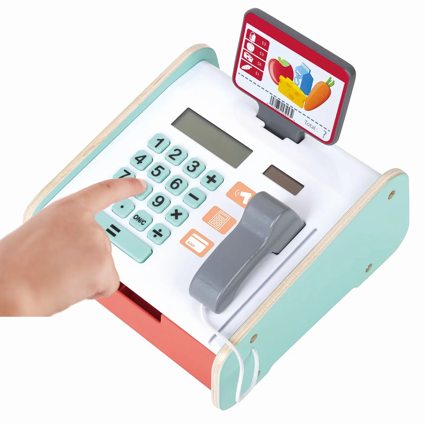 С нашей кассой дети могут разыгрывать различные сценарии: устанавливать цены на продукты, называть их покупателю, покупать игрушечные продукты, взвешивать товар, пробивать его на кассе и расплачиваться игрушечными деньгами или пластиковой картой.