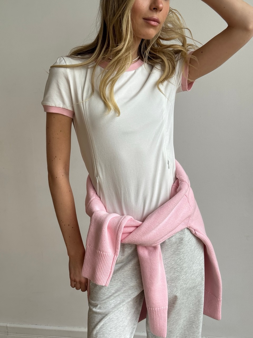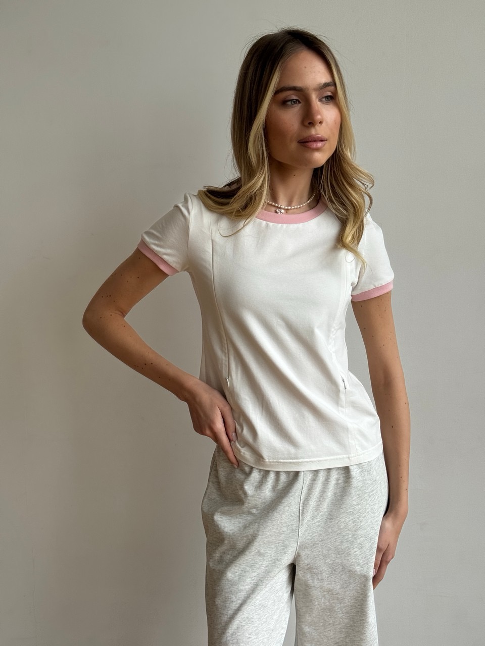 Универсальная футболка с круглым вырезом и контрастной отделкой. Полуприлегающий крой подойдет для любого типа фигуры. Удобные секреты позволят незаметно покормить малыша. Молнии легко расстегиваются и застегиваются, что сделает процесс кормления легким и комфортным для мамы и малыша.