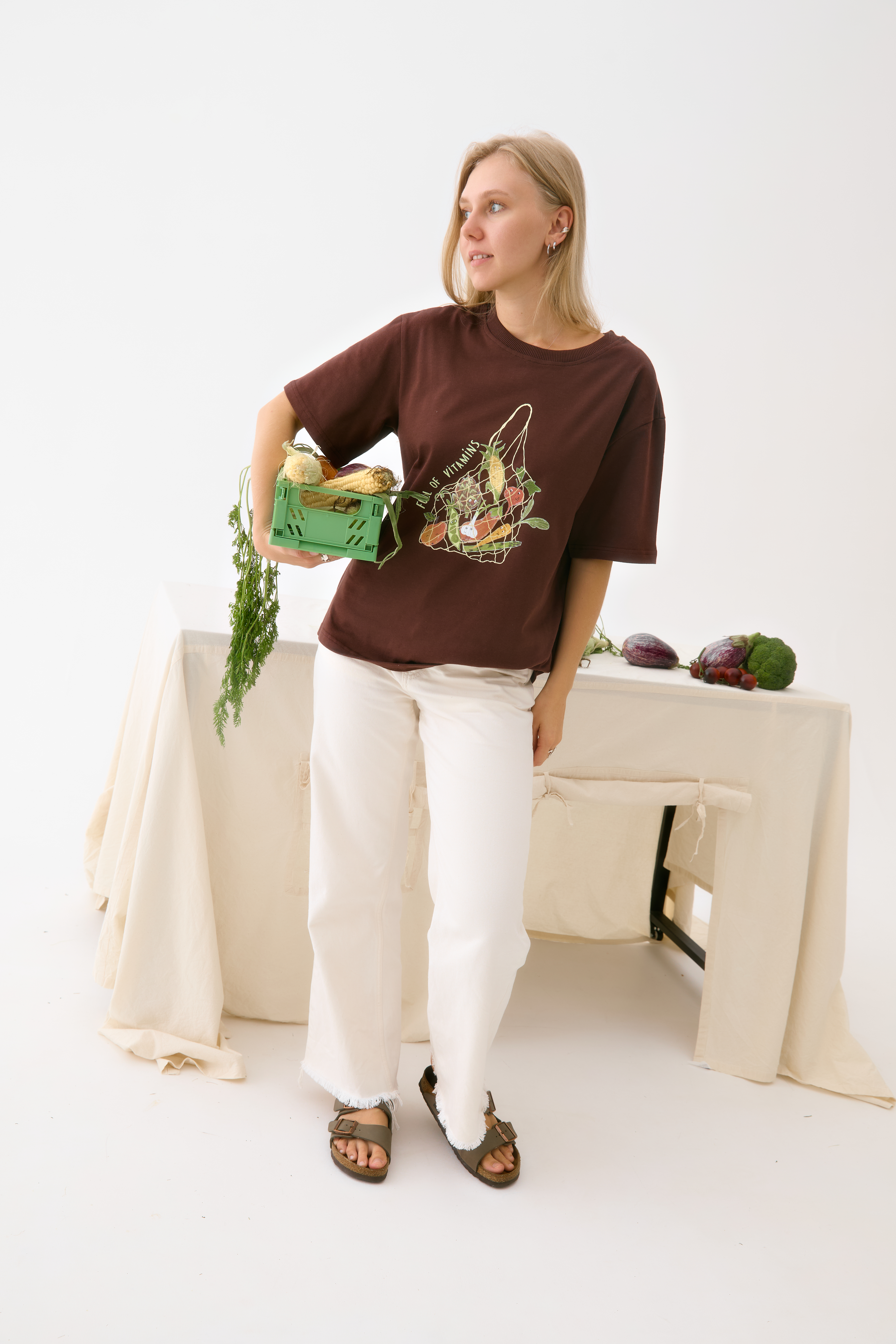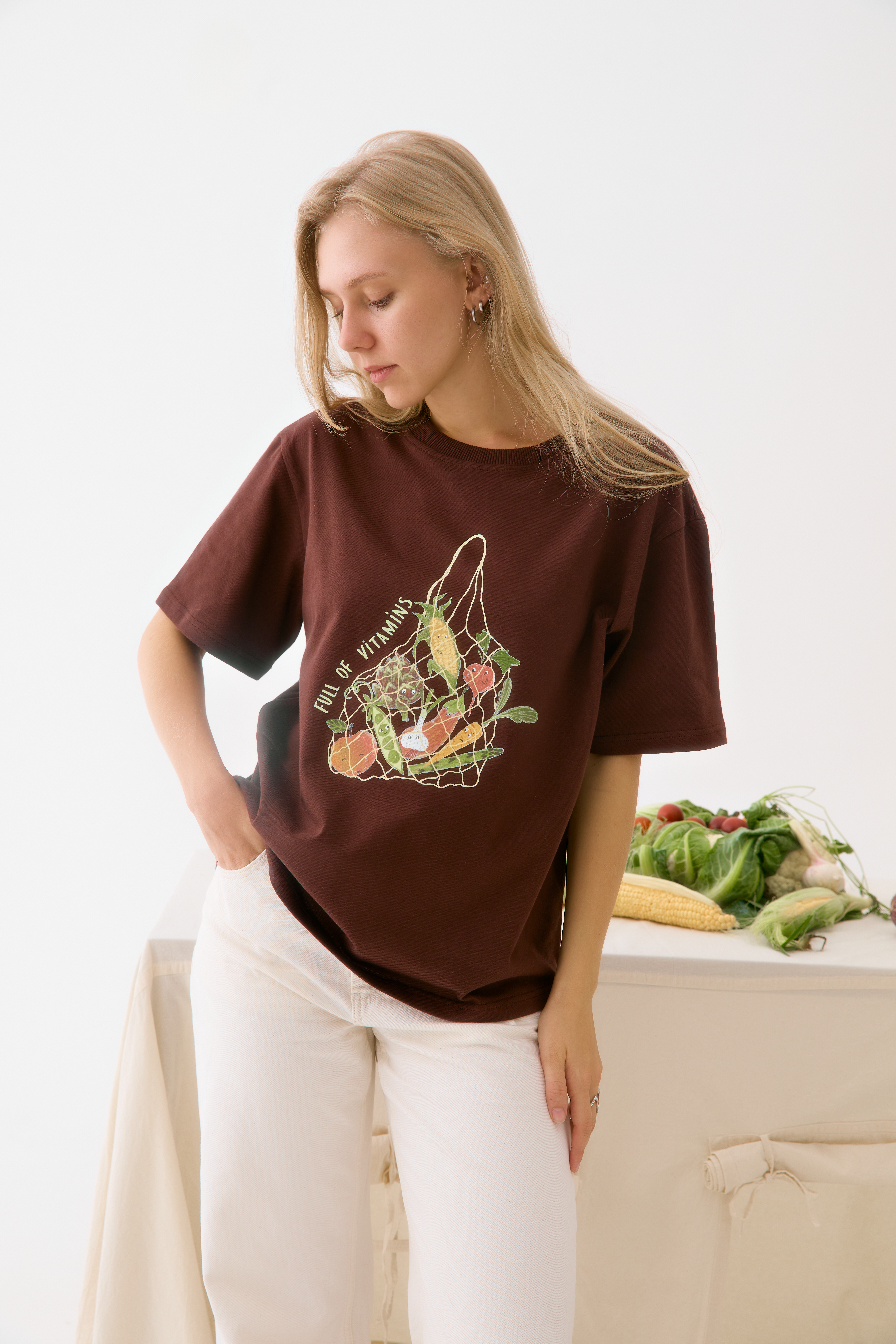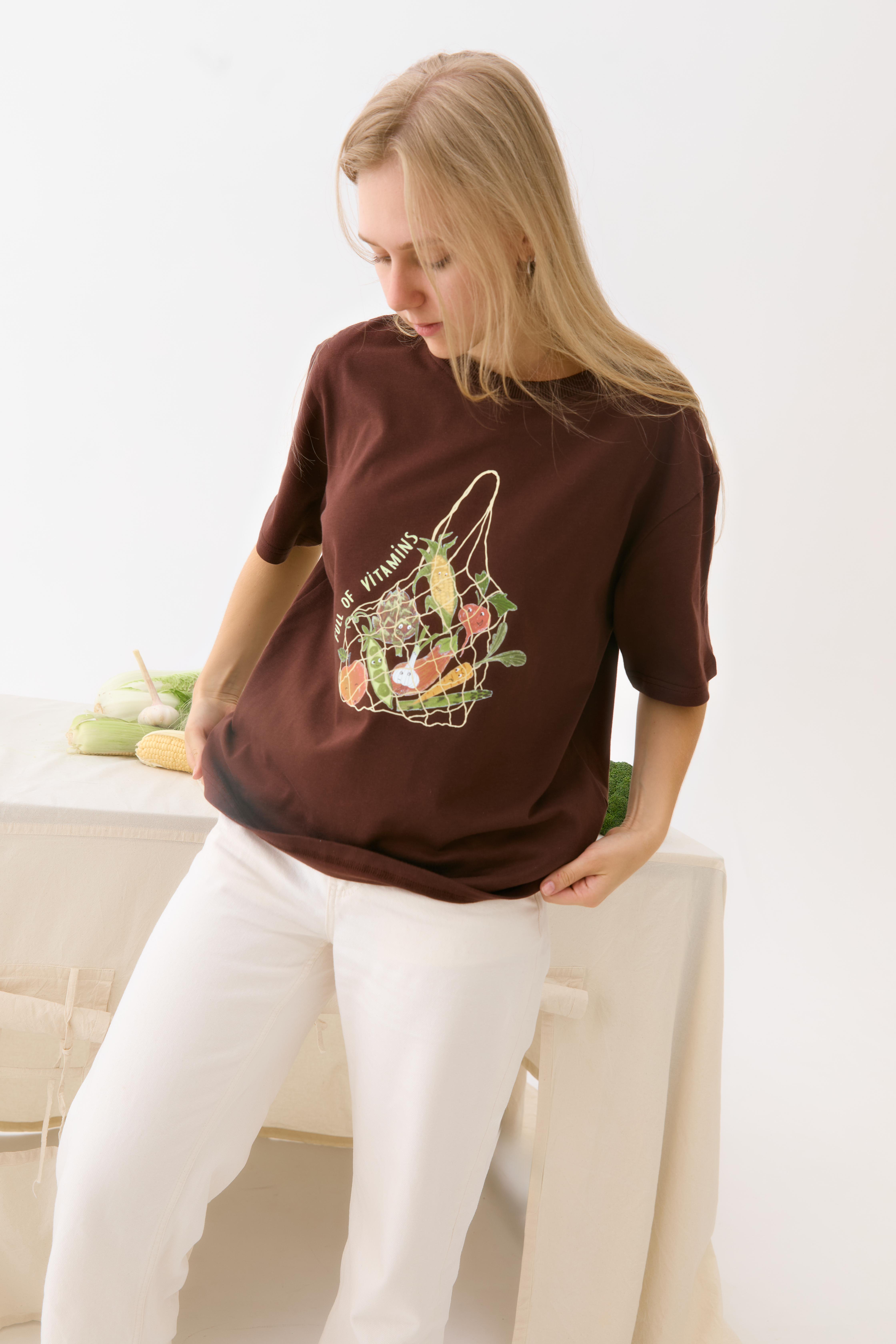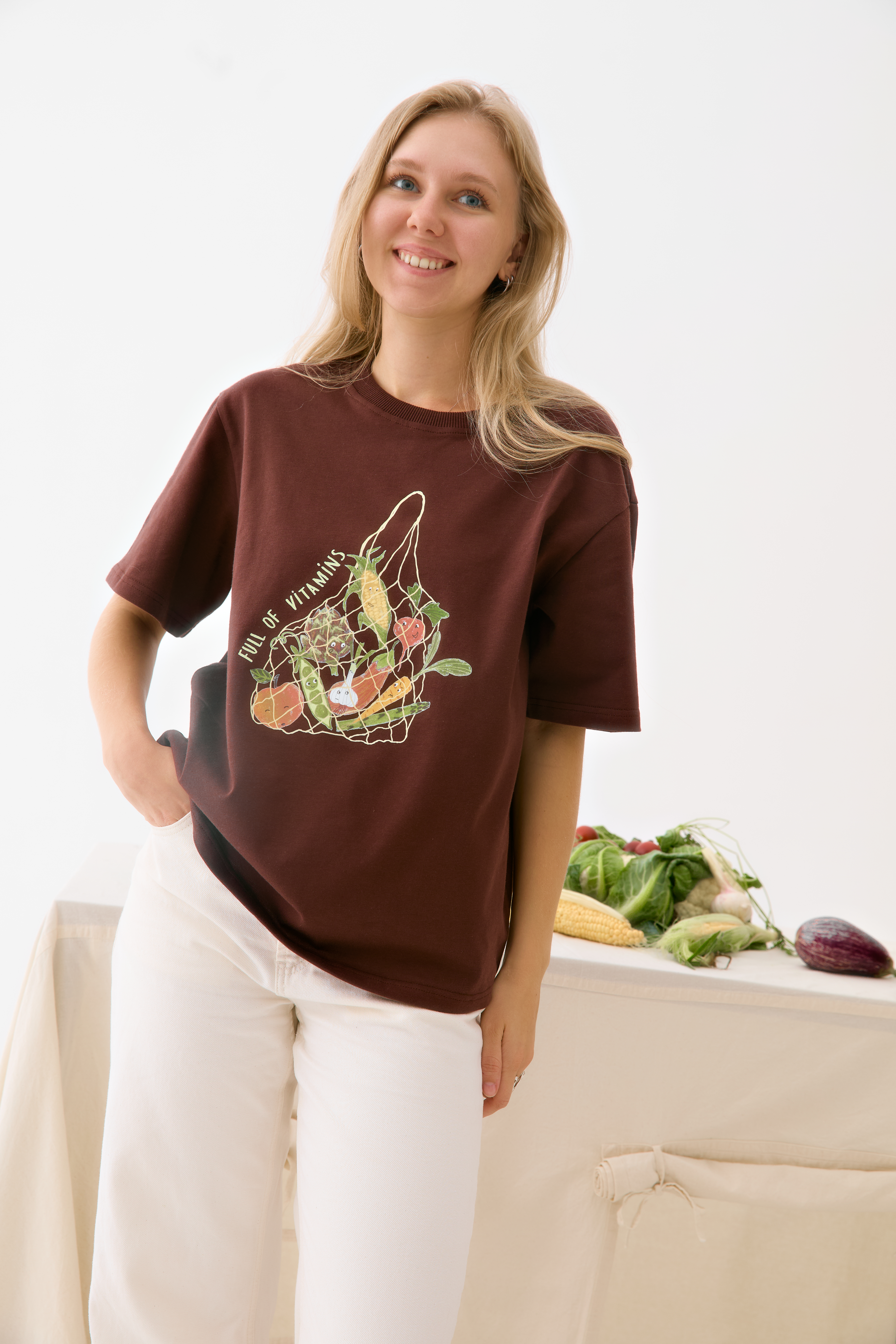 Любимая футболка оверсайз в трендовом и теплом оттенке сезона — горький шоколада. С авторским принтом — авоська с овощами, как напоминание о ваших планах на ужин. В составе неизменно — 100% хлопок