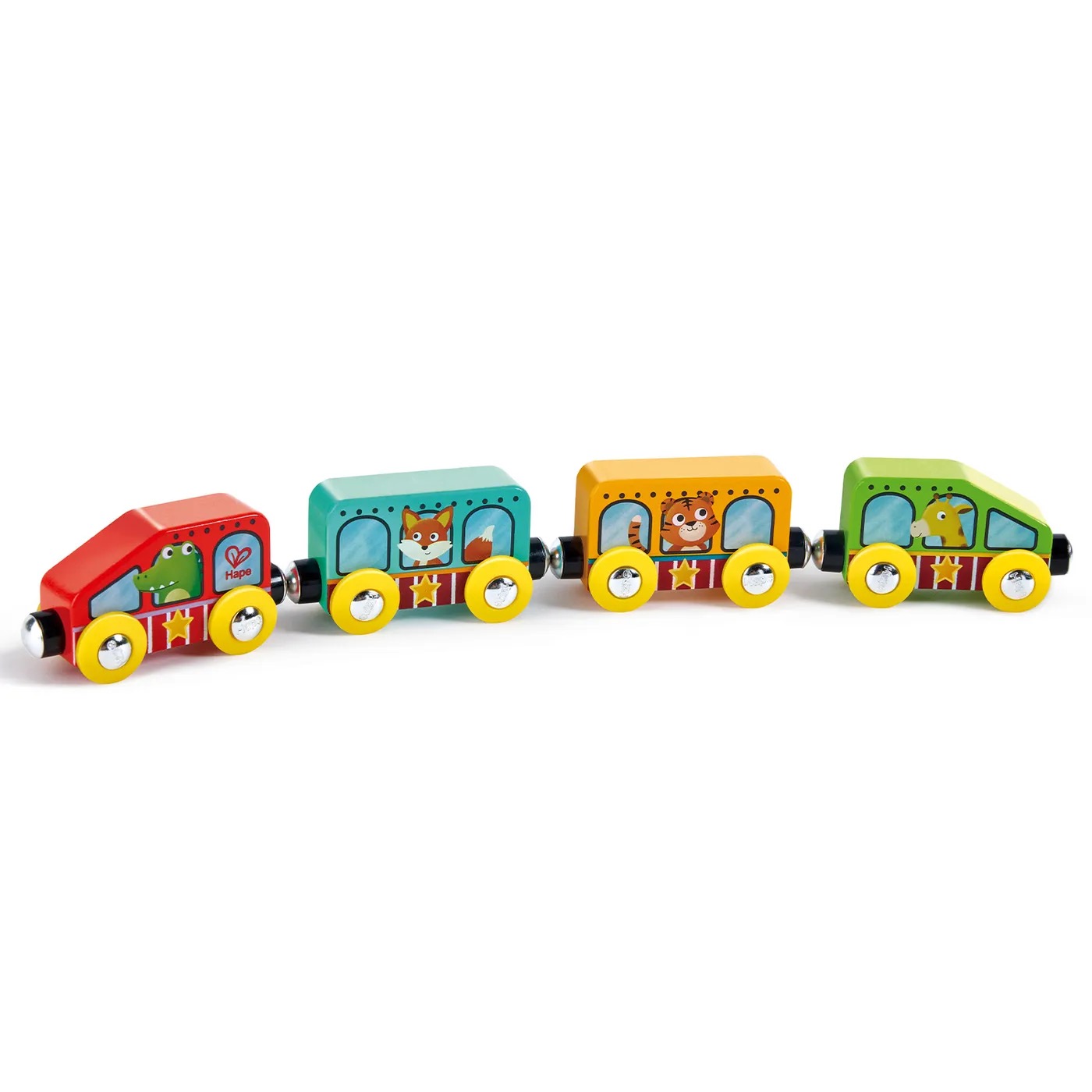 Комплектация: 4 разноцветных вагончика с изображениями животных (крокодил, тигр, лиса и жираф).
