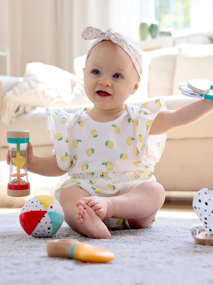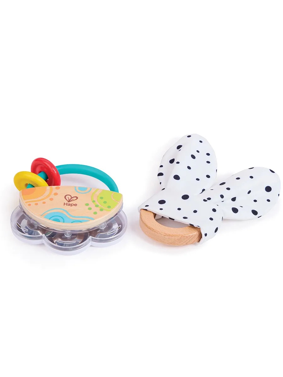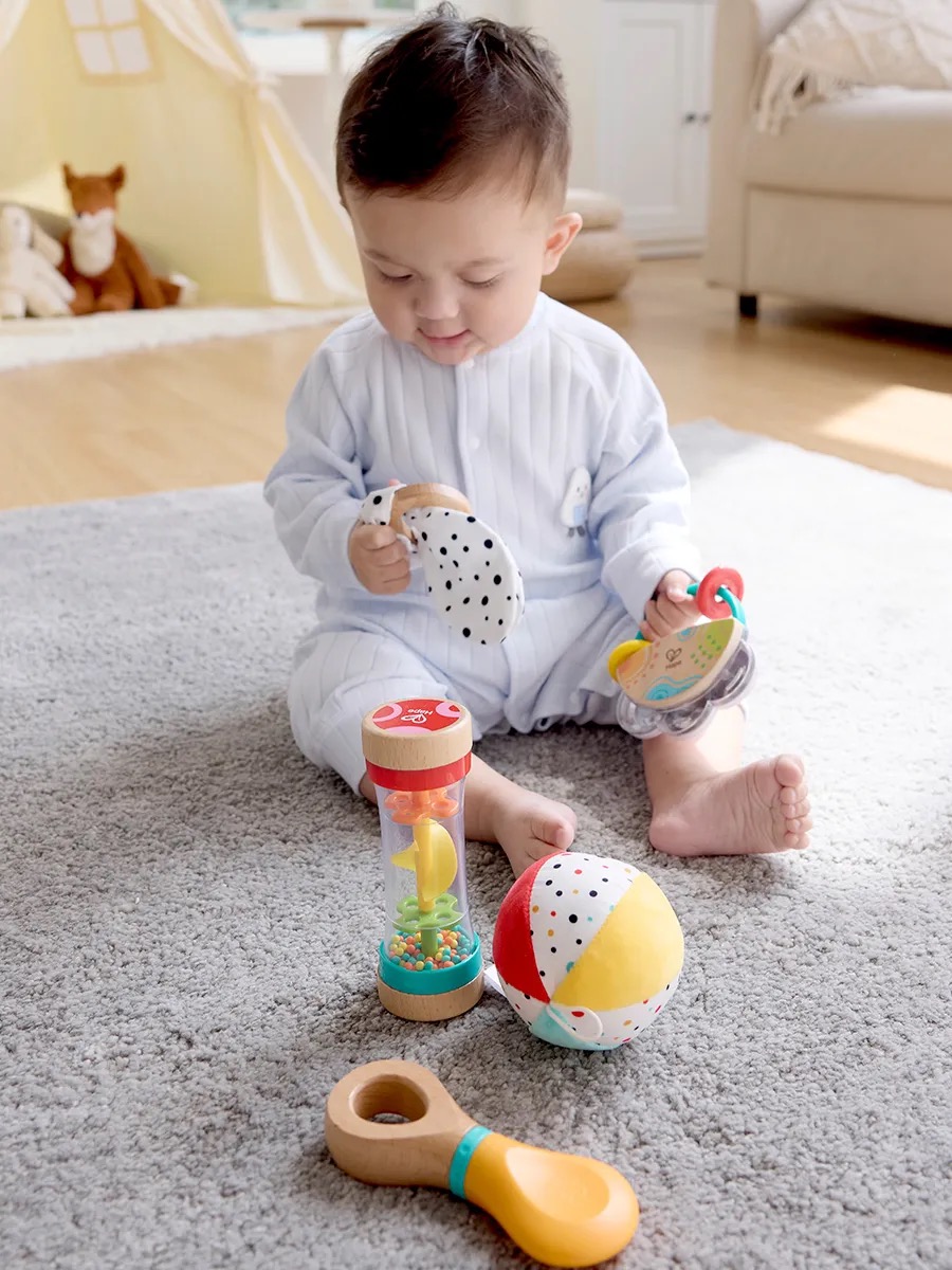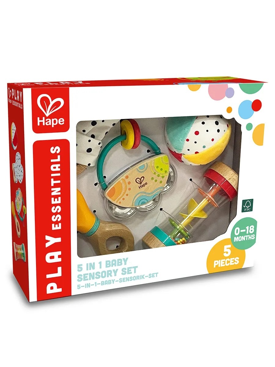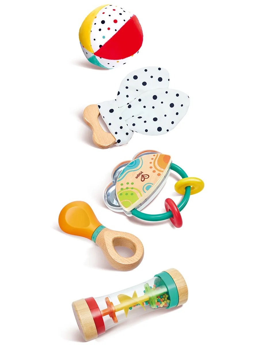 Набор включает маленький бубен, вертушку-погремушку, тканевый мячик, кольцо для захвата с тканевыми ушками и игрушку-шейкер с шумом дождя. Каждая игрушка предлагает уникальные игровые возможности, способствуют развитию зрительного, слухового, тактильного восприятия и хватательных навыков, поддерживая интерес и вовлеченность малышей и помогая им учиться и расти в процессе игры.