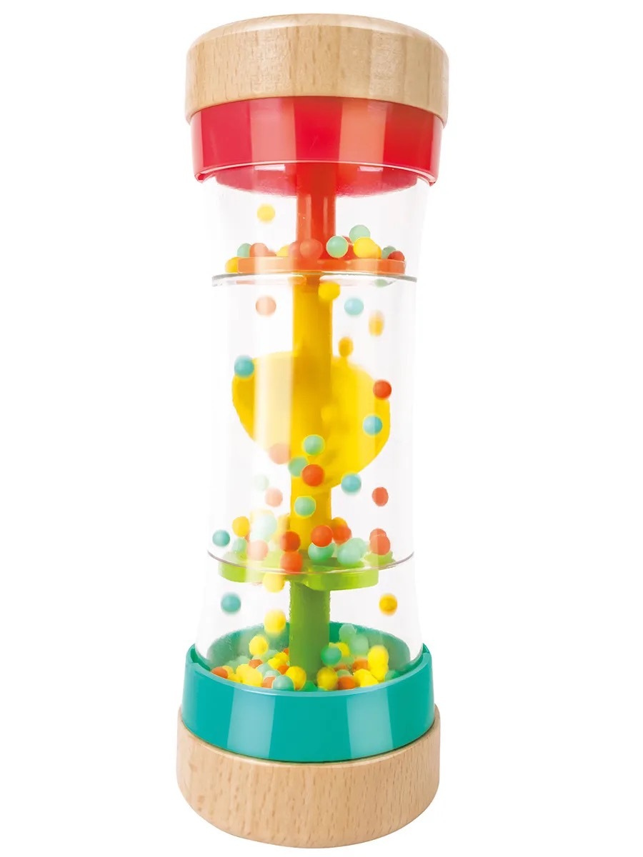 • Комплектация: маленький бубен, вертушка-погремушка, тканевый мячик, кольцо для захвата с тканевыми ушками, игрушка-шейкер с шумом дождя (бисерный дождь).