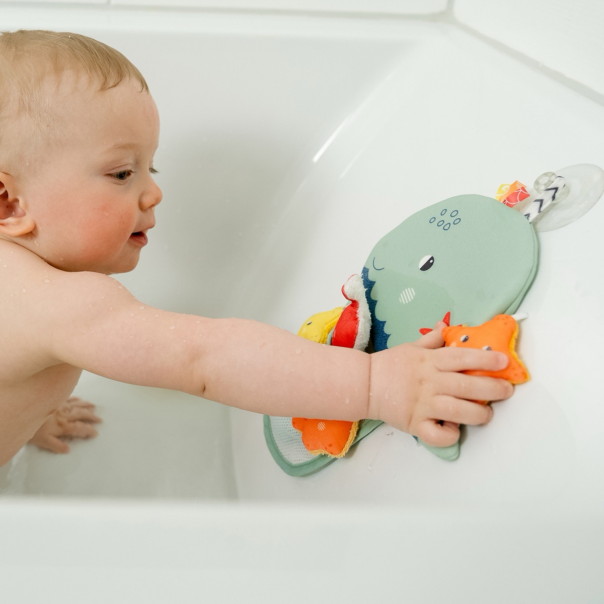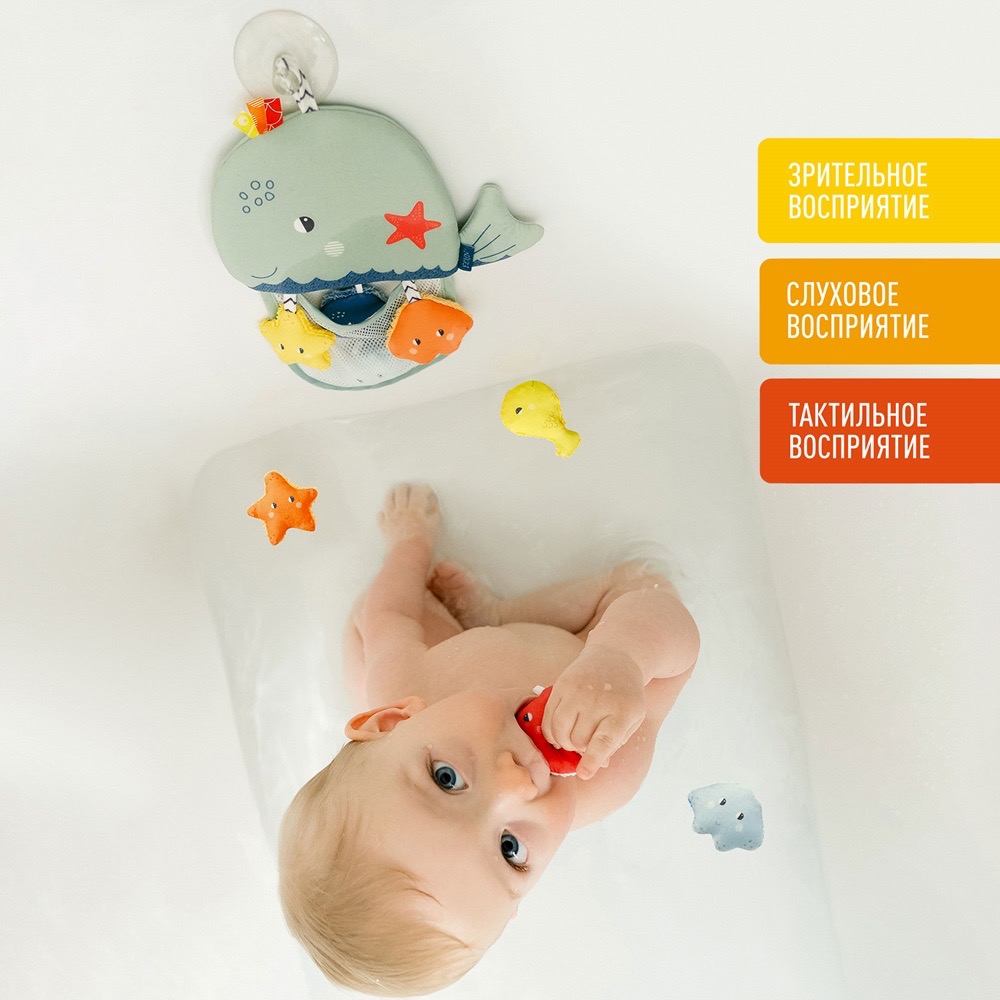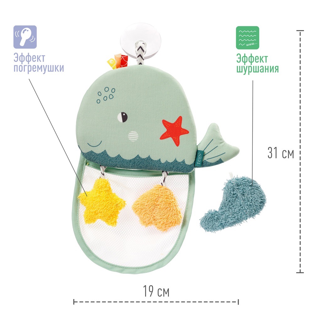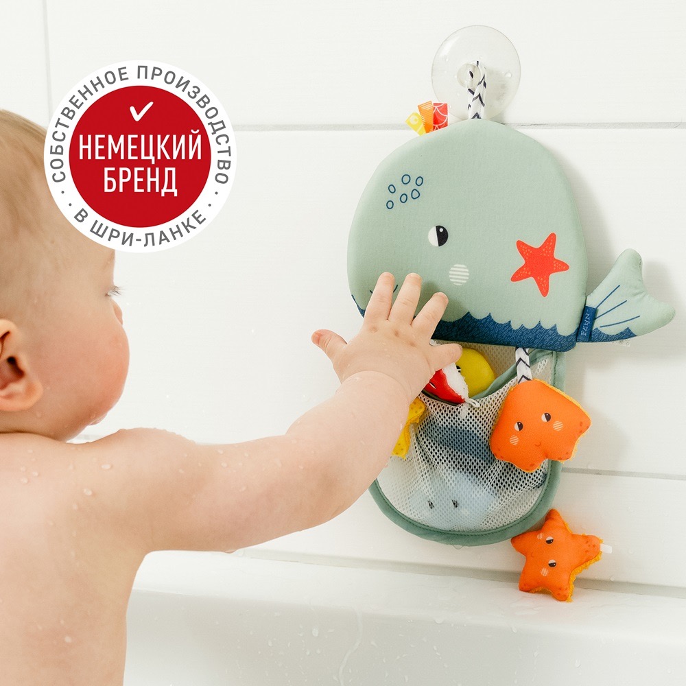 Кит – идеальный компаньон для купания: просто прикрепите органайзер к стенке ванны с помощью присоски, и малышу будет интересно складывать в сетку маленькие игрушки.