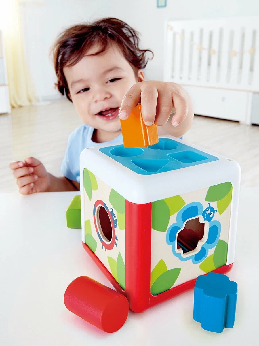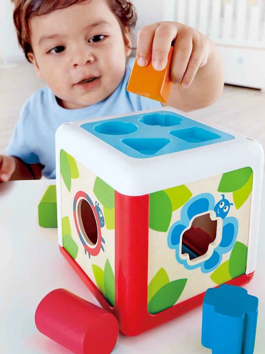 • Каждый элемент предназначен для того, чтобы проходить через соответствующее отверстие на деревянном кубе.