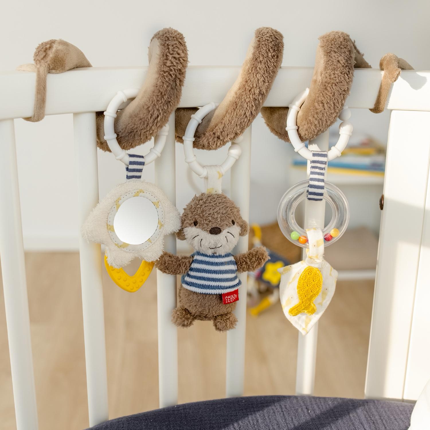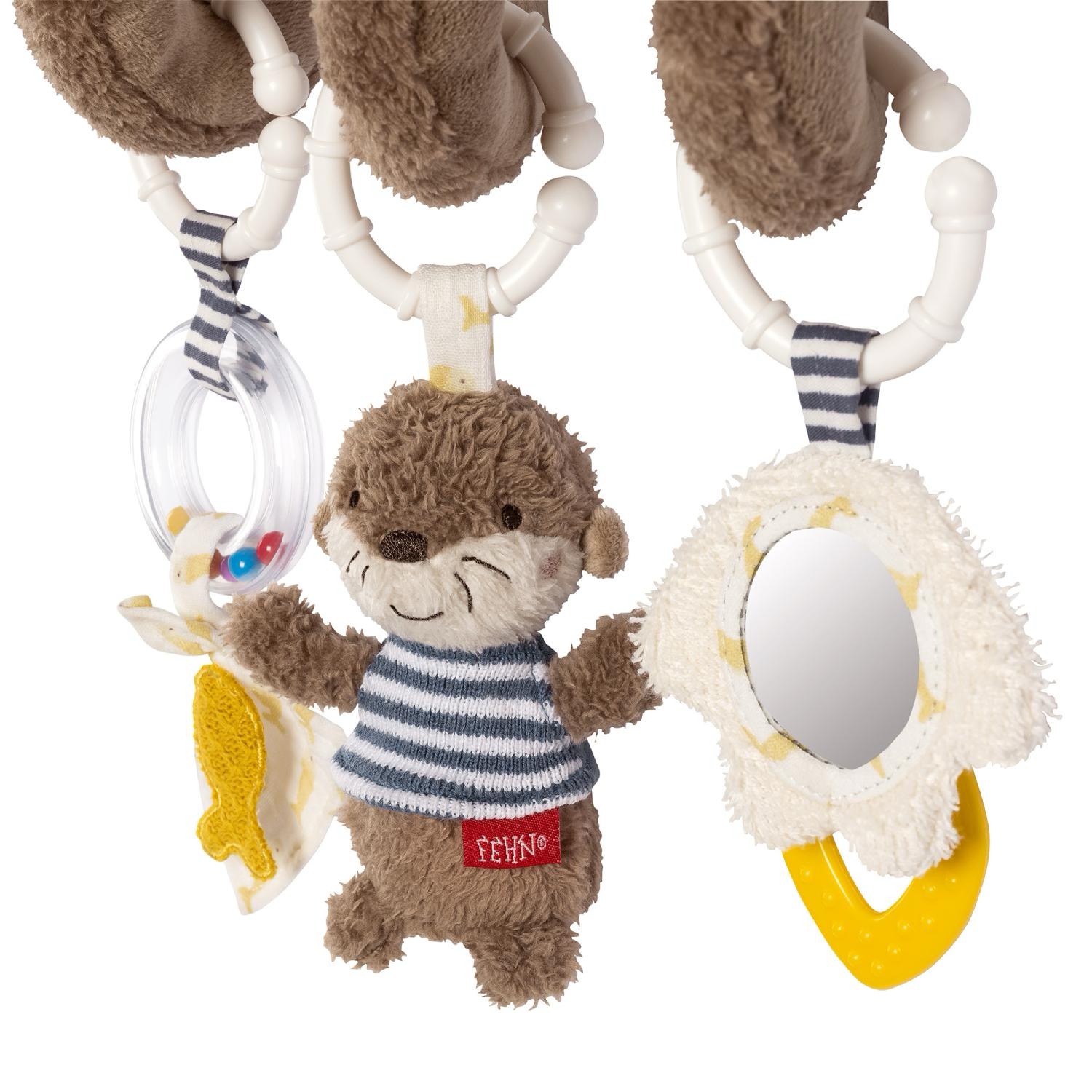 Текстильная спираль с подвесными игрушками в виде выдры, рыбки и безопасного зеркальца развлечёт ребёнка как дома, так и в дороге. Она растягивается и складывается как гармошка, вызывая у малыша радость и неподдельный восторг.