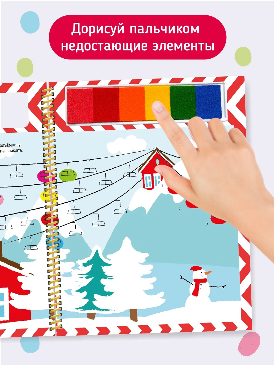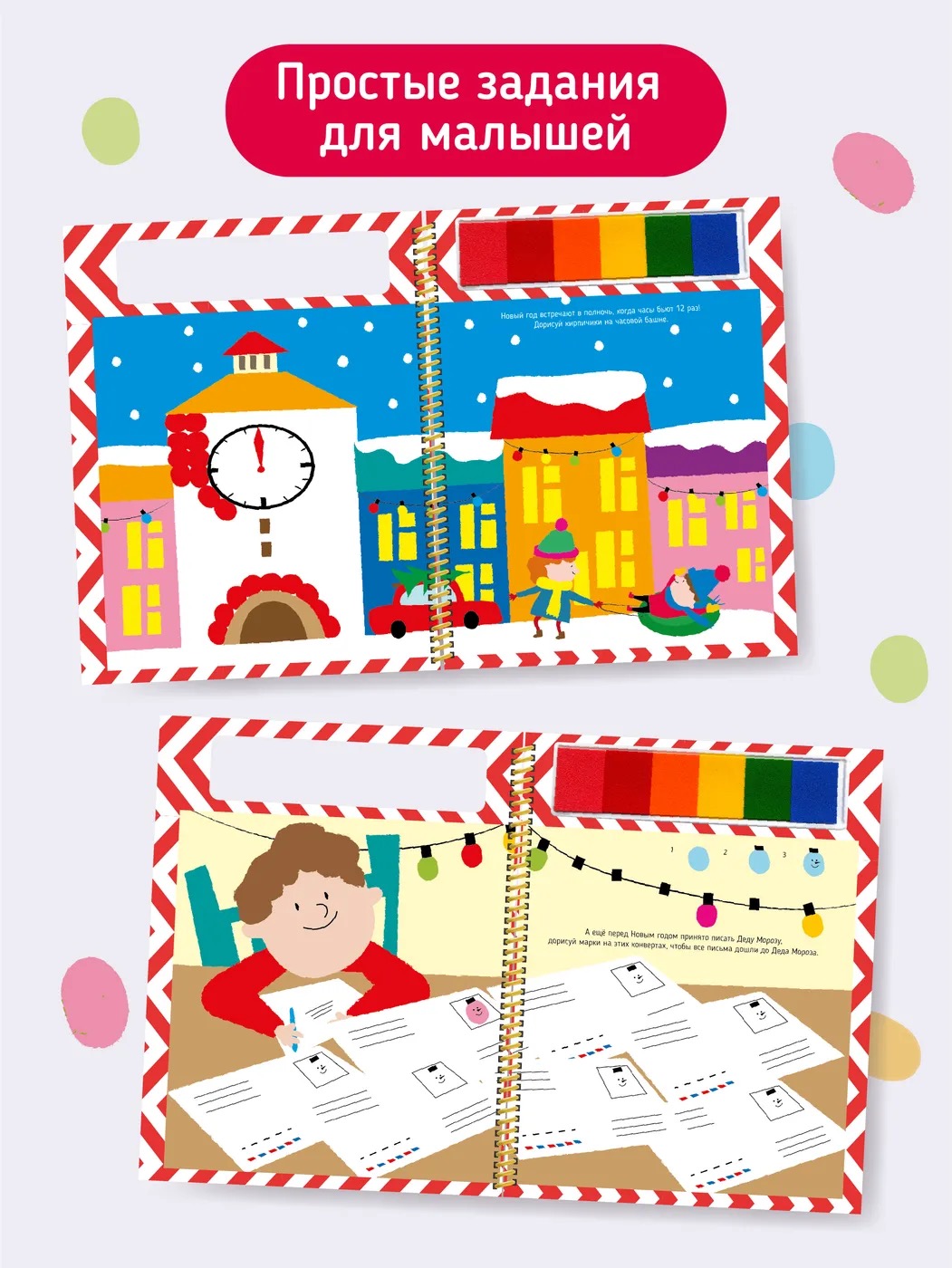 Ребенку необходимо макнуть палец в чернила и поставить отпечаток в нужном месте, как этот мир оживет! Выполняя забавные задания, малыш поможет создать новогоднюю гирлянду, украсить елку, испечь имбирное печенье, устроить яркий фейерверк, слепить снеговика, а в конце будет награжден грамотой! Идеально для раскрашивания и фантазирования!