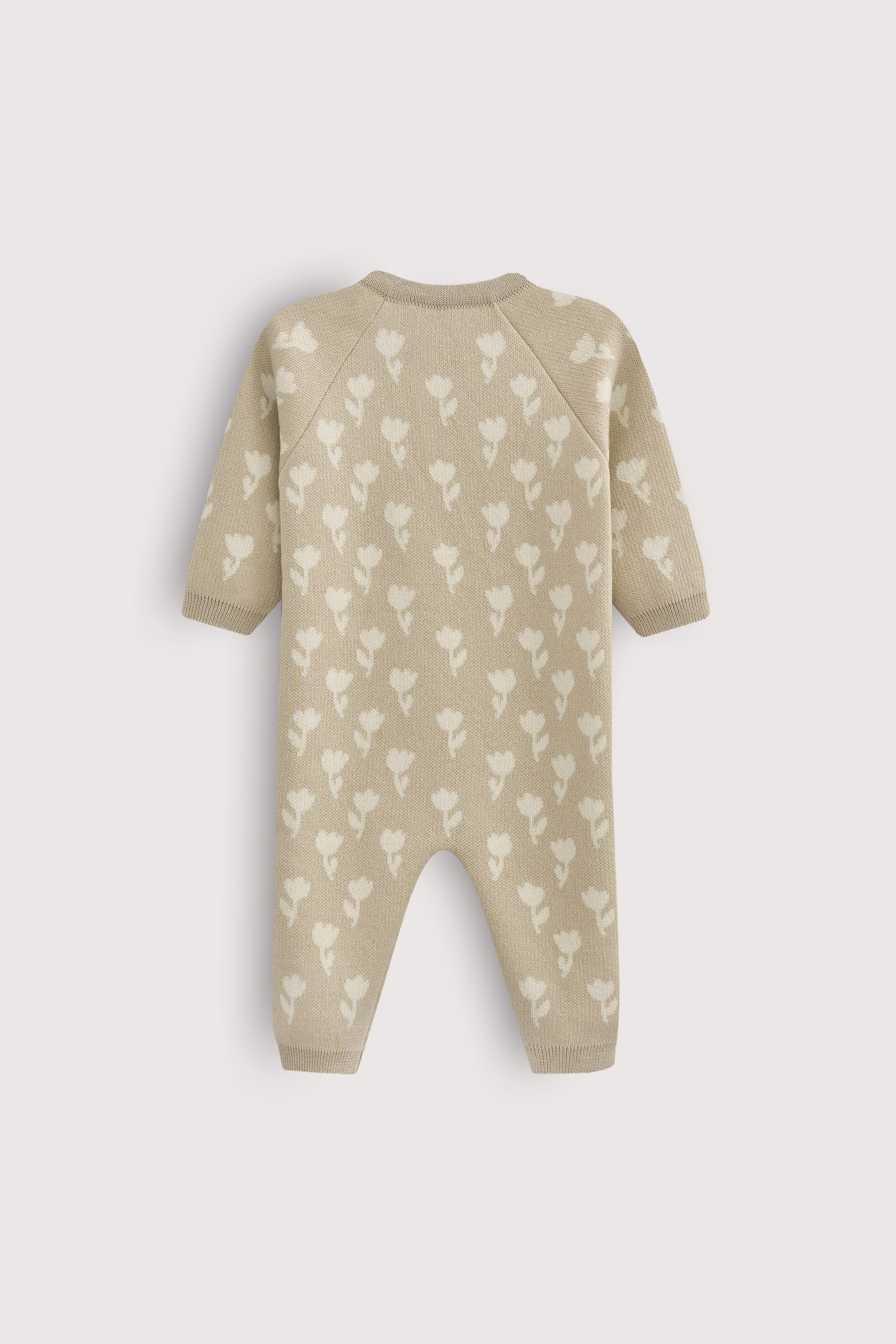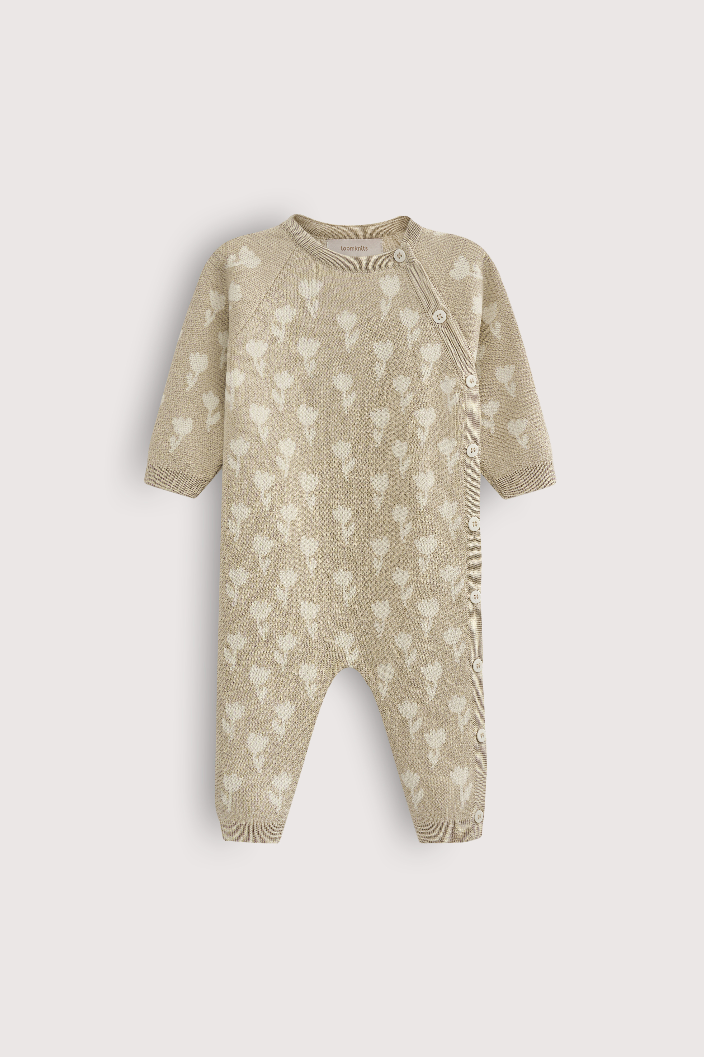Полуприлегающий крой комфортно сидит по фигуре и не мешает важным делам: потягиваться, переворачиваться, ползти к любимой игрушке и разглядывать «цветочки» на рукавах. На горловине, манжетах и штанишках — эластичная вязаная резиночка: мягко фиксирует и помогает комбинезону держать форму, пока кроха придумывает свои первые приключения.