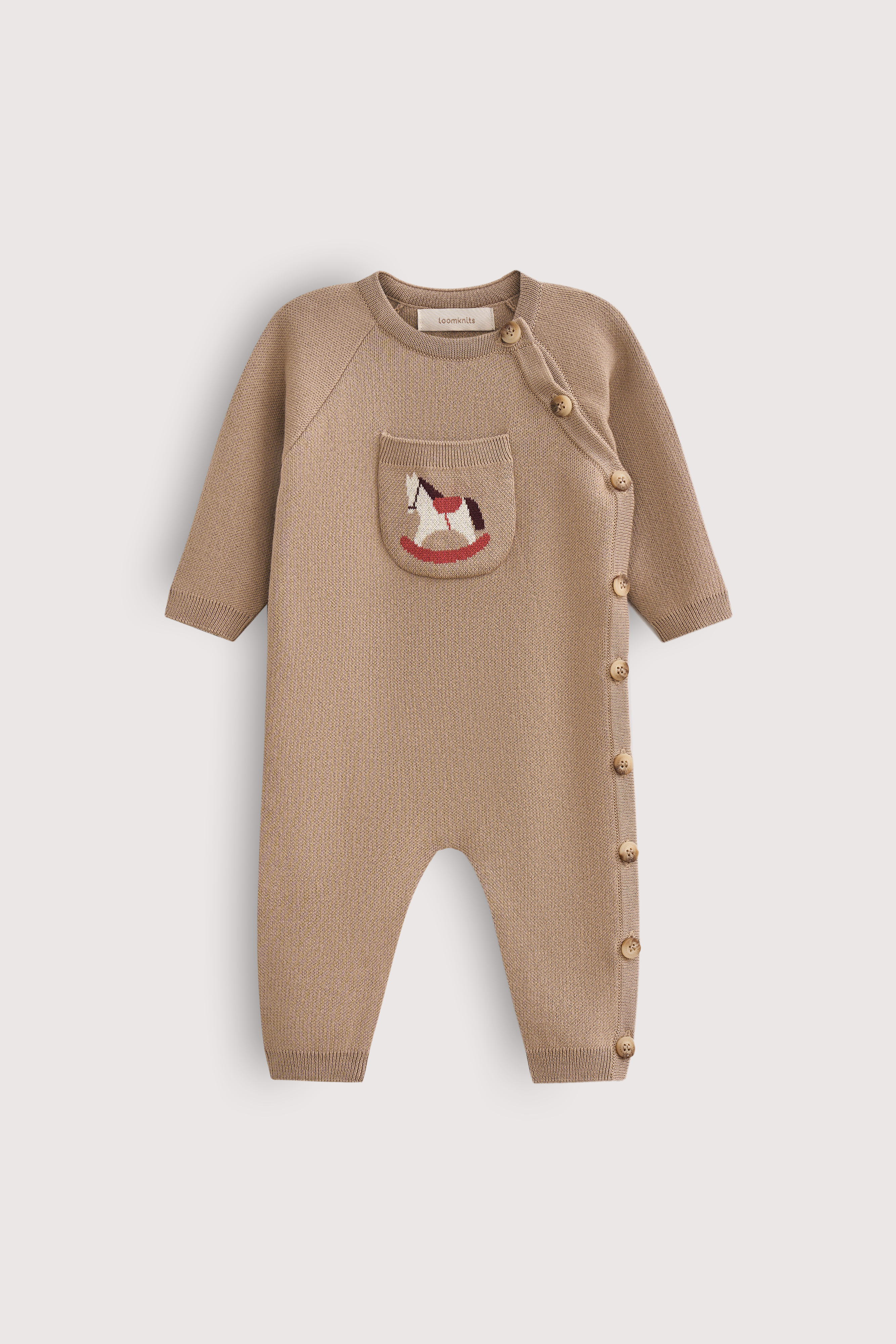 Диагональная планка на пуговицах раскрывается широко: удобно переодевать в дороге и на гостевых визитах. Эластичные манжеты сохраняют посадку, кармашек с лошадкой добавляет аккуратный акцент на праздничных фото.