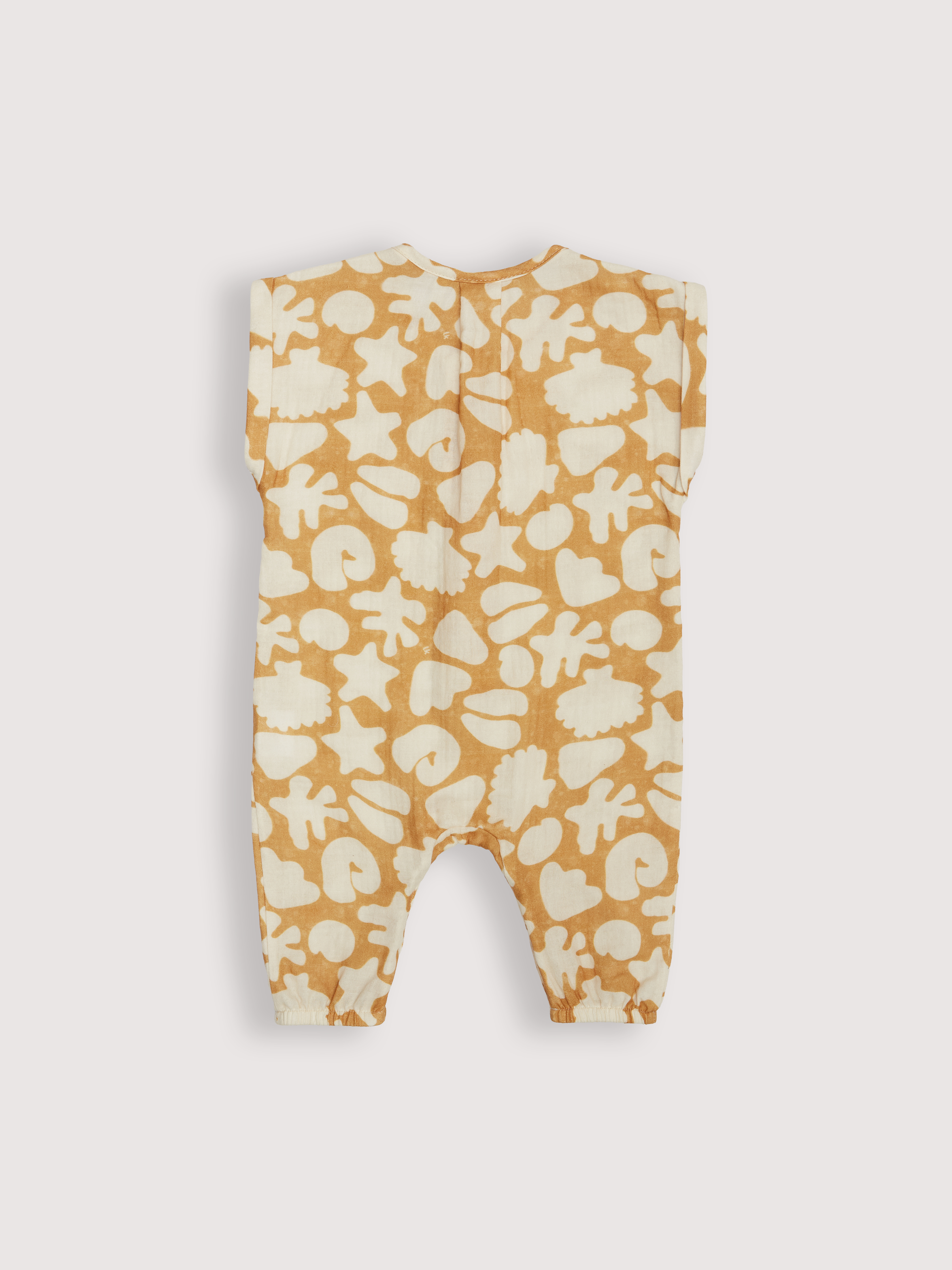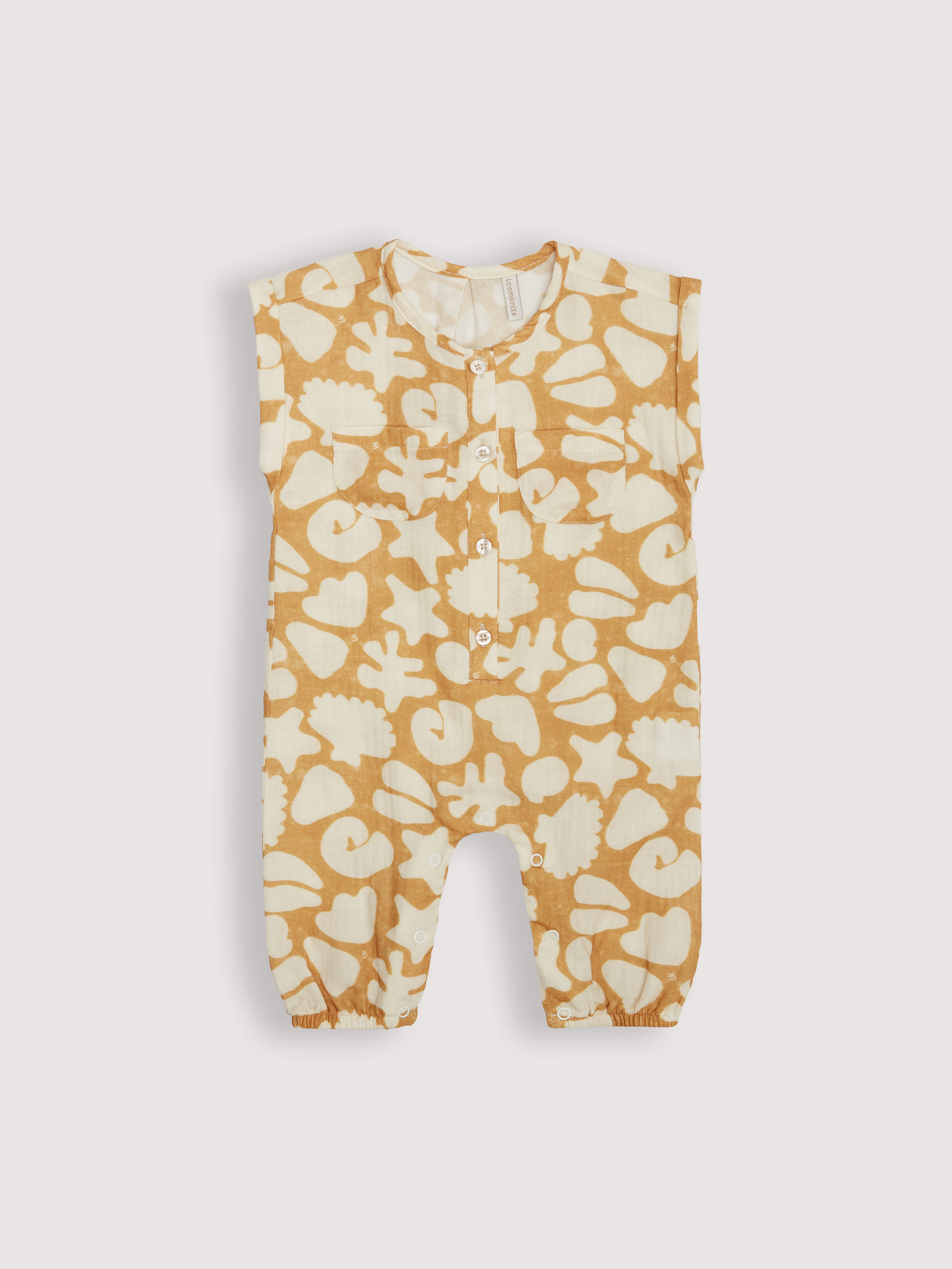 Легкий детский комбинезон без рукавов с застежкой на пуговицы и кнопки. Выполнен из мягкой приятной ткани, которая обеспечивает комфорт в течение всего дня.
