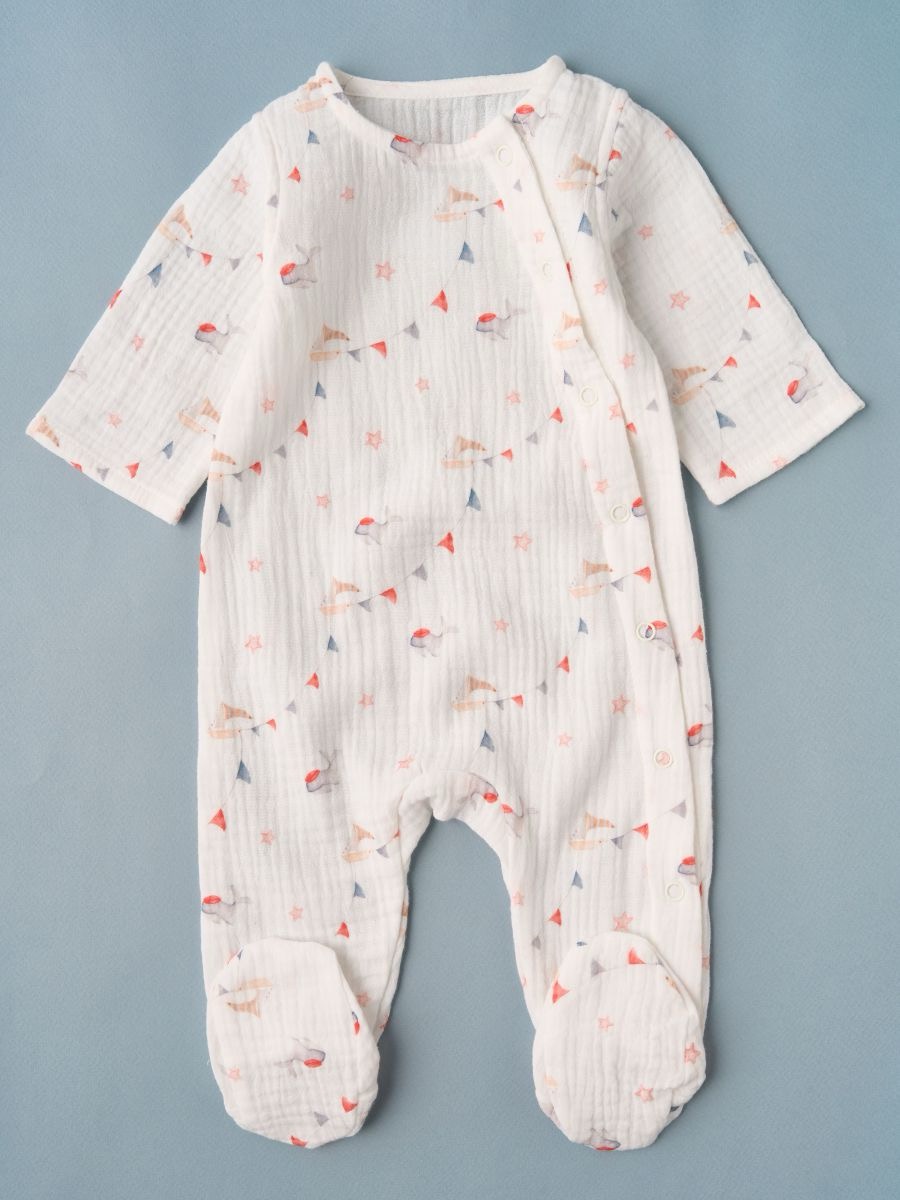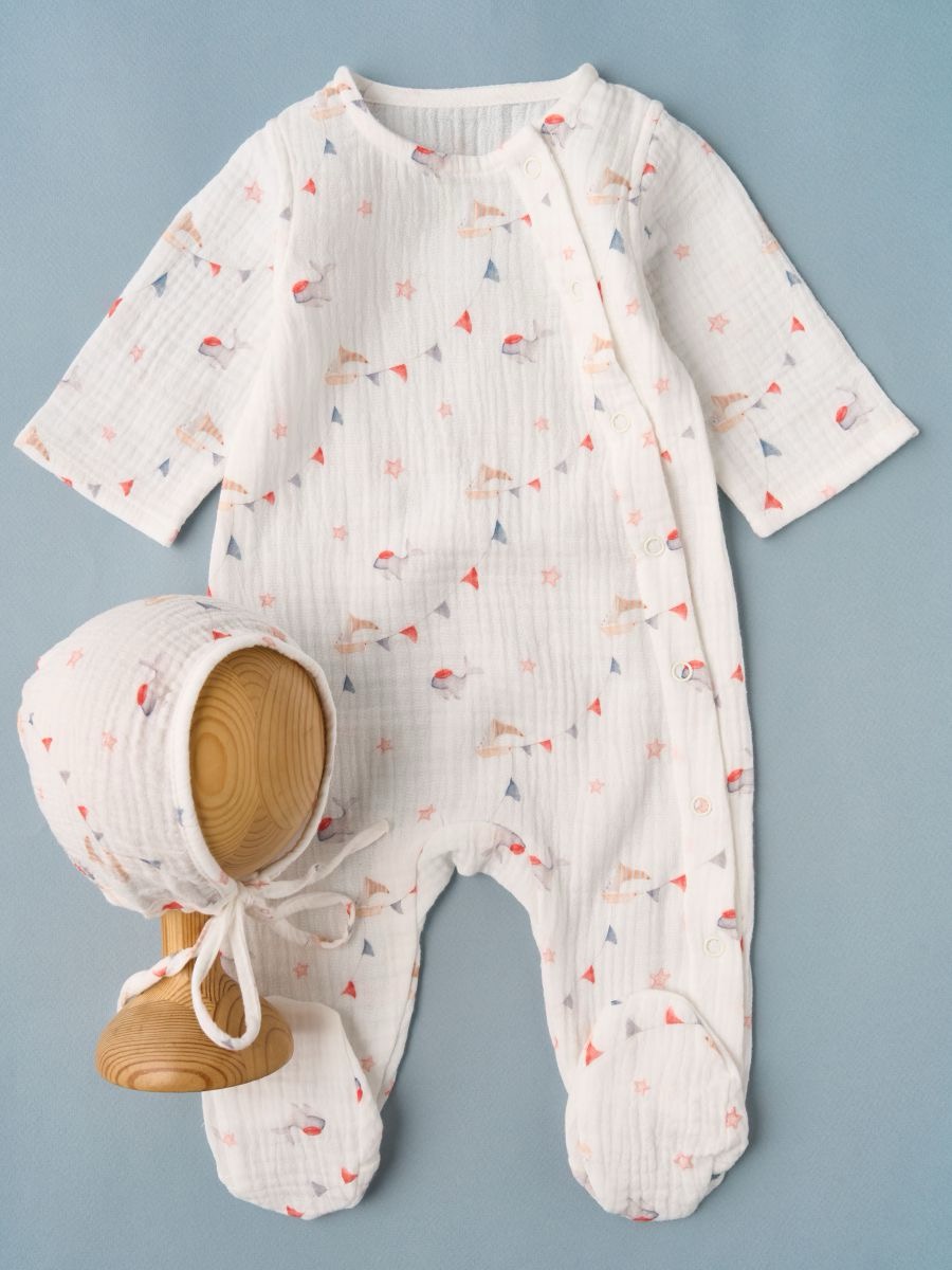 Комбинезон из муслина 100% хлопок (в комплекте чепчик с завязками) — лёгкий, дышащий и очень мягкий детский комбинезон с боковой планкой на кнопках и закрытыми ножками. Двухслойный фактурный муслин бережно касается кожи, обеспечивает естественную терморегуляцию. Нежный принт делает образ милым и праздничным — отличный вариант для дома, прогулок, выписки и фотосессий.
