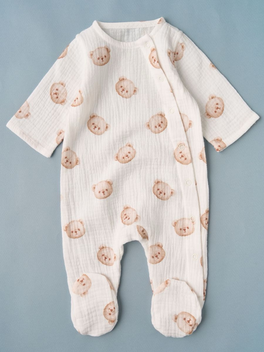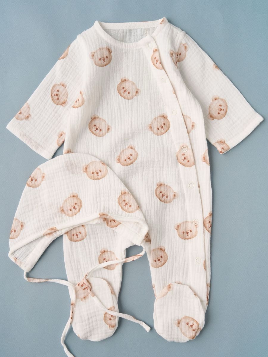 Комбинезон из муслина 100% хлопок (в комплекте чепчик с завязками) — лёгкий, дышащий и очень мягкий детский комбинезон с боковой планкой на кнопках и закрытыми ножками. Двухслойный фактурный муслин бережно касается кожи, обеспечивает естественную терморегуляцию. Нежный принт с мишками делает образ милым и праздничным — отличный вариант для дома, прогулок, выписки и фотосессий.