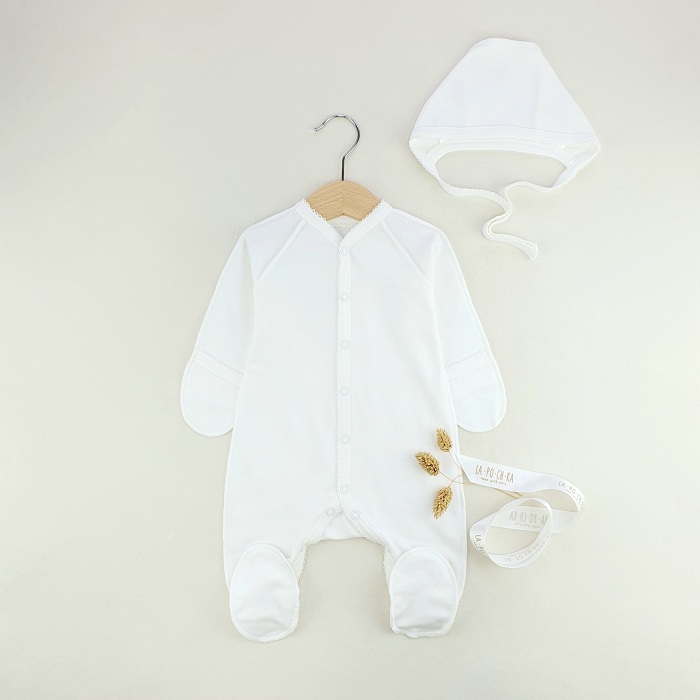 Слип для новорождённого из мягкого трикотажа. Застёжка на кнопках по всей длине спереди и по ножке облегчает переодевание и смену подгузника. Закрытые ножки помогают сохранить тепло. На рукавах отвороты, которые при разворачивании превращаются в антицарапки и защищают кожу малыша.