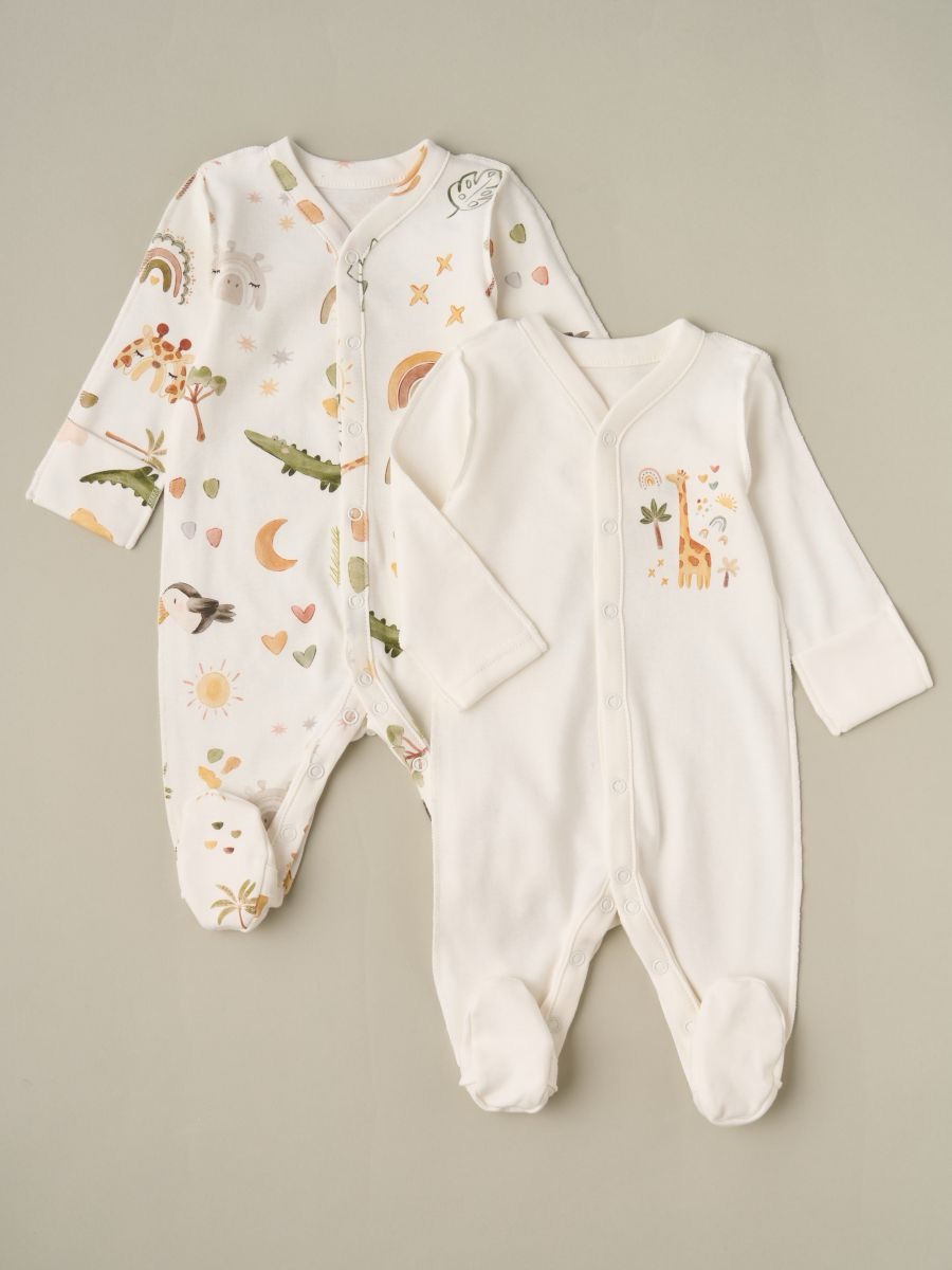 Набор комбинезонов 2 шт, 100% хлопок, с принтом — мягкие детские комбинезоны с закрытыми ножками и кнопками по всей длине спереди. В размерах 56 и 62 см — швы наружу и вшитые антицарапки для максимального комфорта новорождённого. Стойкий рисунок: принт не трескается, не выцветает и не боится утюга. Универсальный набор комбинезонов на каждый день, для выписки и фотосессий.