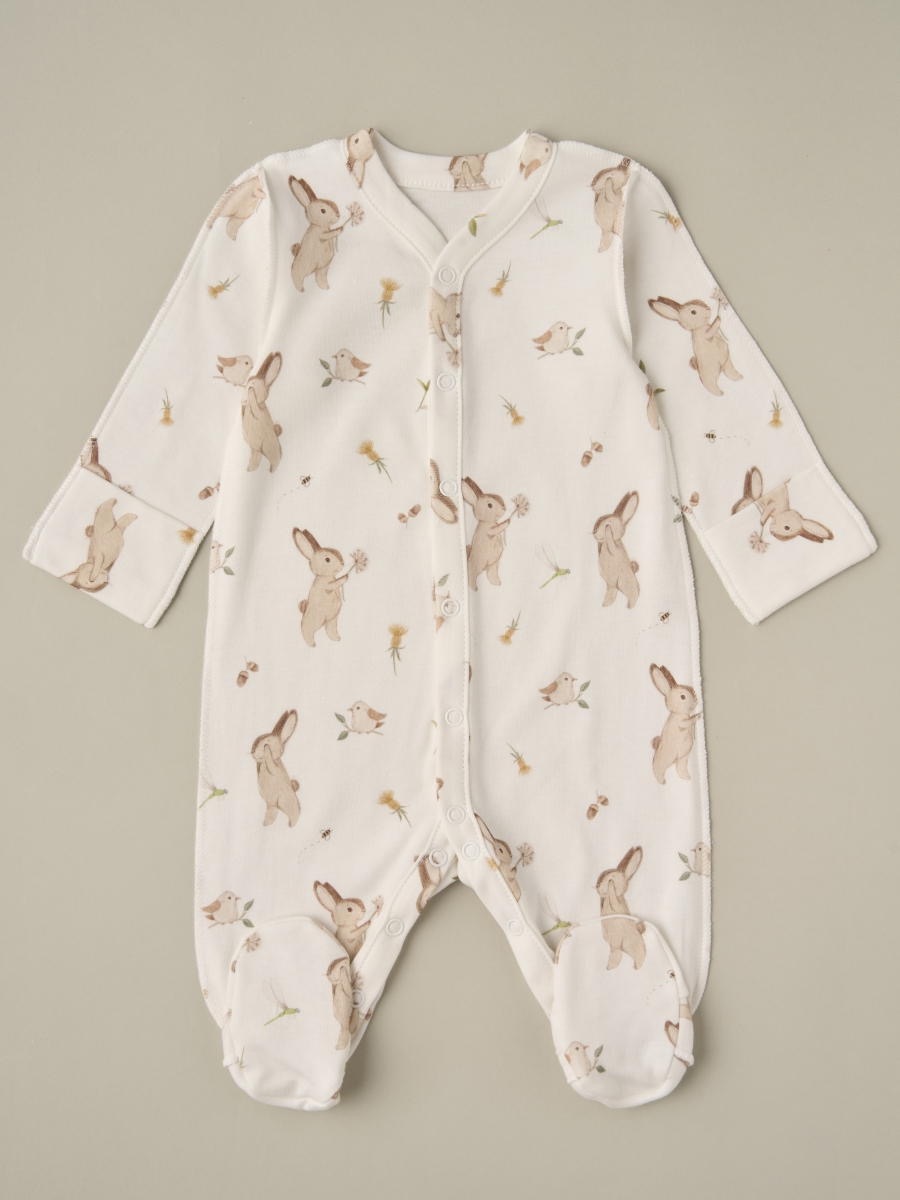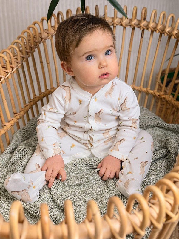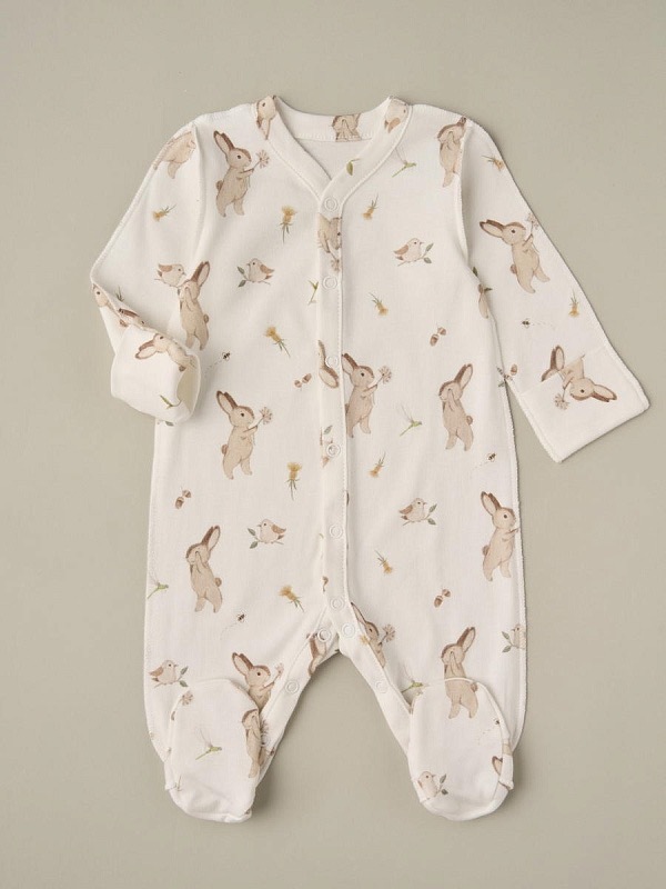 Комбинезон из нежного трикотажа на кнопках с принтом . Удобная модель, позволит легко и быстро переодевать малыша. Кнопки расположены по центру, сверху донизу. Также, для удобства смены подгузника, мы предусмотрели кнопочки и между ножек.