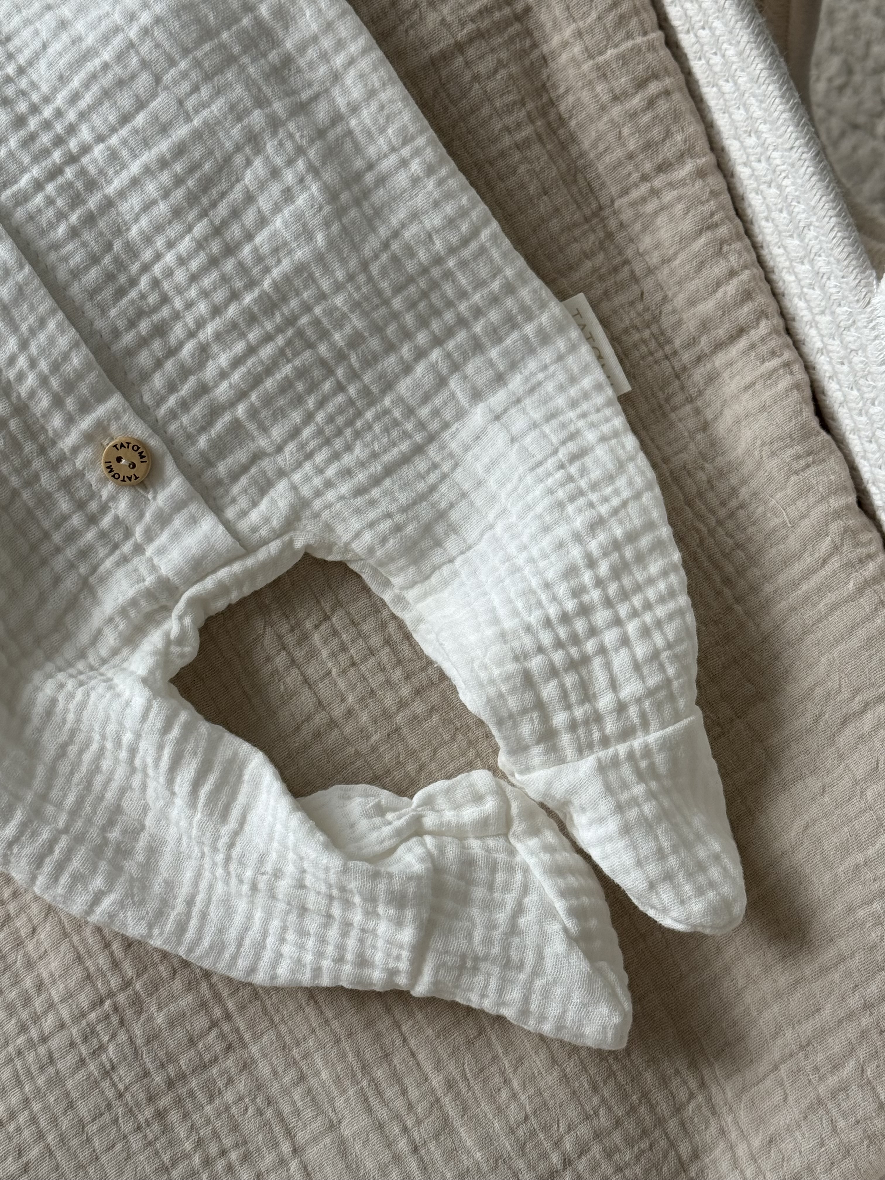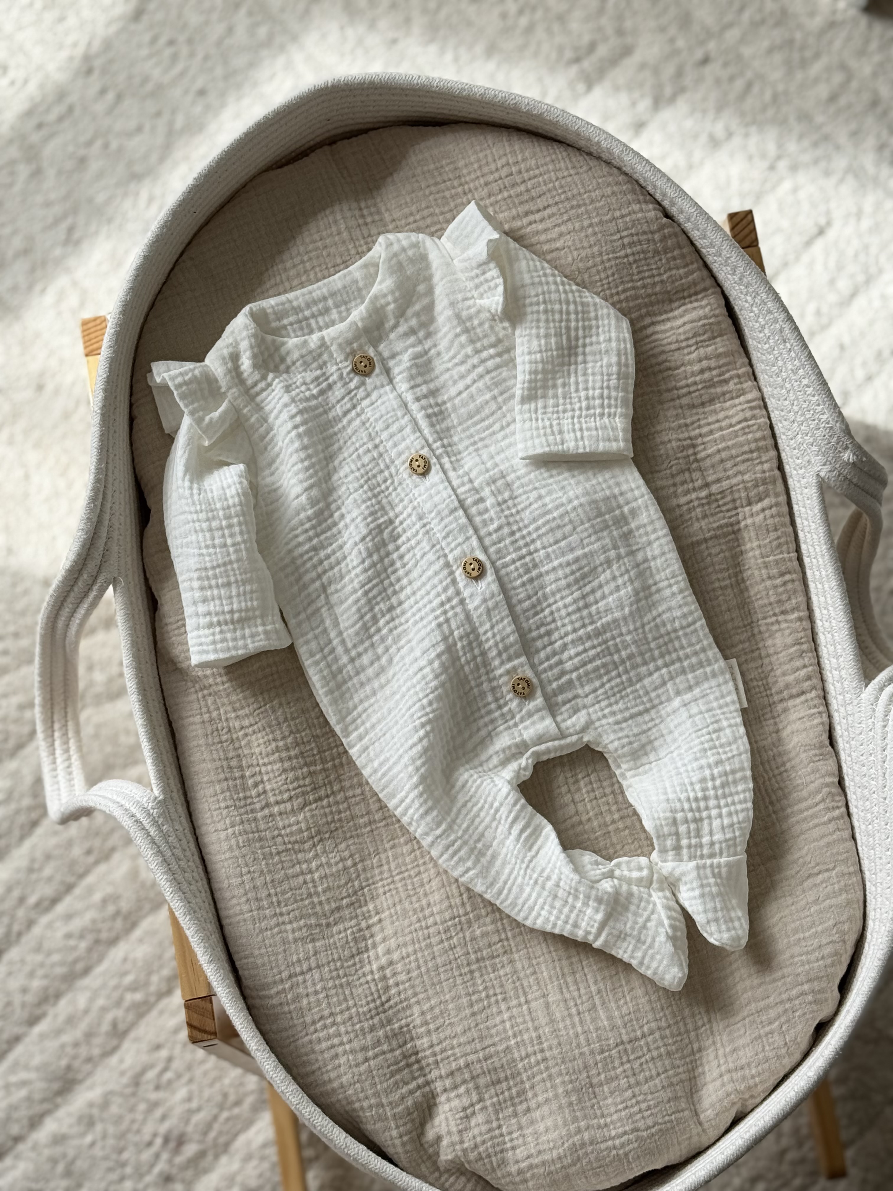 Легкий комбинезон и чепчик подойдет на выписку в теплые дни как единственный слой одежды малыша.