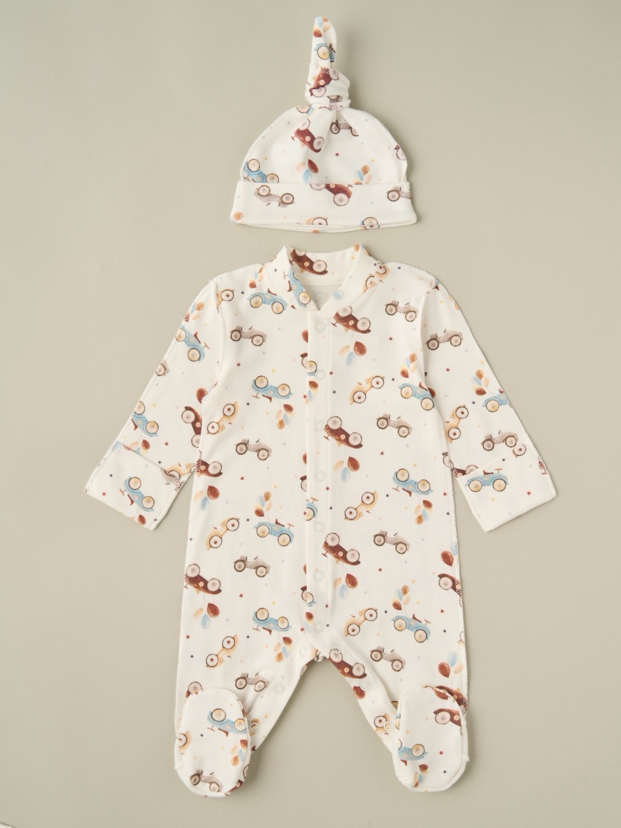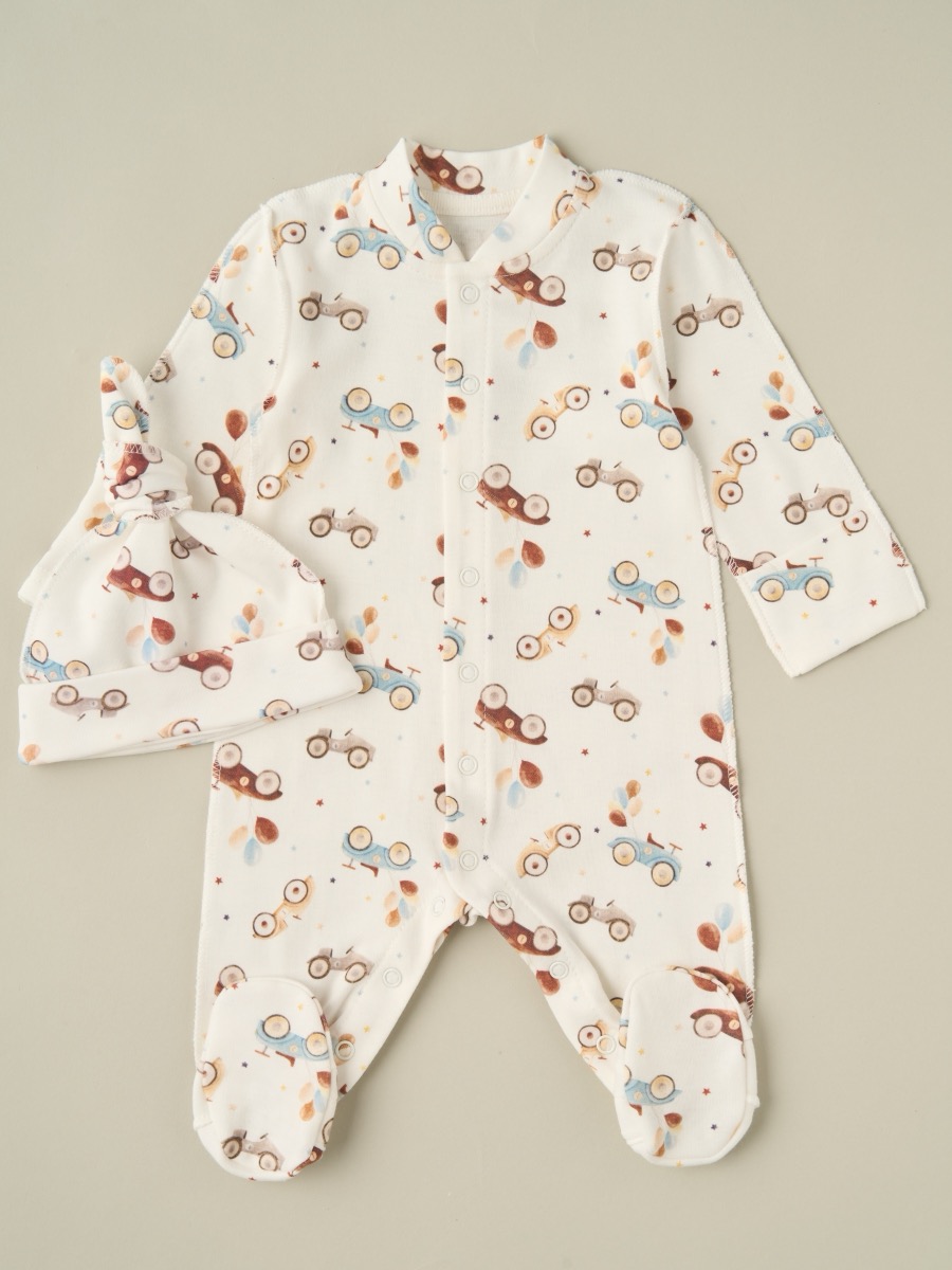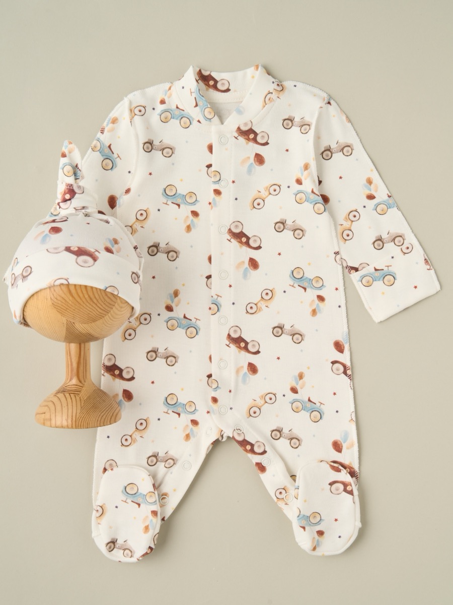 Комплект для новорождённого — мягкий и комфортный набор из комбинезона и шапочки, изготовленный из 100% хлопка. Натуральный материал обеспечивает нежный контакт с кожей малыша, отлично пропускает воздух и не вызывает раздражений. Комбинезон оснащён наружными швами и антицарапками — забота о комфорте и безопасности новорождённого в каждом элементе. Мягкие застёжки-кнопки по всей длине позволяют легко переодевать малыша, не доставляя ему дискомфорта. Доступен в размерах 56 и 62 см.