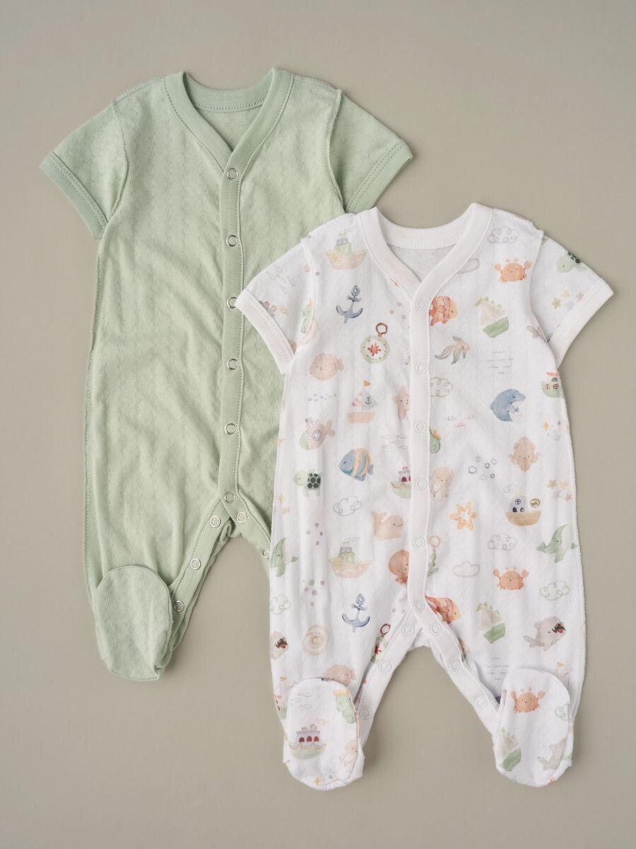 Набор слипов для новорождённого, 2 шт — кулир, 100% хлопок. Мягкие комбинезоны с коротким рукавом, закрытыми ножками и кнопками по всей длине для быстрого переодевания. Дышащая ткань, аккуратные швы, милые принты в нежных тонах. Идеальны для дома, сна, прогулок и как подарок малышу.