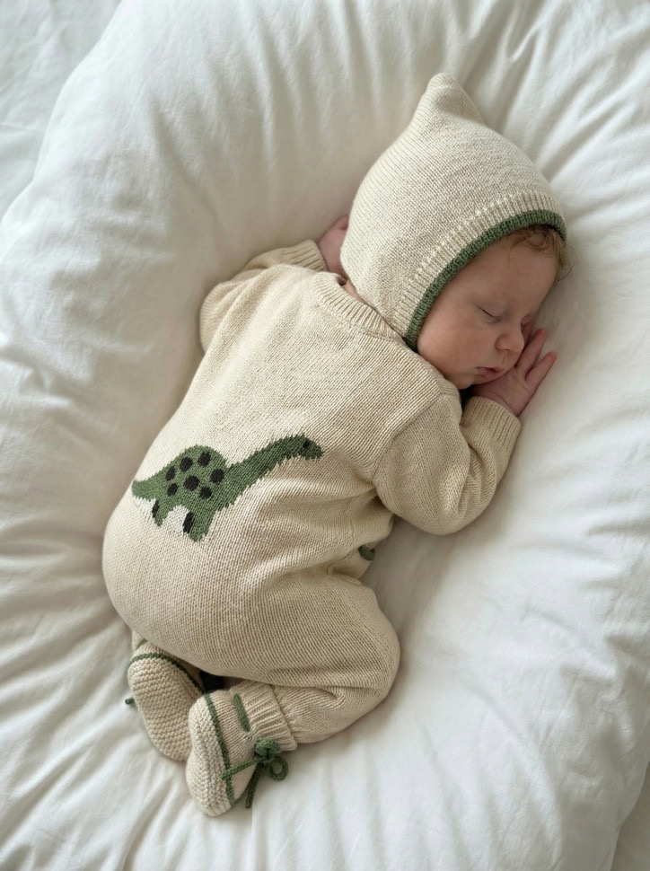 Нежный вязаный комплект из хлопка для самых маленьких. В набор входит комбинезон на пуговицах, шапочка и пинетки. Мягкий молочный оттенок с контрастной зеленой отделкой и милым динозавриком на спинке делает комплект особенно стильным и трогательным.