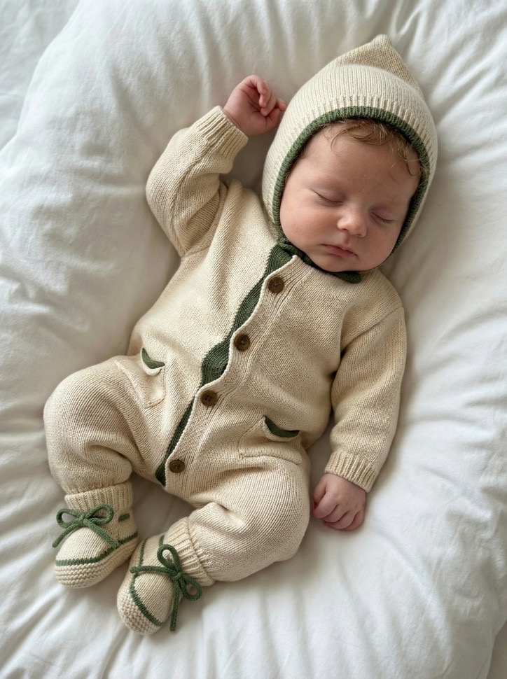 Хлопковая вязка приятна к телу, хорошо пропускает воздух и дарит комфорт малышу в течение всего дня. Комбинезон удобно надевать благодаря застежке на пуговицах, а шапочка и пинетки дополняют образ и помогают сохранить тепло.