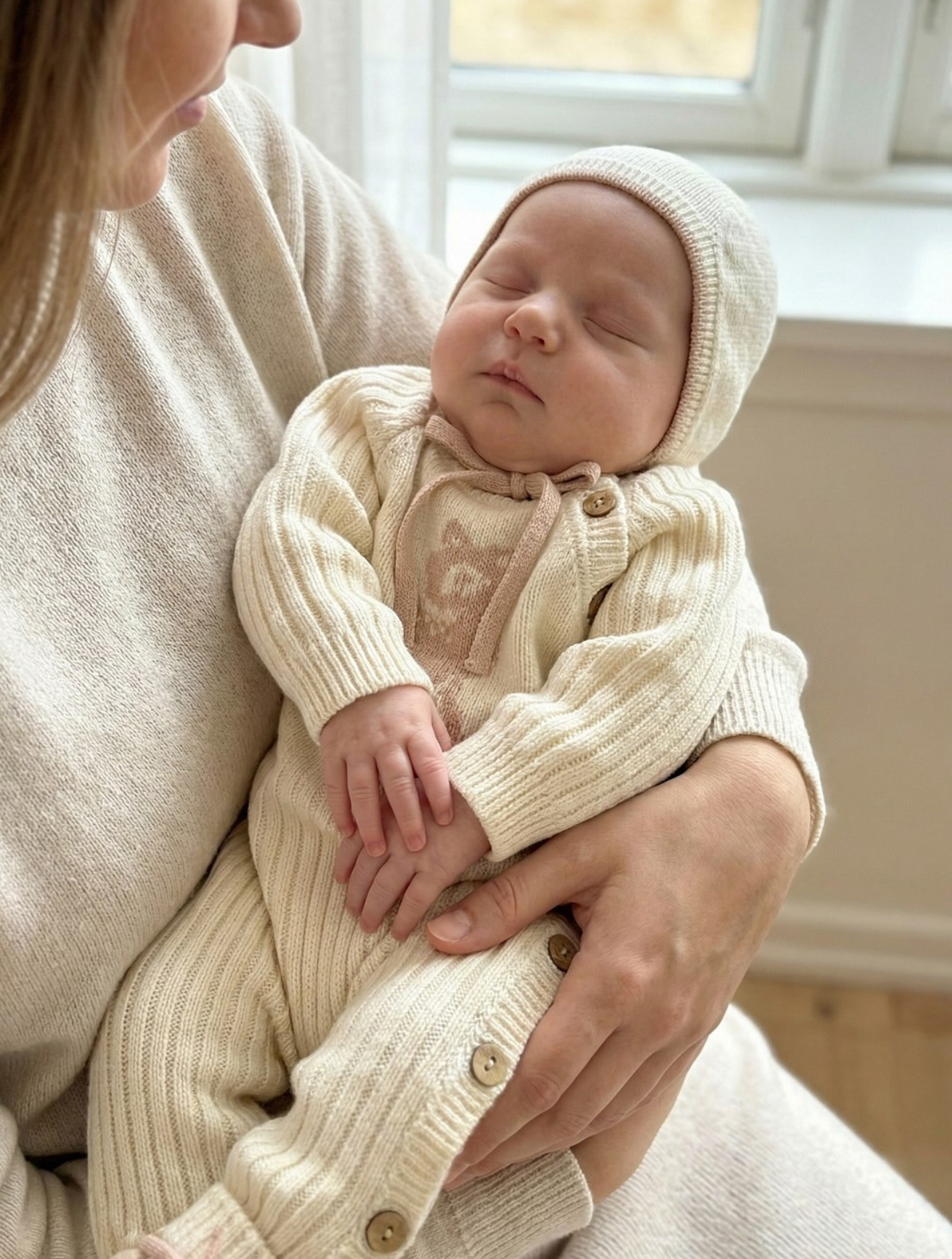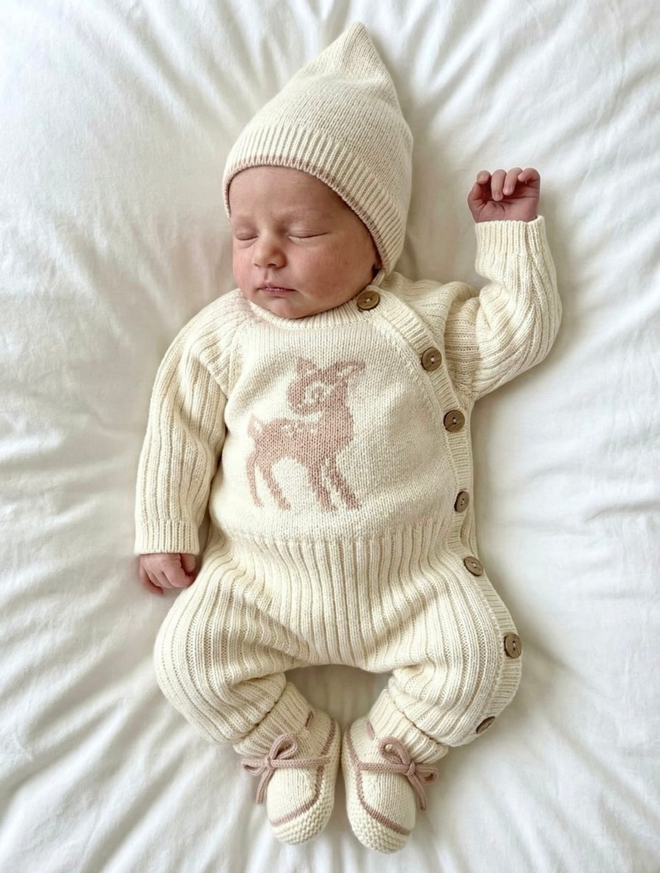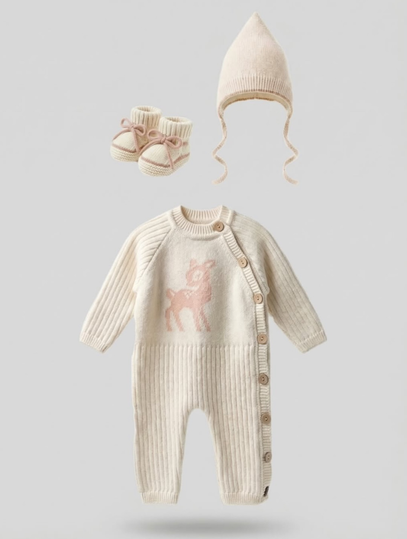 В наборе есть все необходимое с первых дней жизни: шапочка без швов, комбинезон со свободным кроем и пинетки с мягкими завязками.