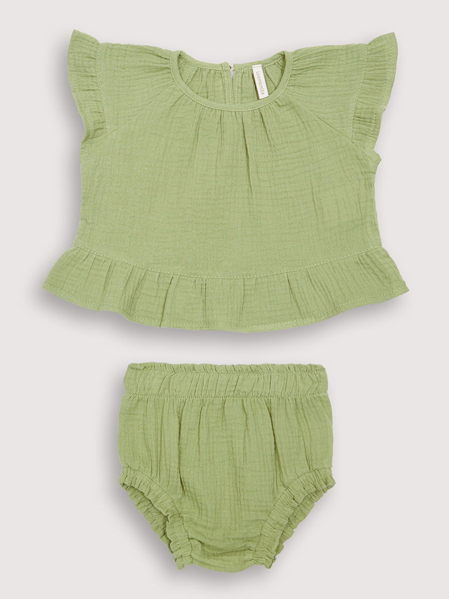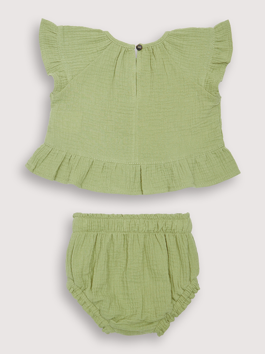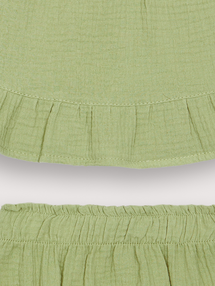 Лёгкий муслиновый комплект будто создан для тёплых дней, когда мир вокруг только начинает открываться малышу 🌿 Мягкий зелёный оттенок напоминает свежую траву под солнцем, а воздушная ткань бережно окутывает, не сковывая движений.