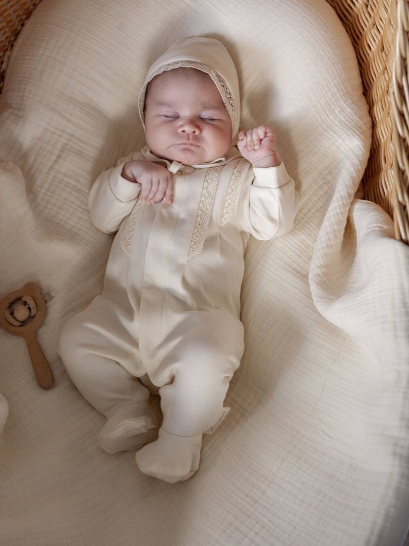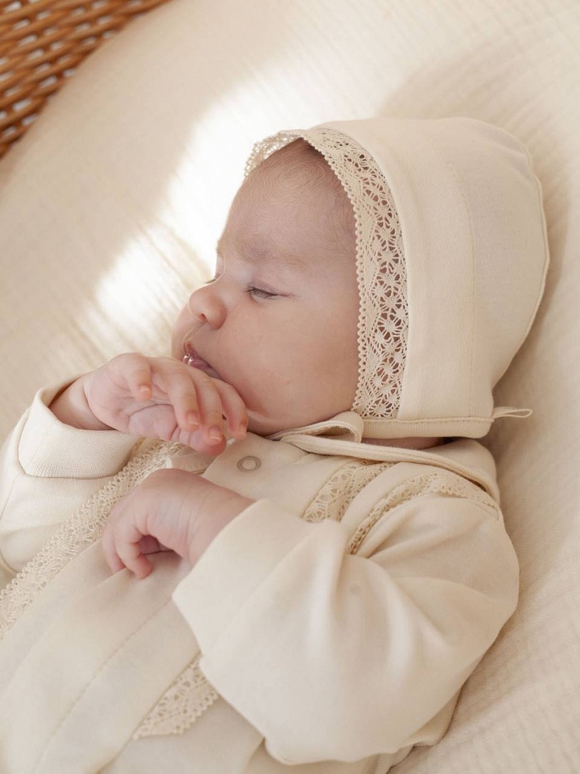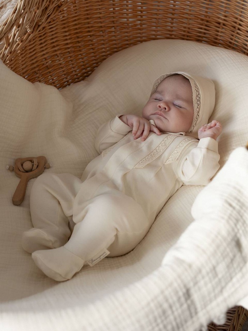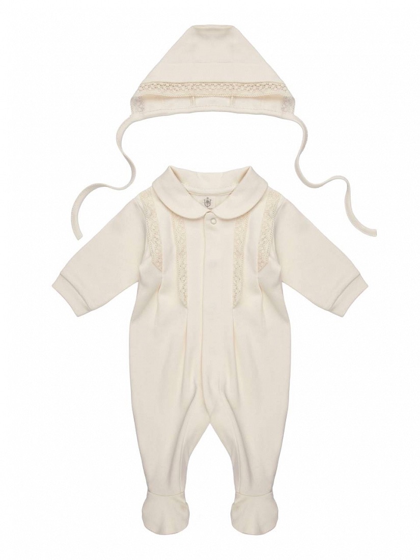 Этот комплект рассчитан на первые недели жизни малыша и подойдёт для выписки. В набор входит комбинезон с закрытыми ножками и чепчик в одном стиле. Оба изделия выполнены из мягкого трикотажа светлого оттенка, который не раздражает кожу и хорошо сидит на ребёнке.