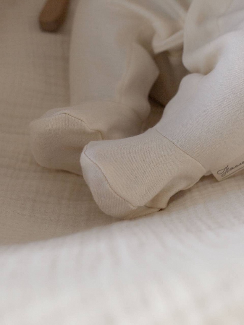 Комбинезон имеет длинный рукав и застёжку по переду, поэтому малыша можно переодеть, не снимая всё полностью. Впереди декоративные вставки и аккуратный воротник — за счёт этого комплект выглядит нарядно. Закрытые ножки заменяют носочки и держат тепло.