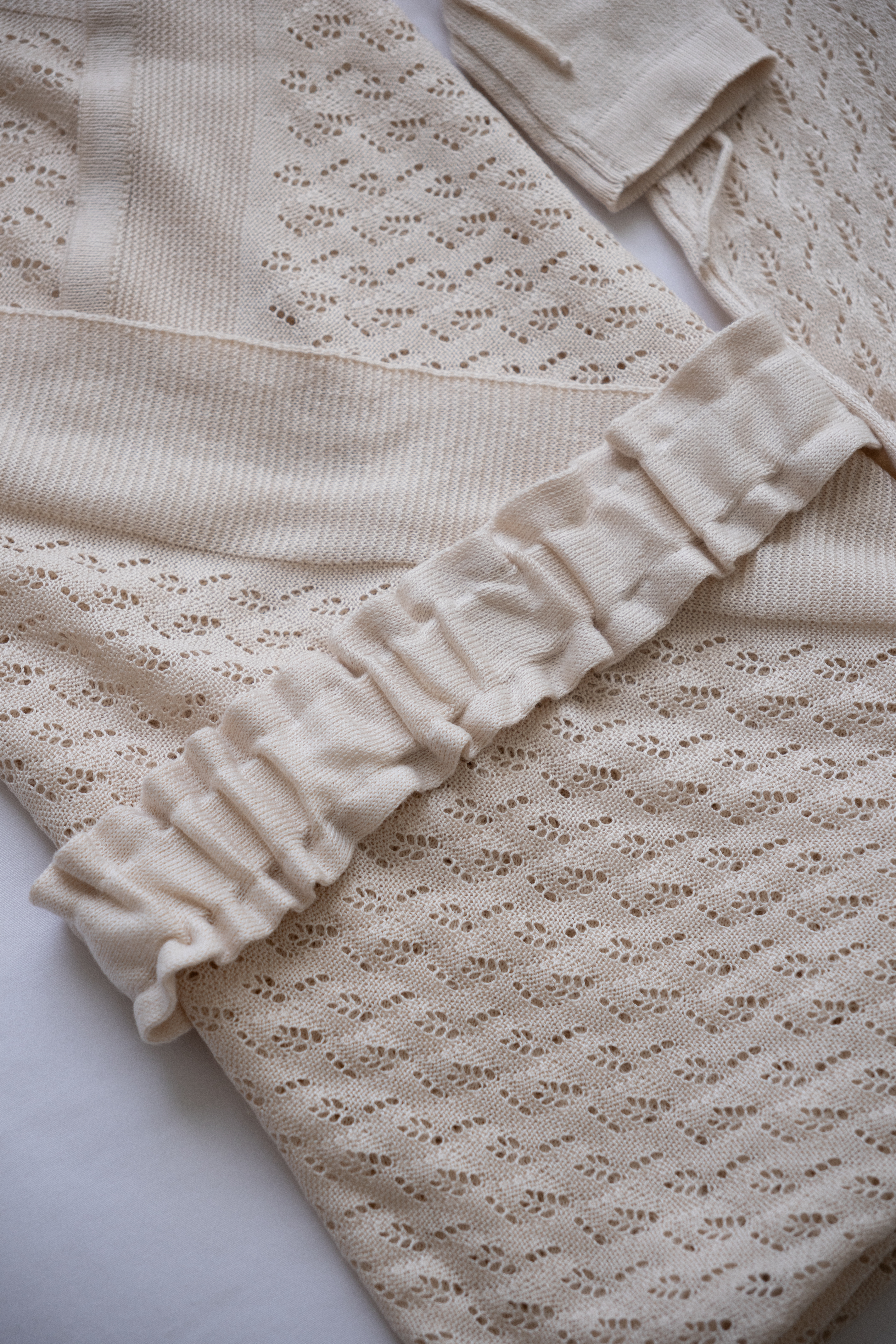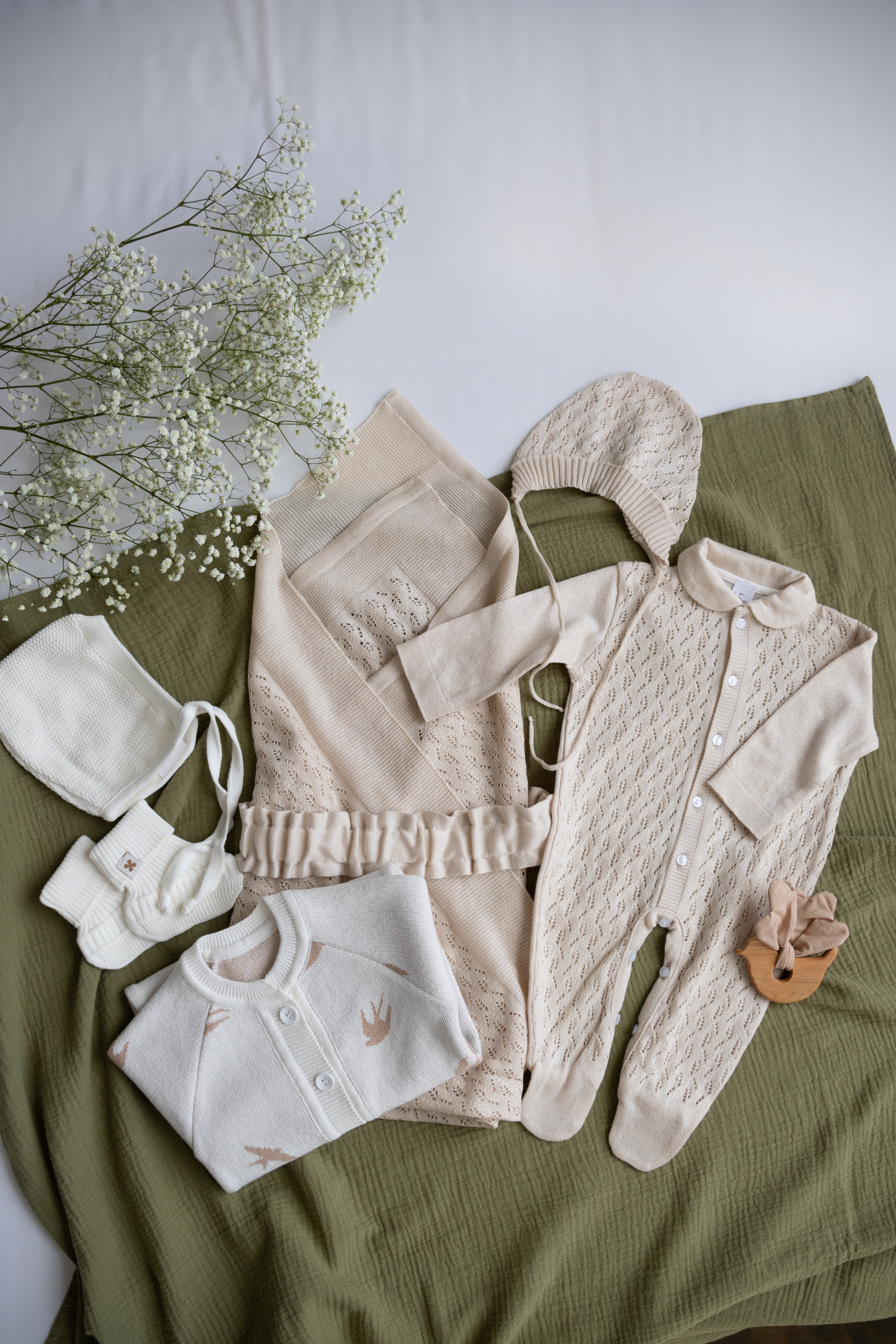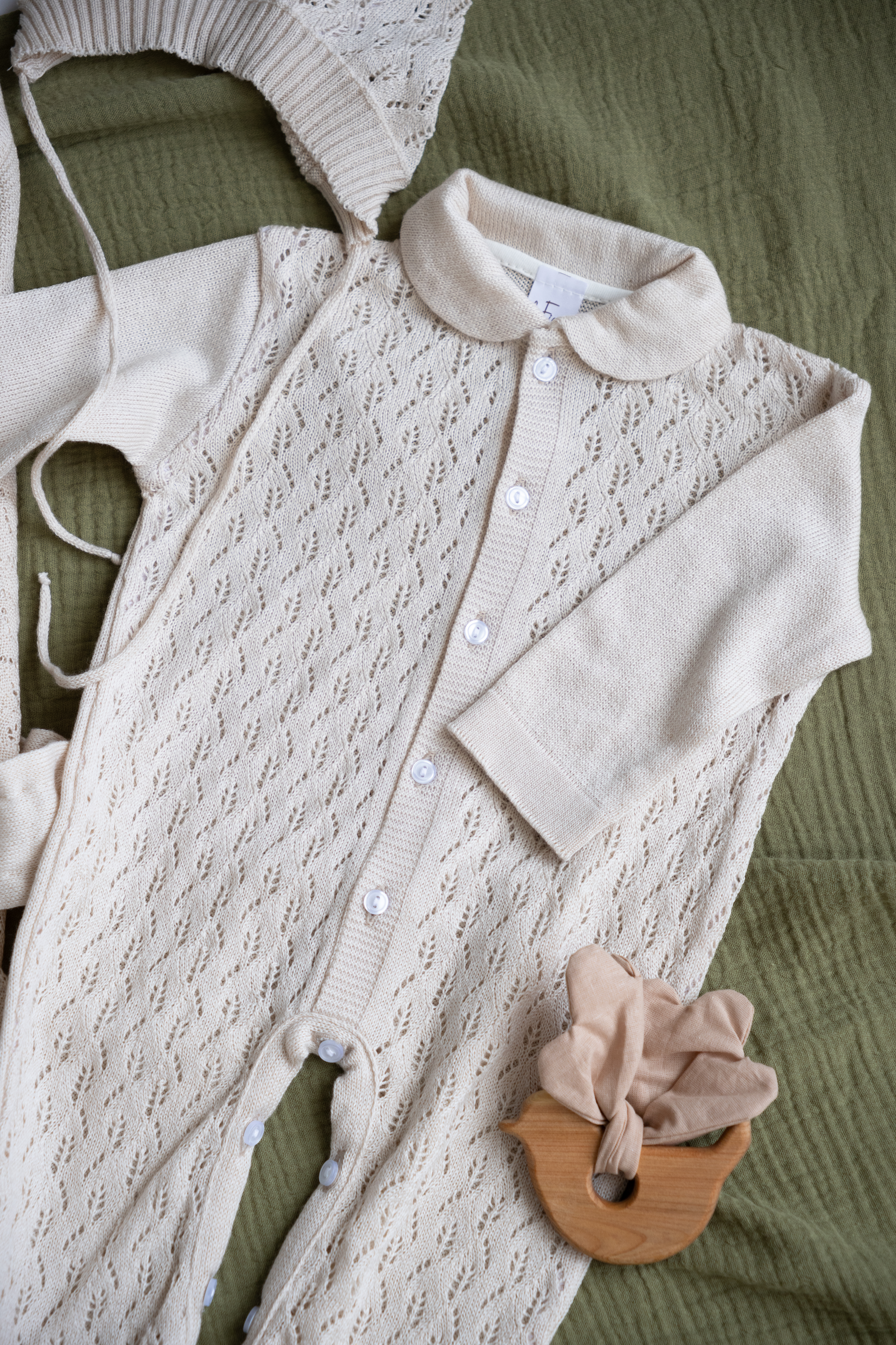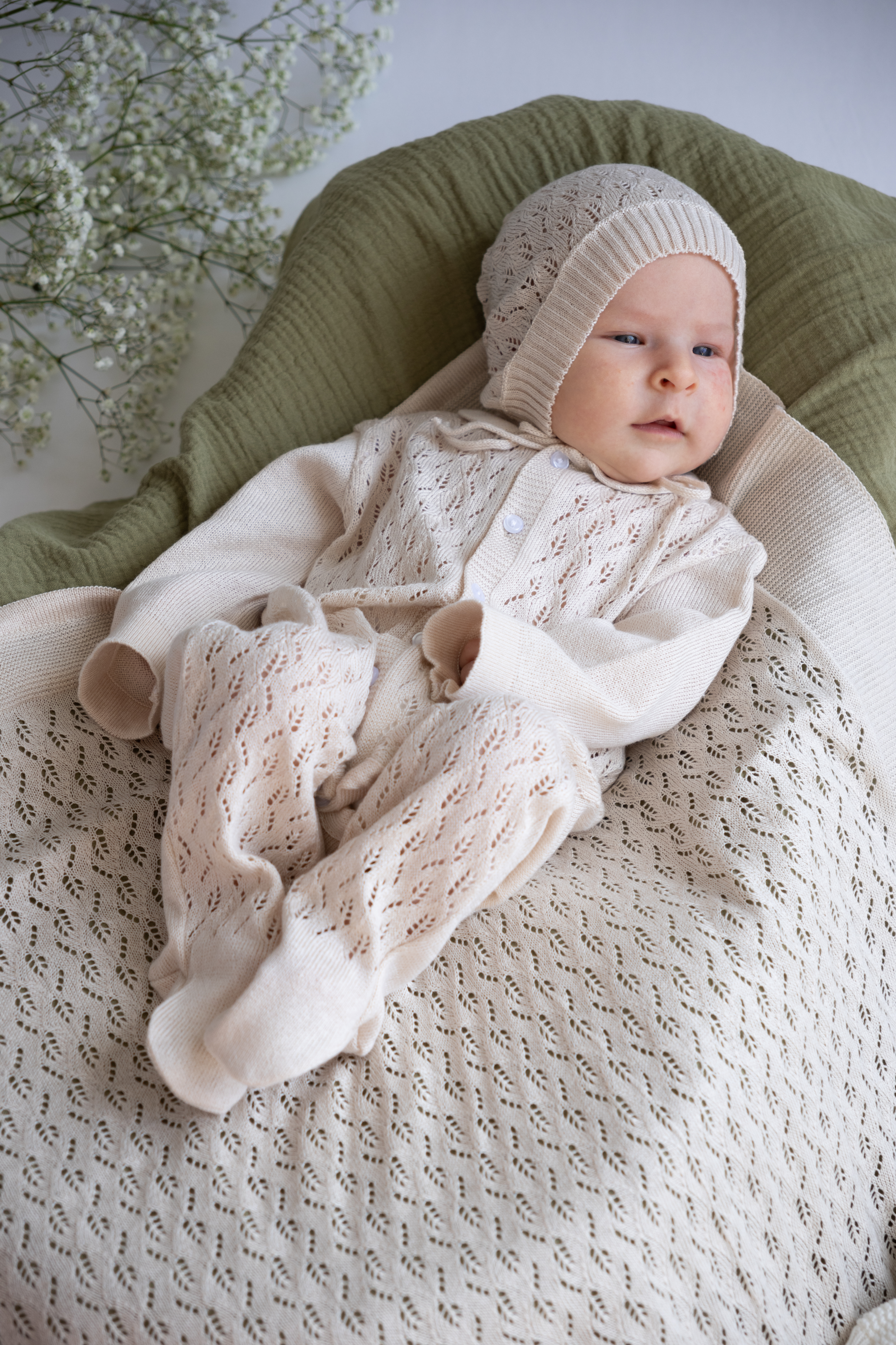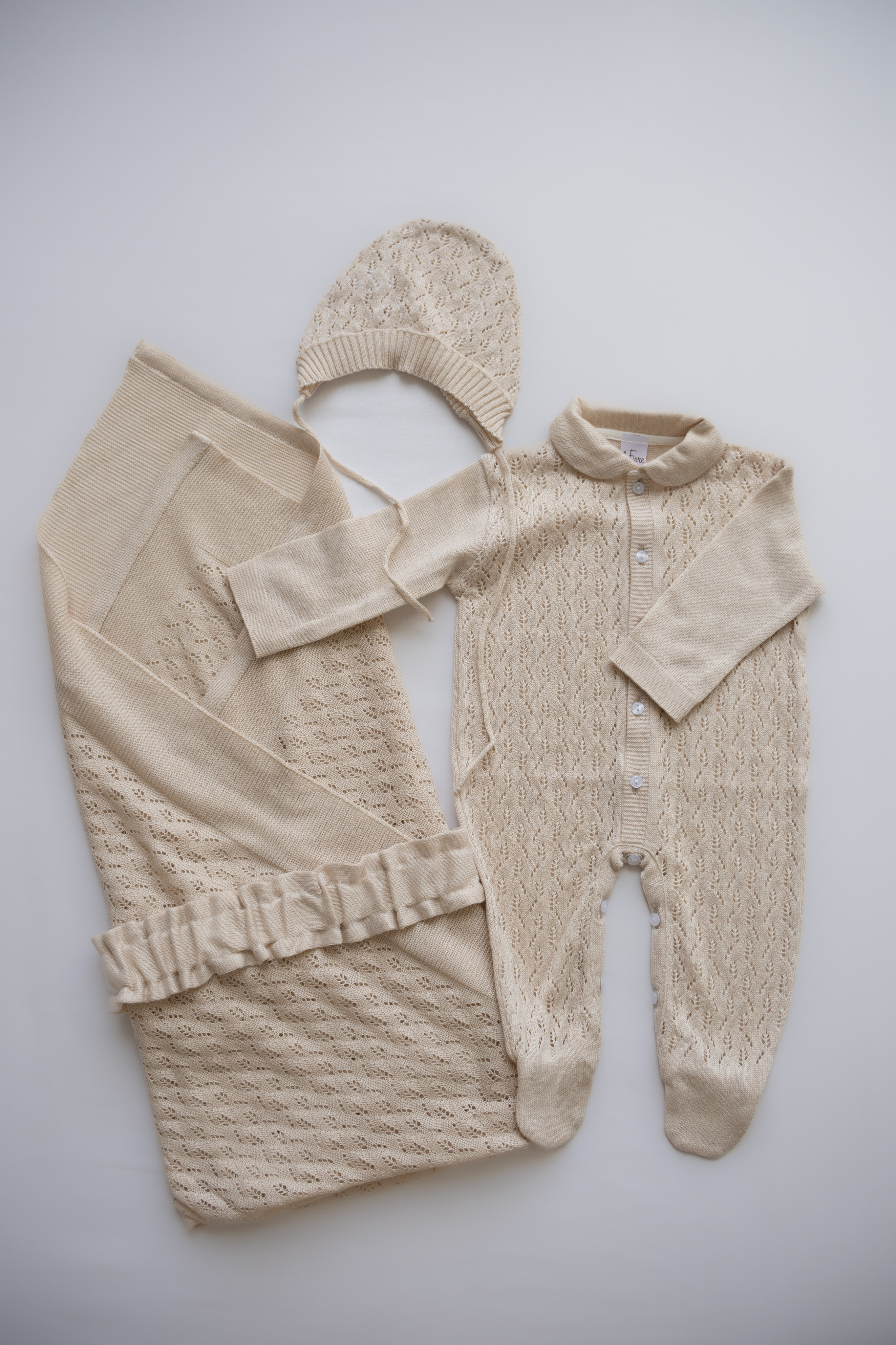 Комплект на выписку для новорожденного — нежный, стильный и очень уютный вариант для первых важных дней малыша. Выполнен в спокойных благородных оттенках из мягкого вязаного полотна с ажурным узором, который придает образу особую воздушность и нарядность. Комплект отлично подойдет для выписки из роддома, первой фотосессии, крестин и других трогательных моментов.