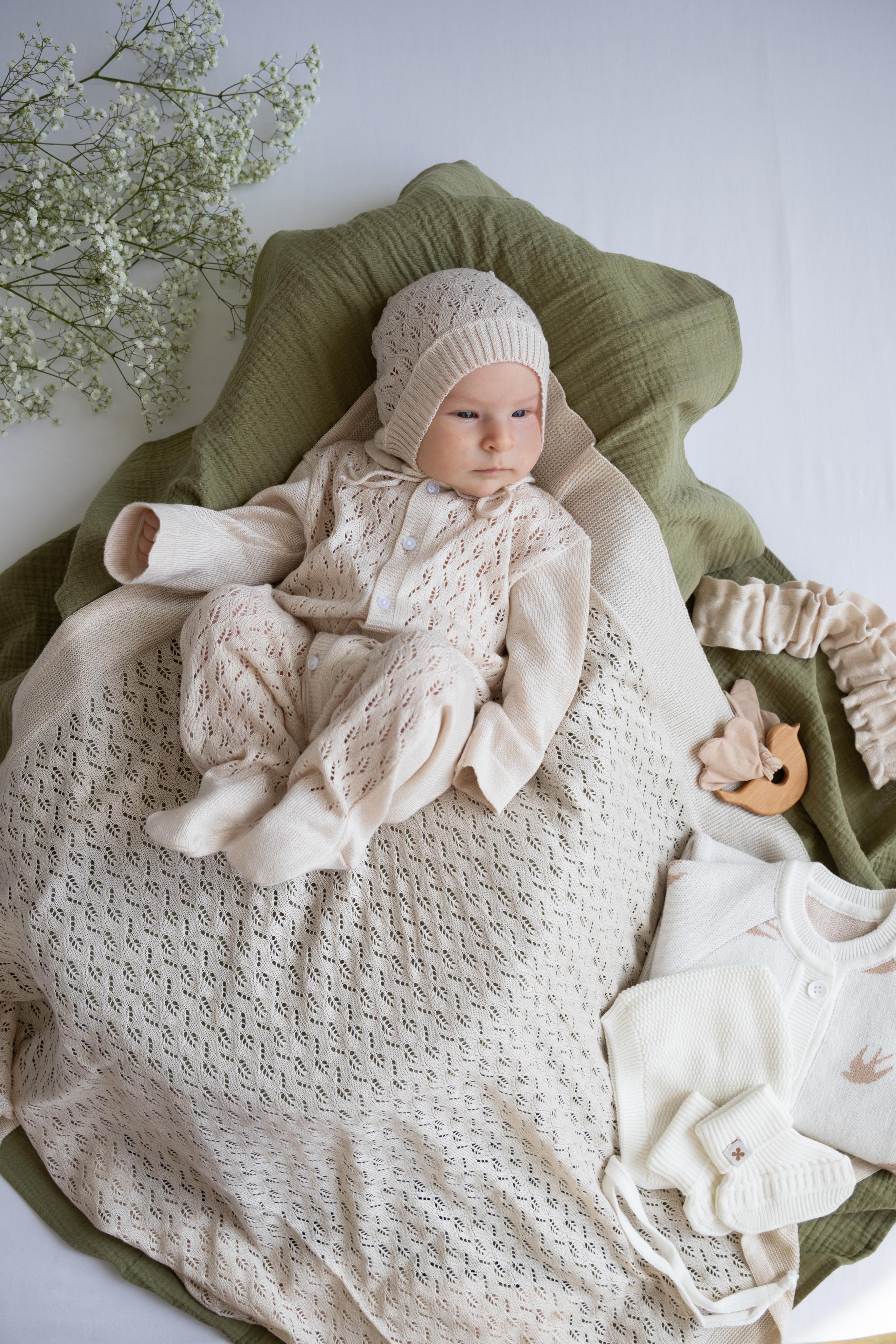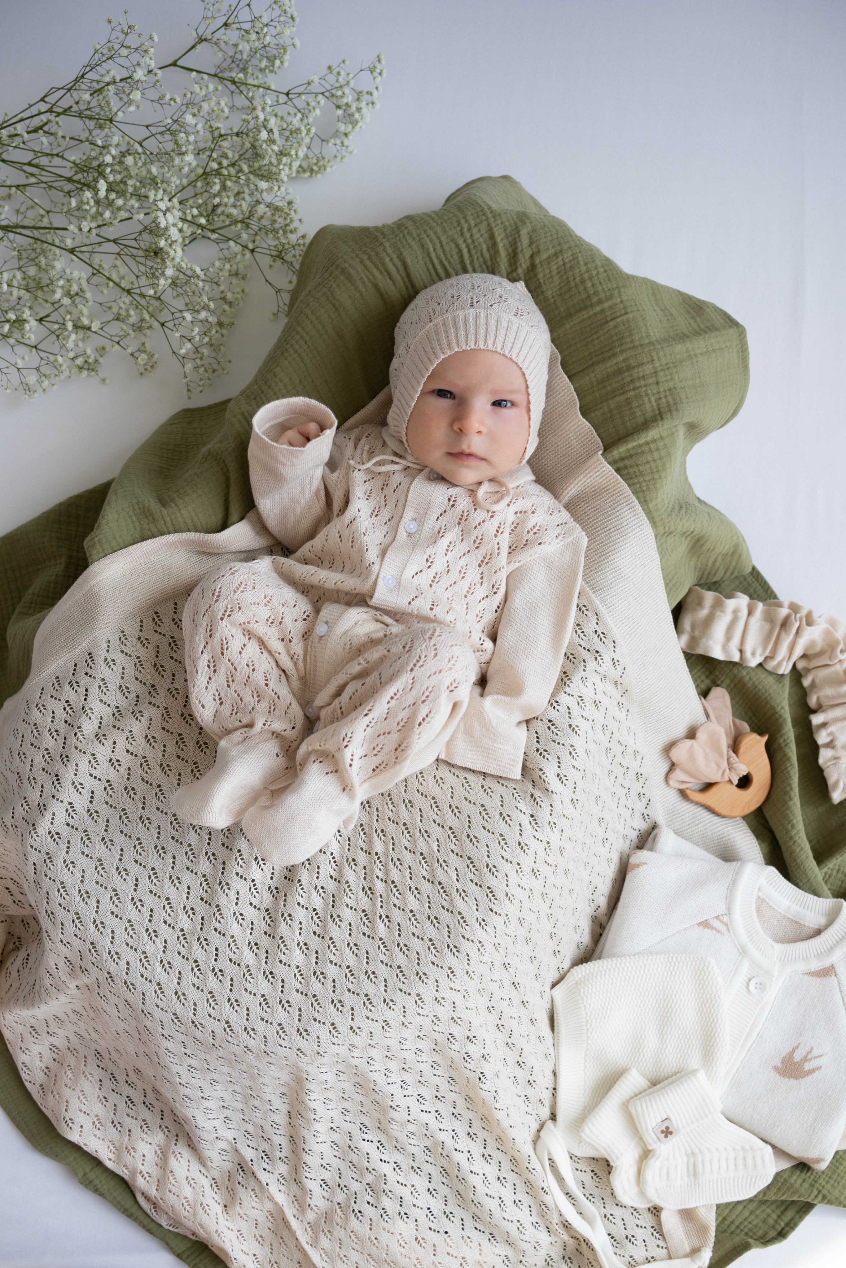 В комплект входит: плед, резинка на плед, слип и чепчик. Все элементы гармонично сочетаются между собой и создают красивый, завершенный образ малыша.