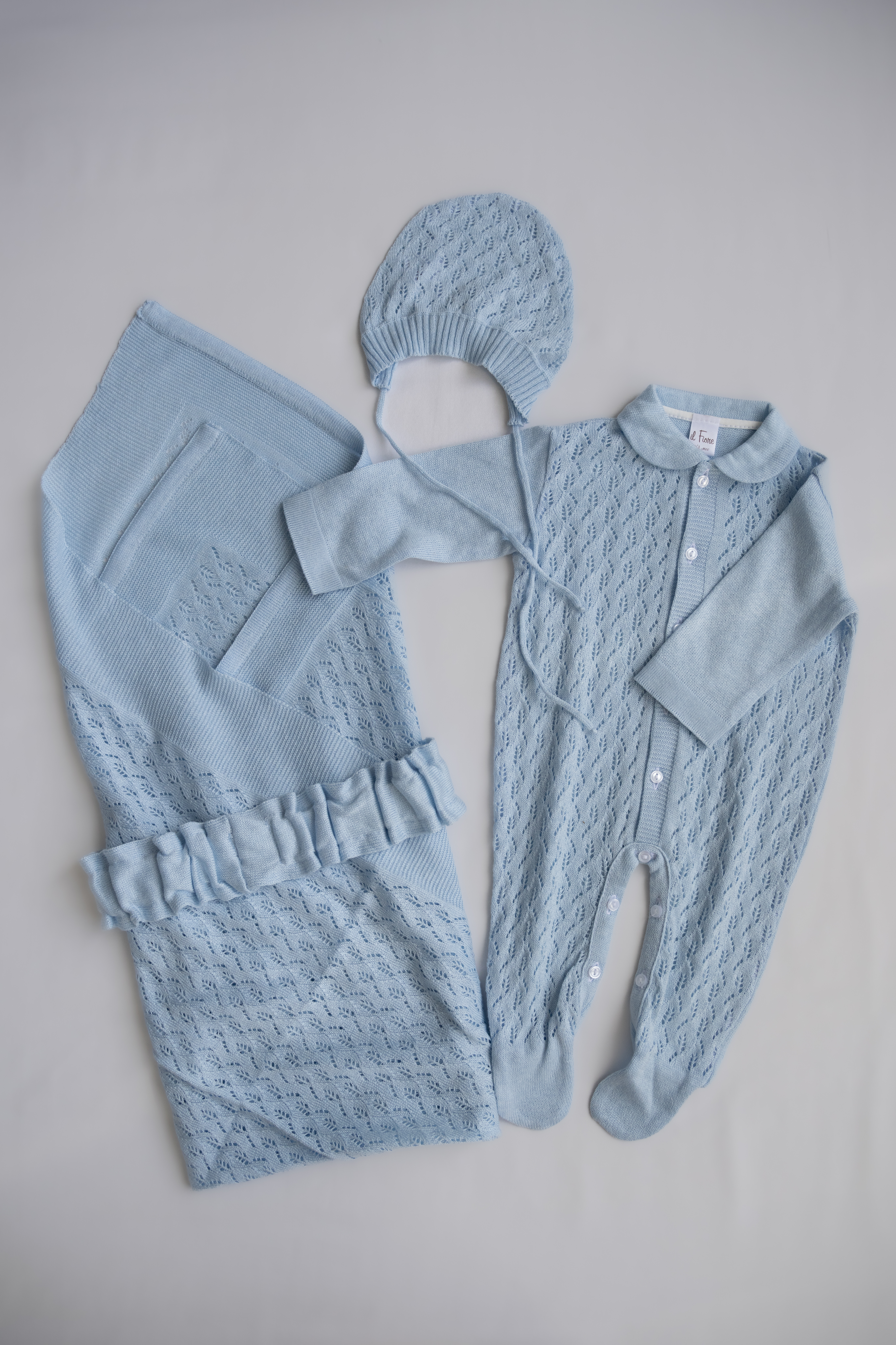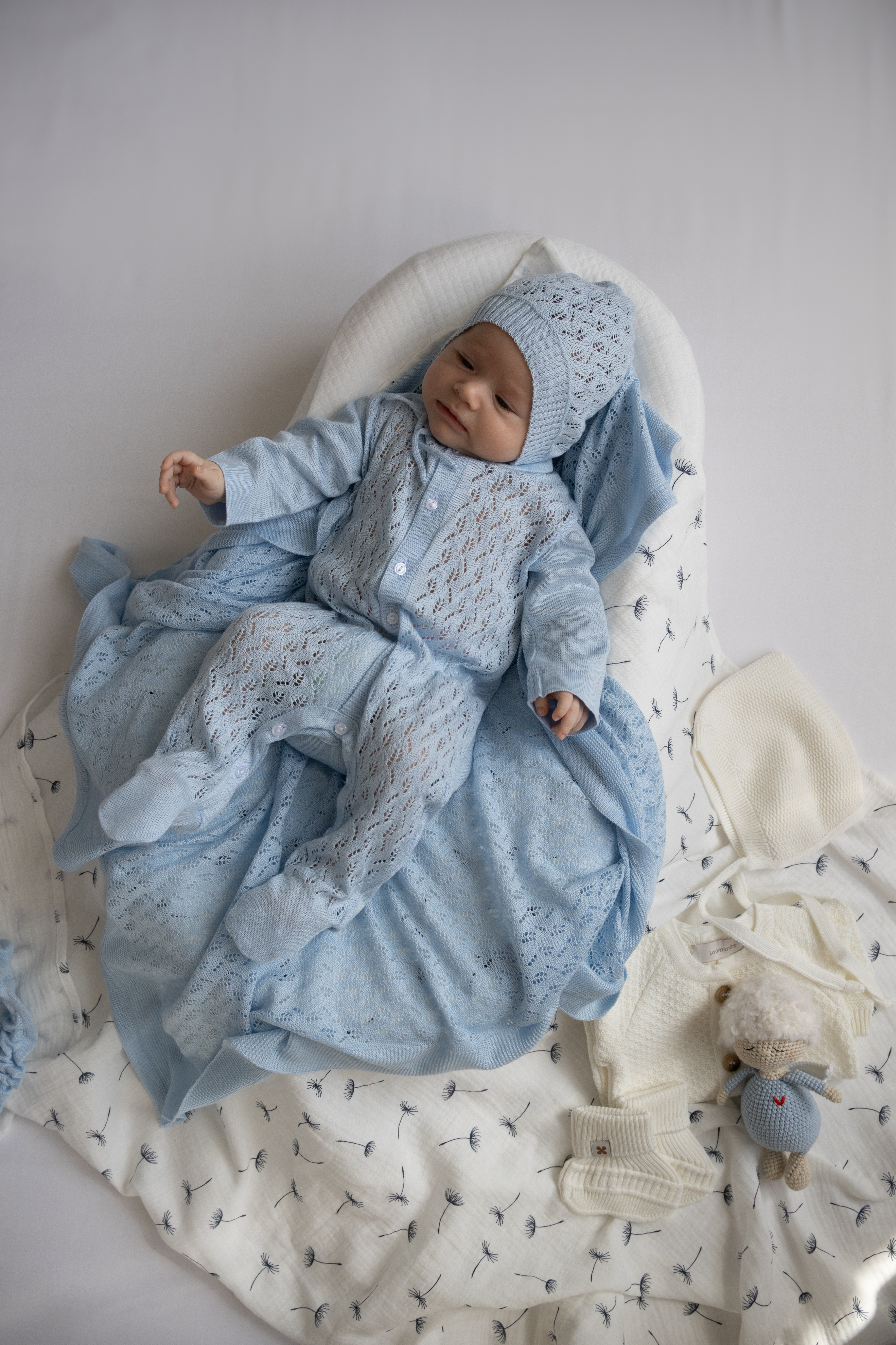 В комплект входит: плед, резинка на плед, слип и чепчик. Все элементы гармонично сочетаются между собой и создают красивый, завершенный образ малыша.