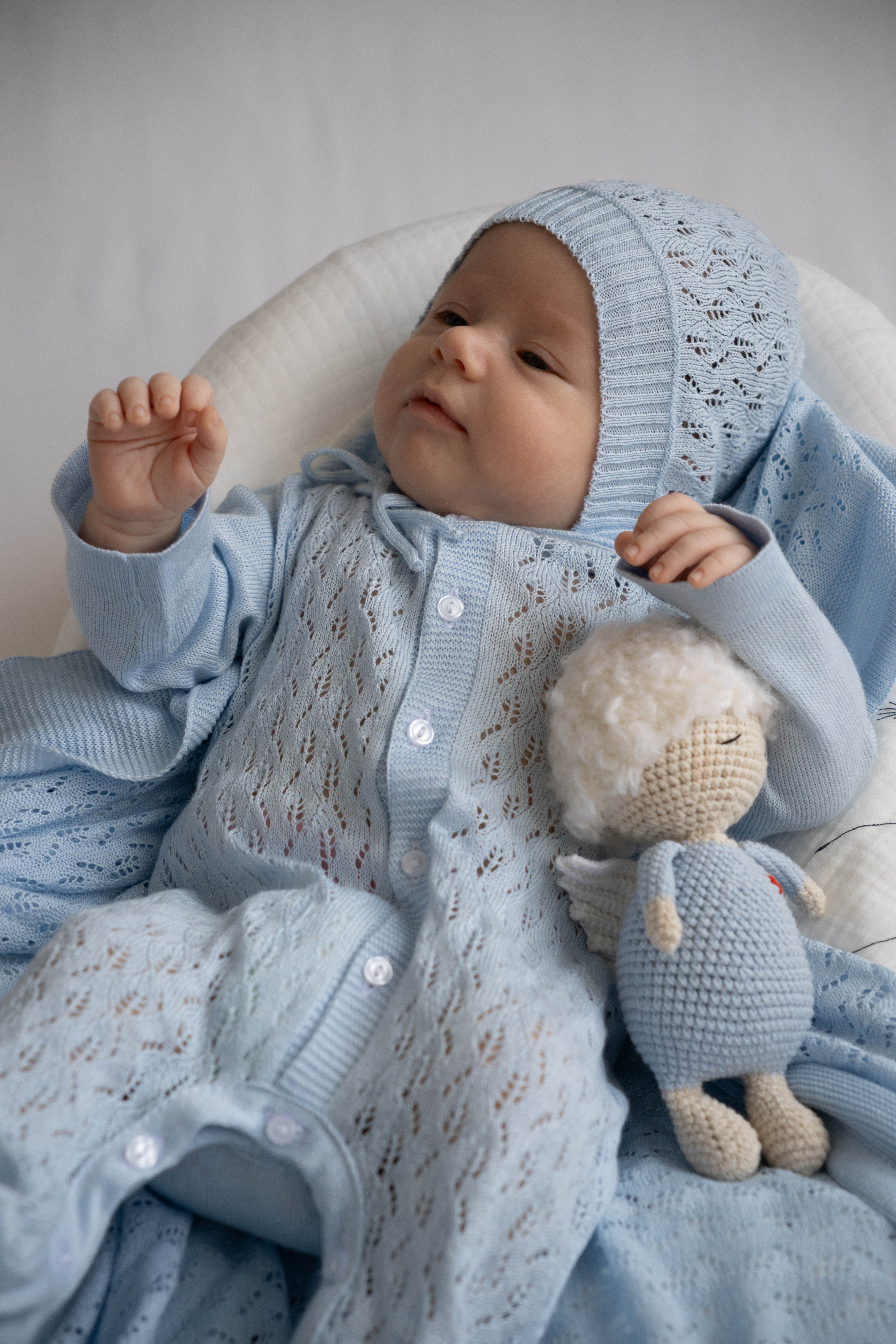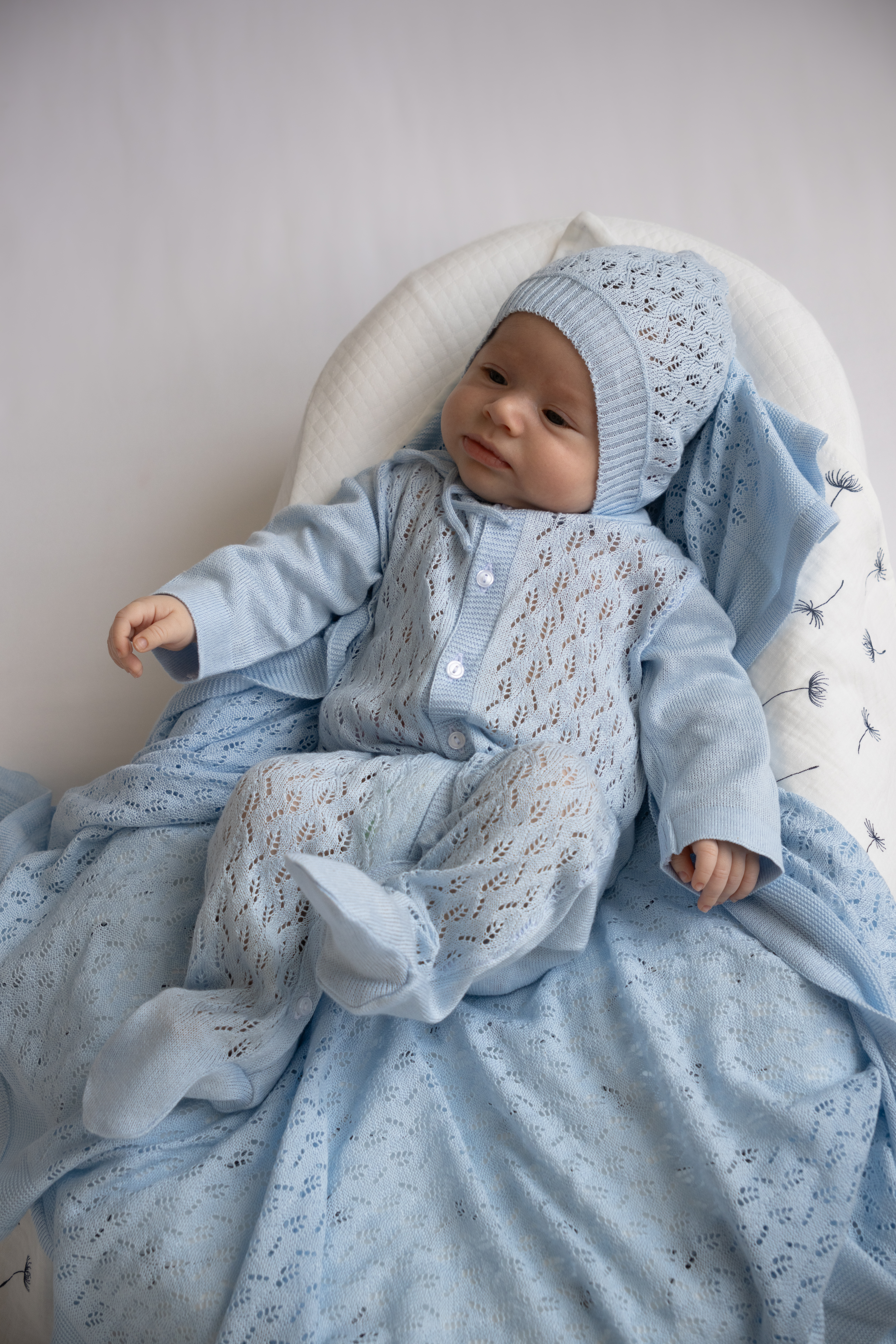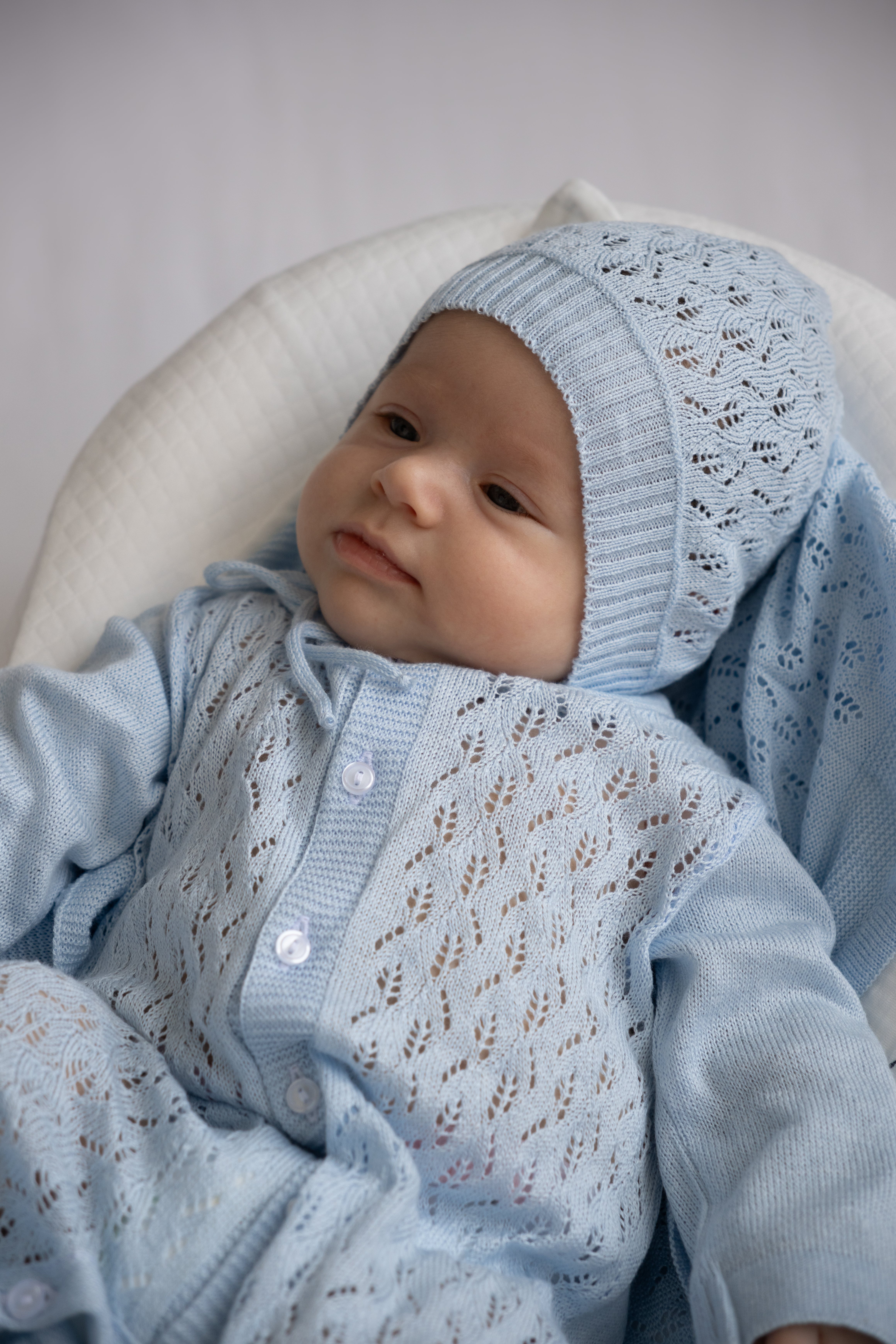 Комплект на выписку для новорожденного — нежный, стильный и очень уютный вариант для первых важных дней малыша. Выполнен в спокойных благородных оттенках из мягкого вязаного полотна с ажурным узором, который придает образу особую воздушность и нарядность. Комплект отлично подойдет для выписки из роддома, первой фотосессии, крестин и других трогательных моментов.