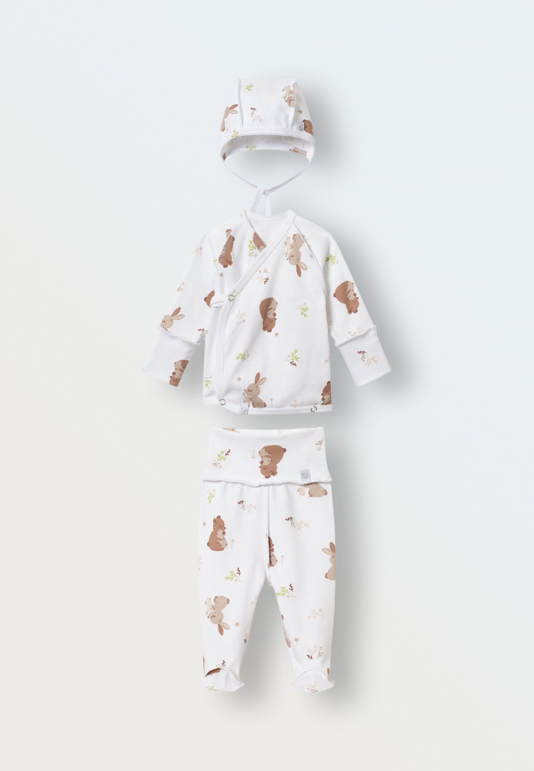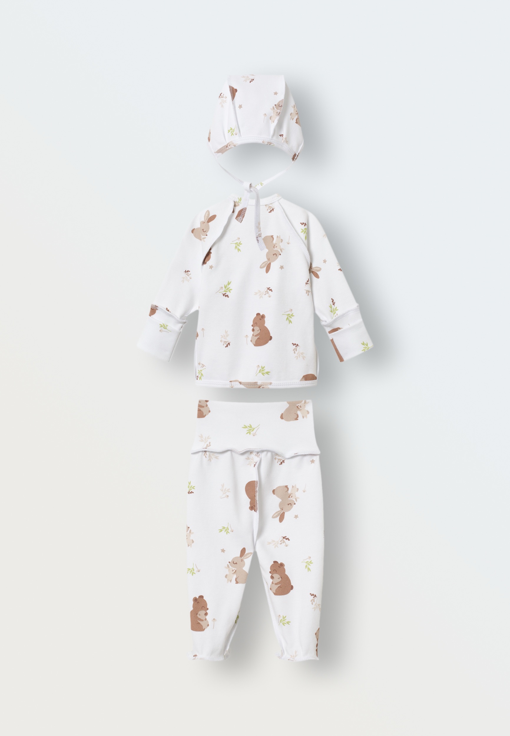 Нежный комплект на выписку для новорожденного. Комплект из распашонки, ползунков и чепчика выполнен из мягкого 100% хлопка, имеющего сертификат OECO-TEX (экологичность производства ткани).