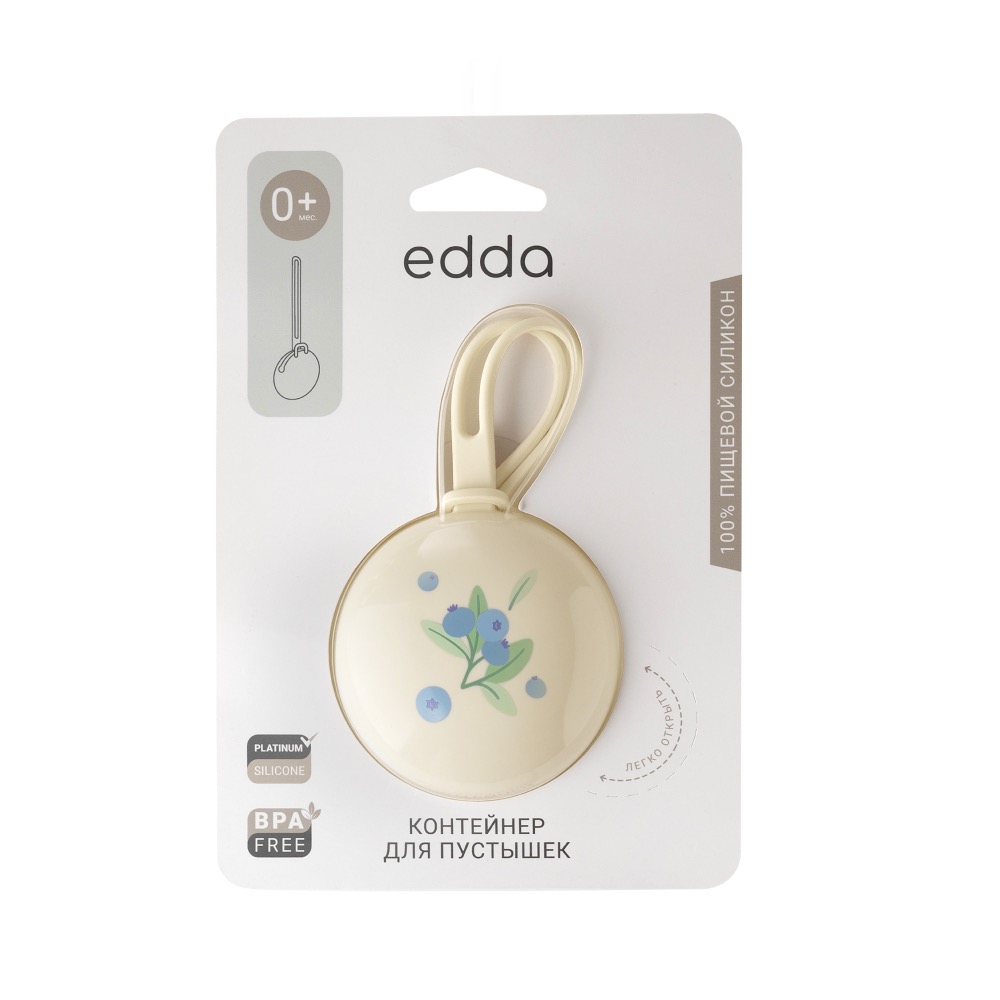 Контейнер для пустышки edda — маленький ритуал чистоты и порядка, который всегда с вами: дома, на прогулке и в дороге. Мягкий премиальный 100% пищевой платиновый силикон (BPA-free) бережно хранит до двух пустышек, защищая их от загрязнений, а кармашек с фиксатором надёжно закрывается и предотвращает выпадение.