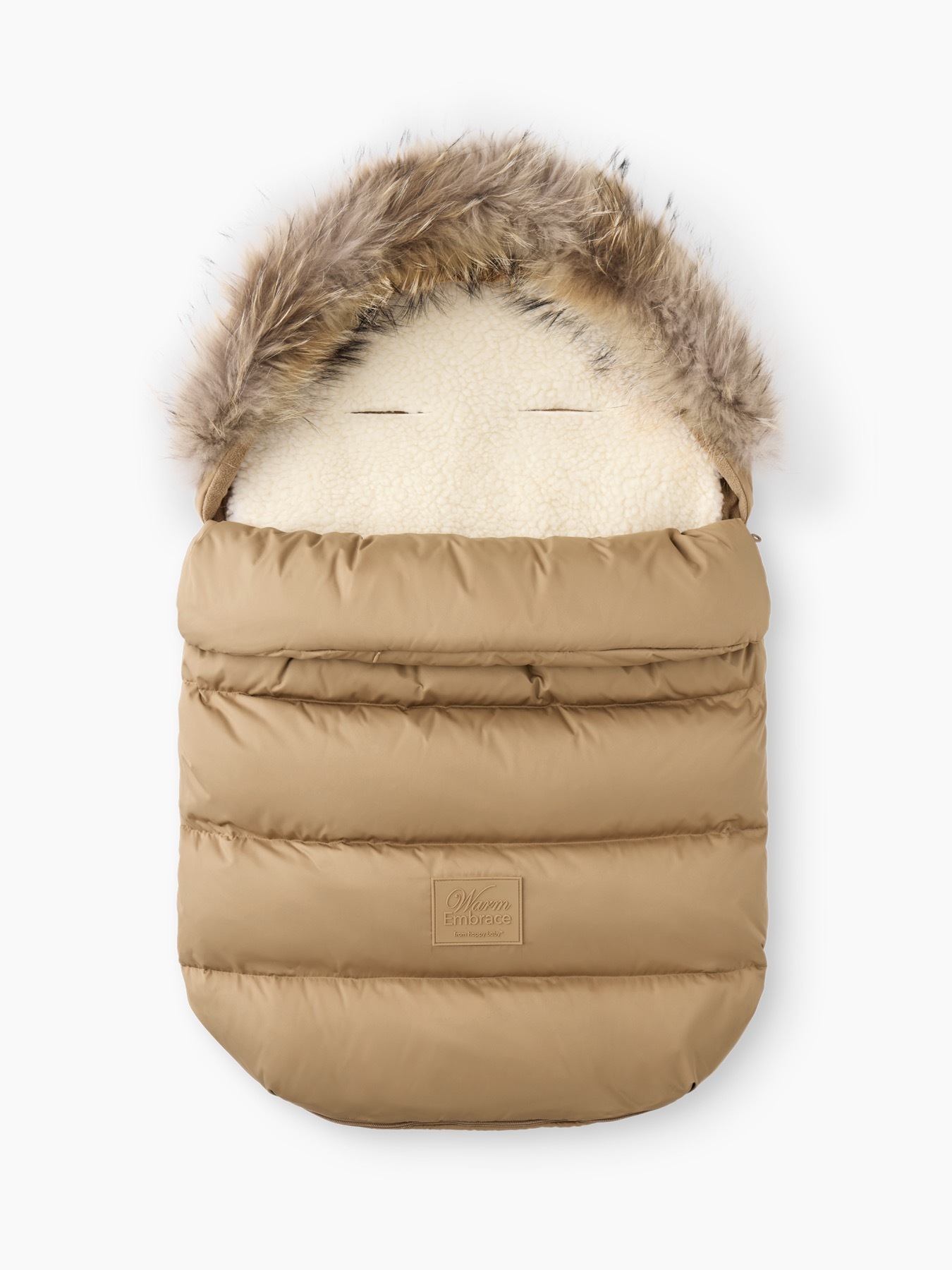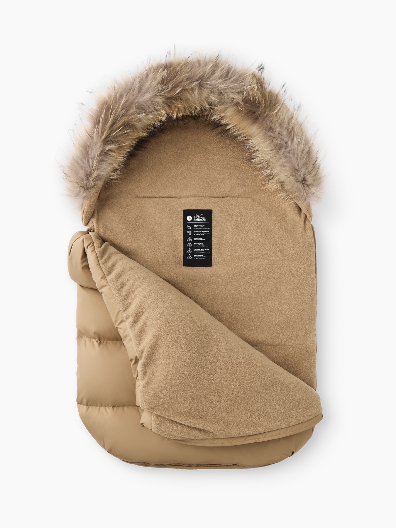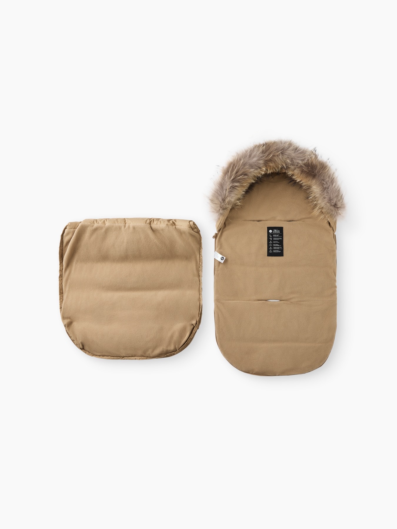 - Съёмный меховой вкладыш — регулирует уровень утепления: добавьте его в мороз или уберите в более тёплую погоду. Вкладыш универсален и подходит для использования в коляске, санях и автокресле.
