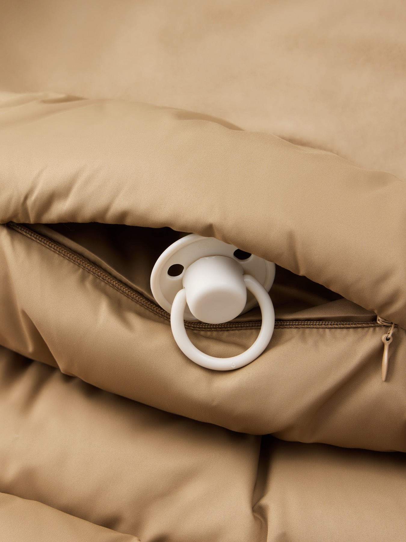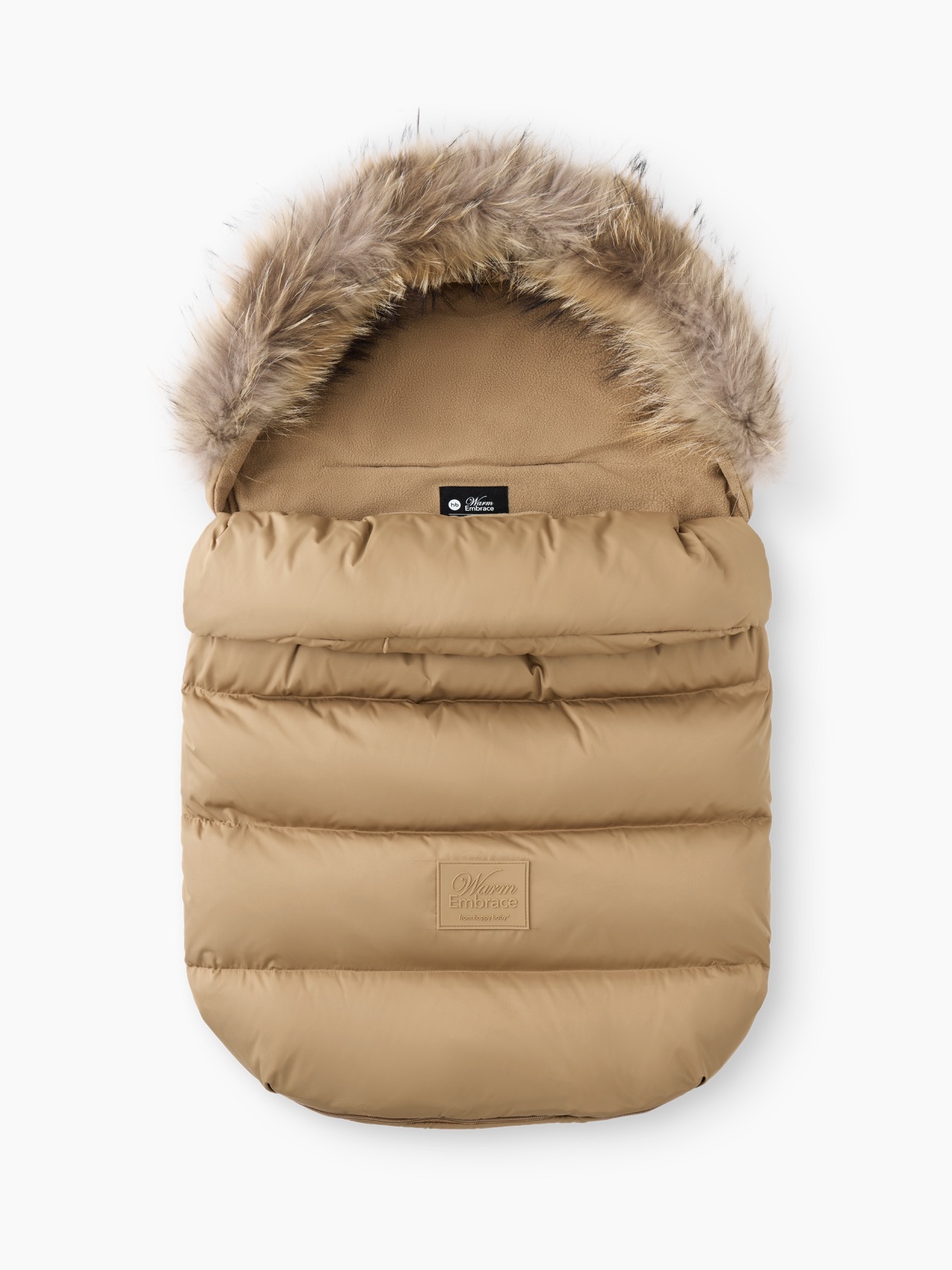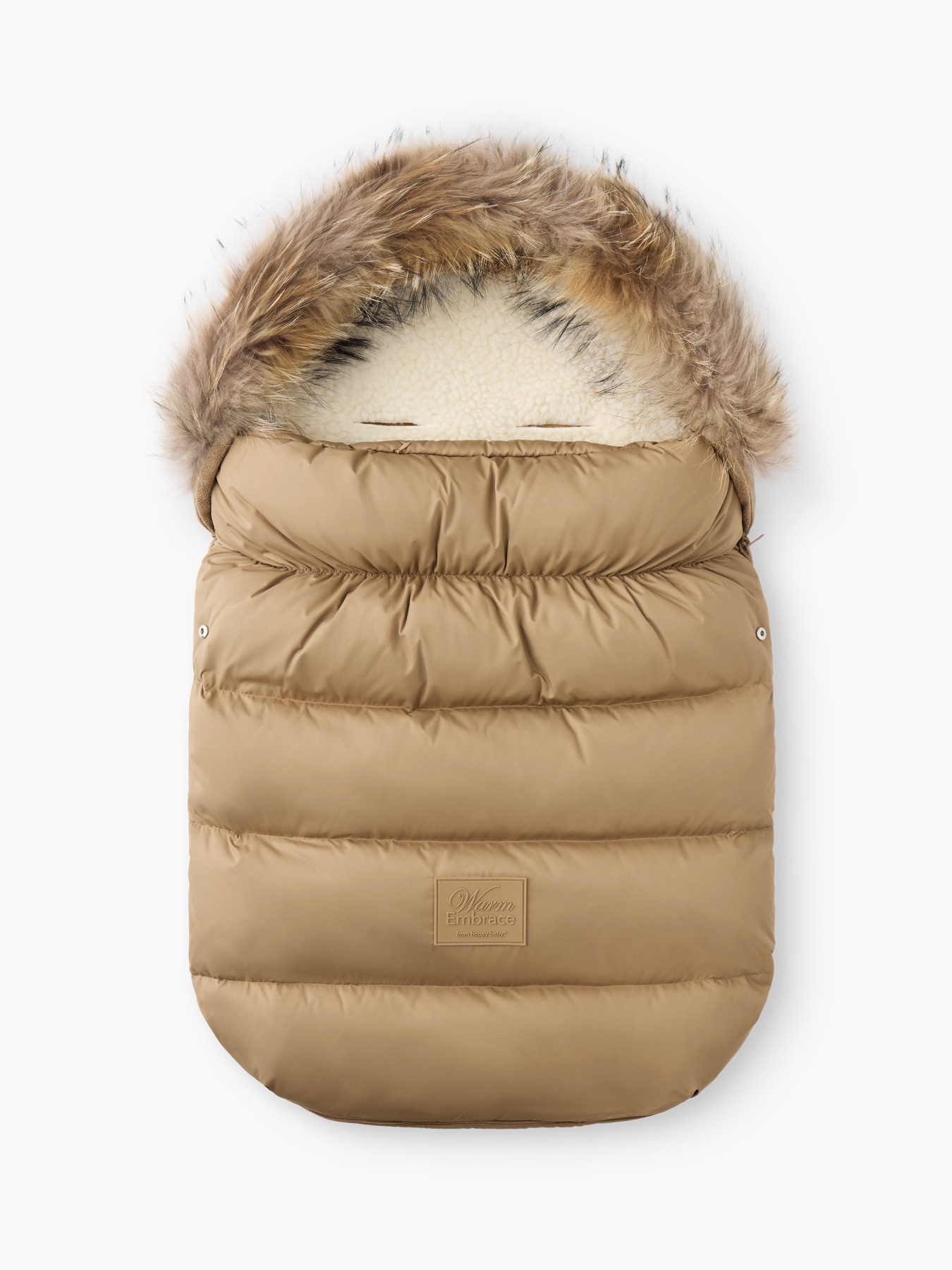 - Съёмный меховой вкладыш — регулирует уровень утепления: добавьте его в мороз или уберите в более тёплую погоду. Вкладыш универсален и подходит для использования в коляске, санях и автокресле.